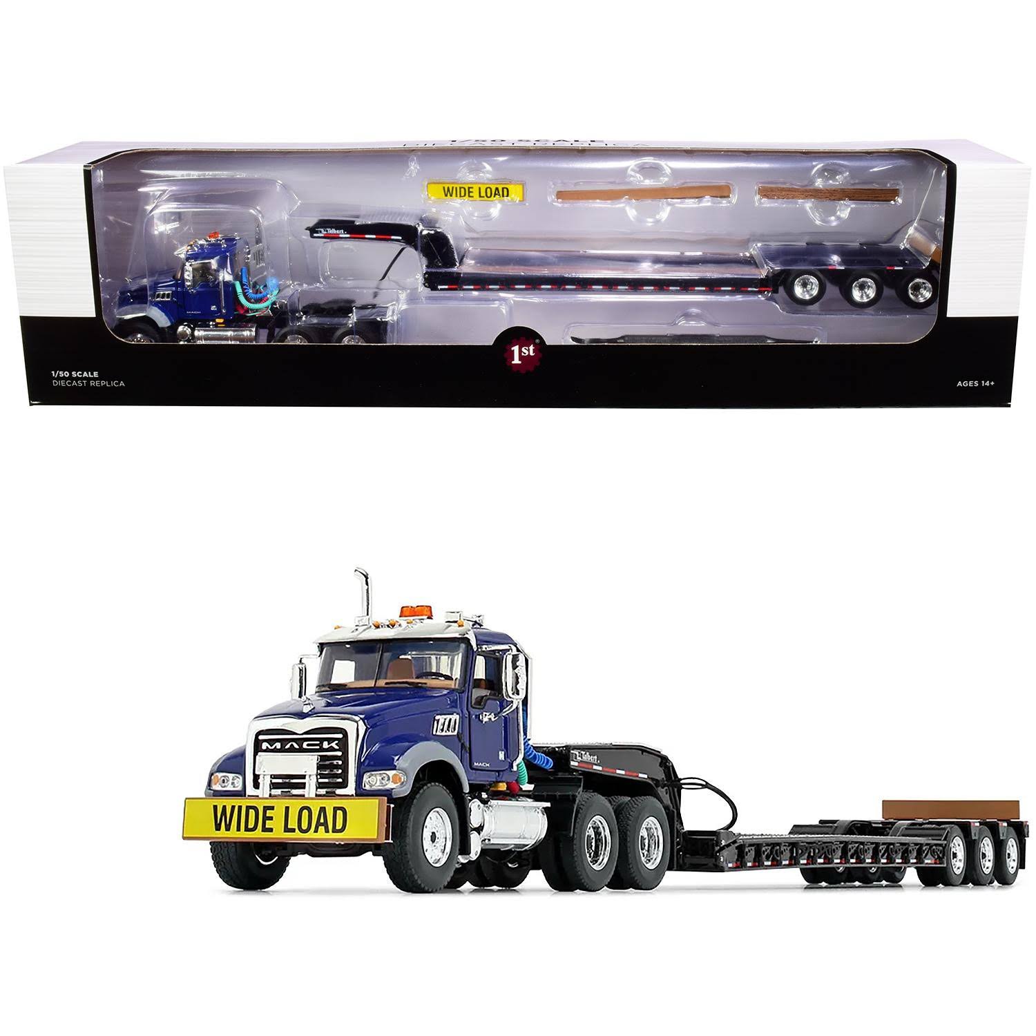 Mack Granite Mp Tandem-Axle Day Cab with Talbert Tri-Axle Lowboy Trailer Mack Blue and Black 1/50 Diecast Model by First Gear - Megean