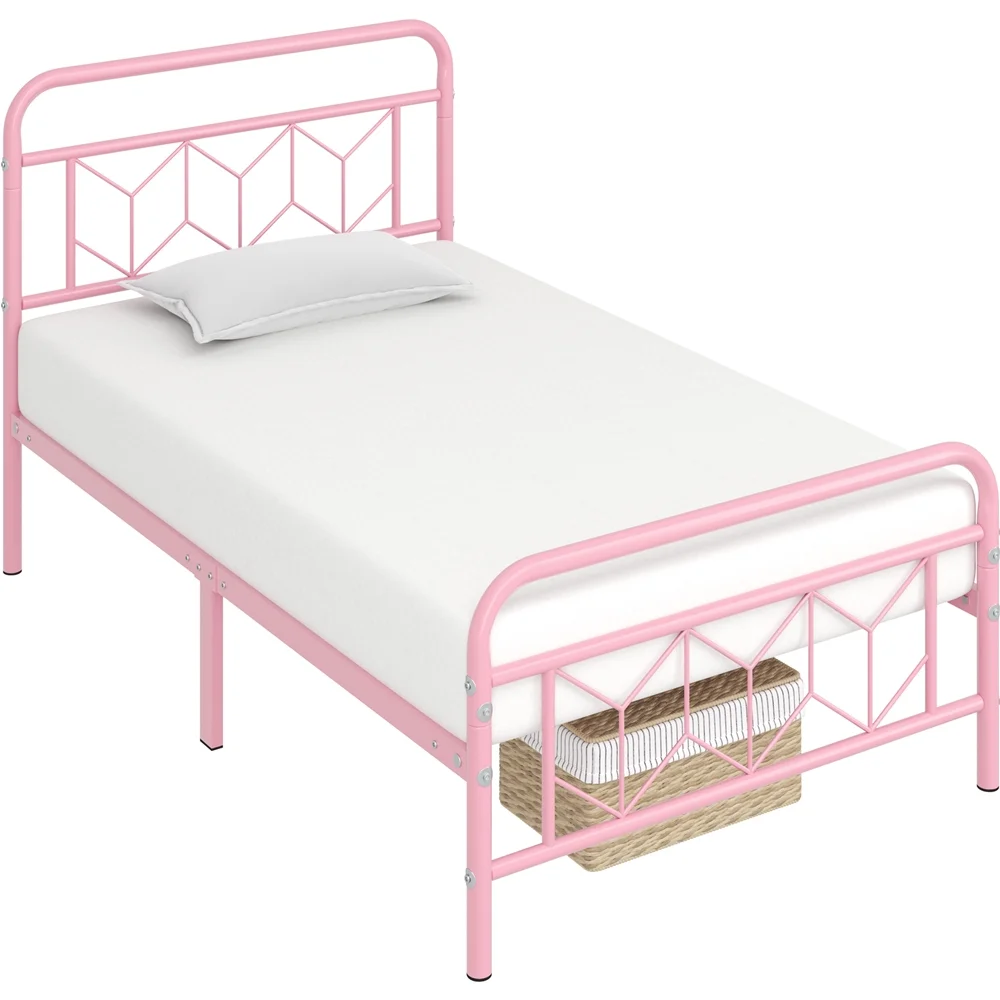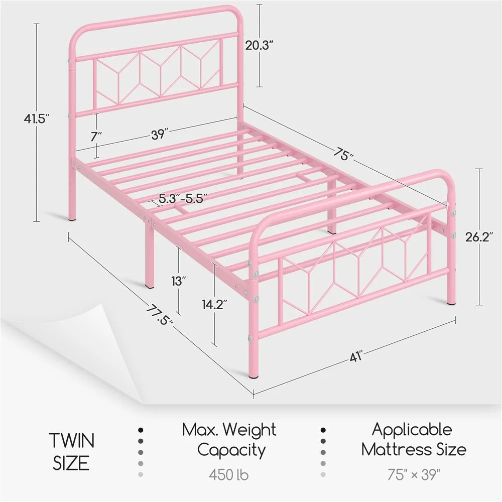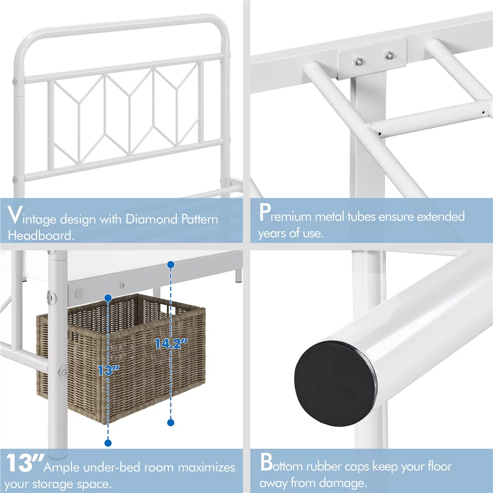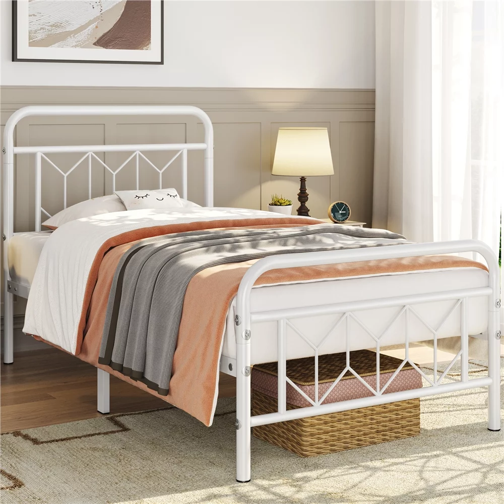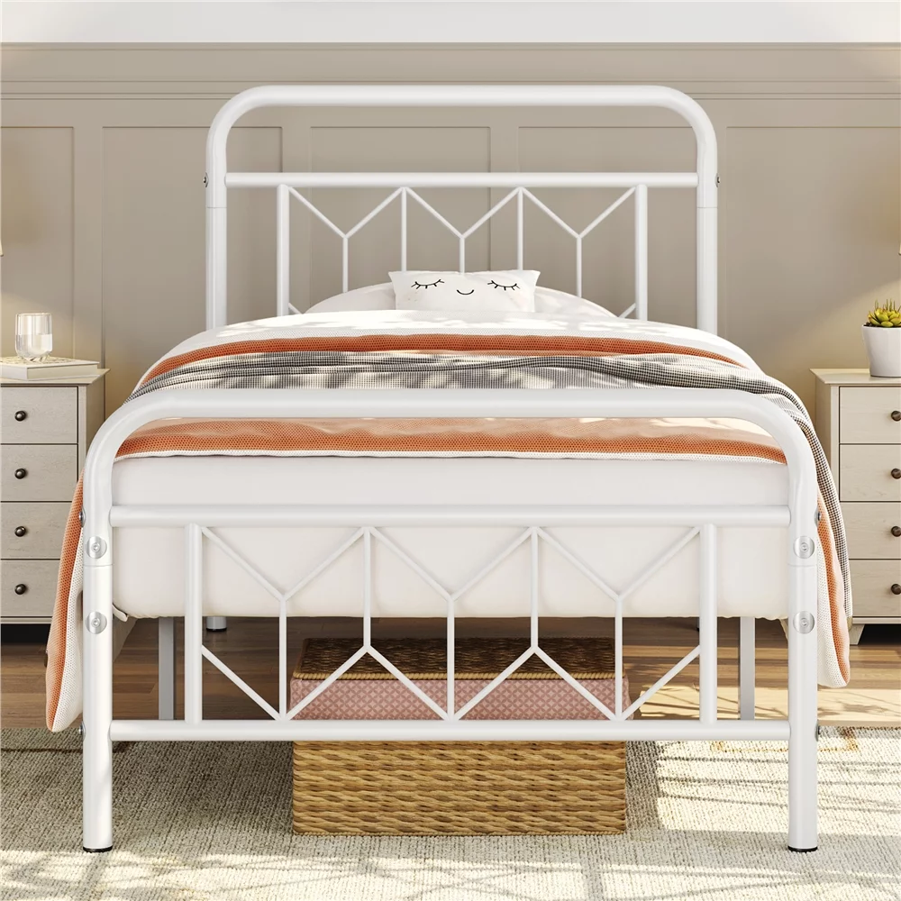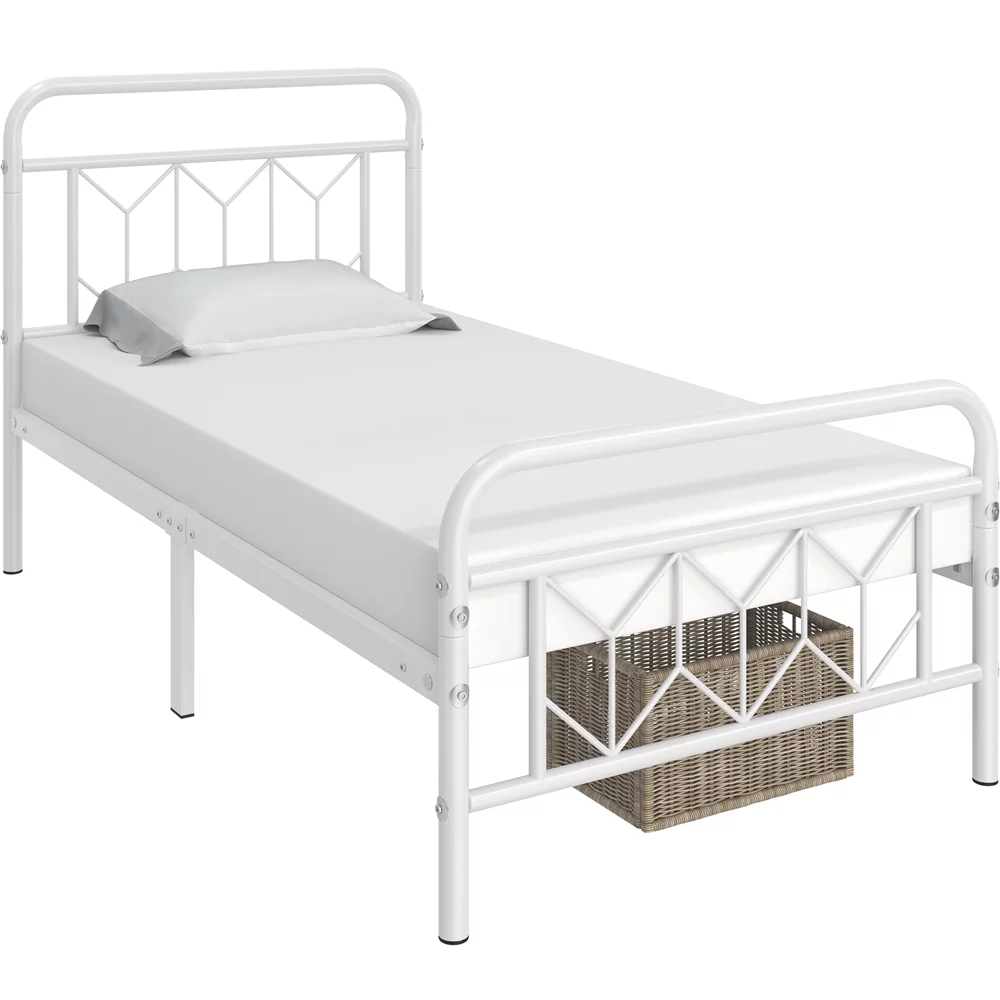 Sha Cerlin White Twin Size Metal Platform Bed Frame with Victorian Vintage Headboard