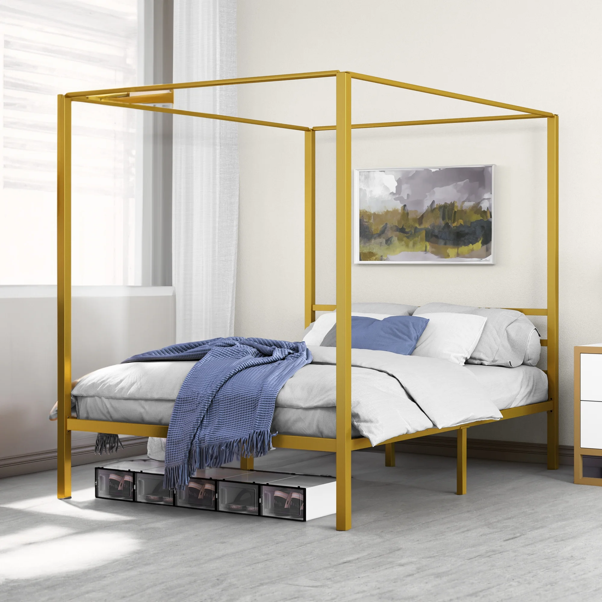 Dextrus Metal Poster Canopy Bed Frame 14 inch Platform with Built-in Headboard, Gold, Queen Size