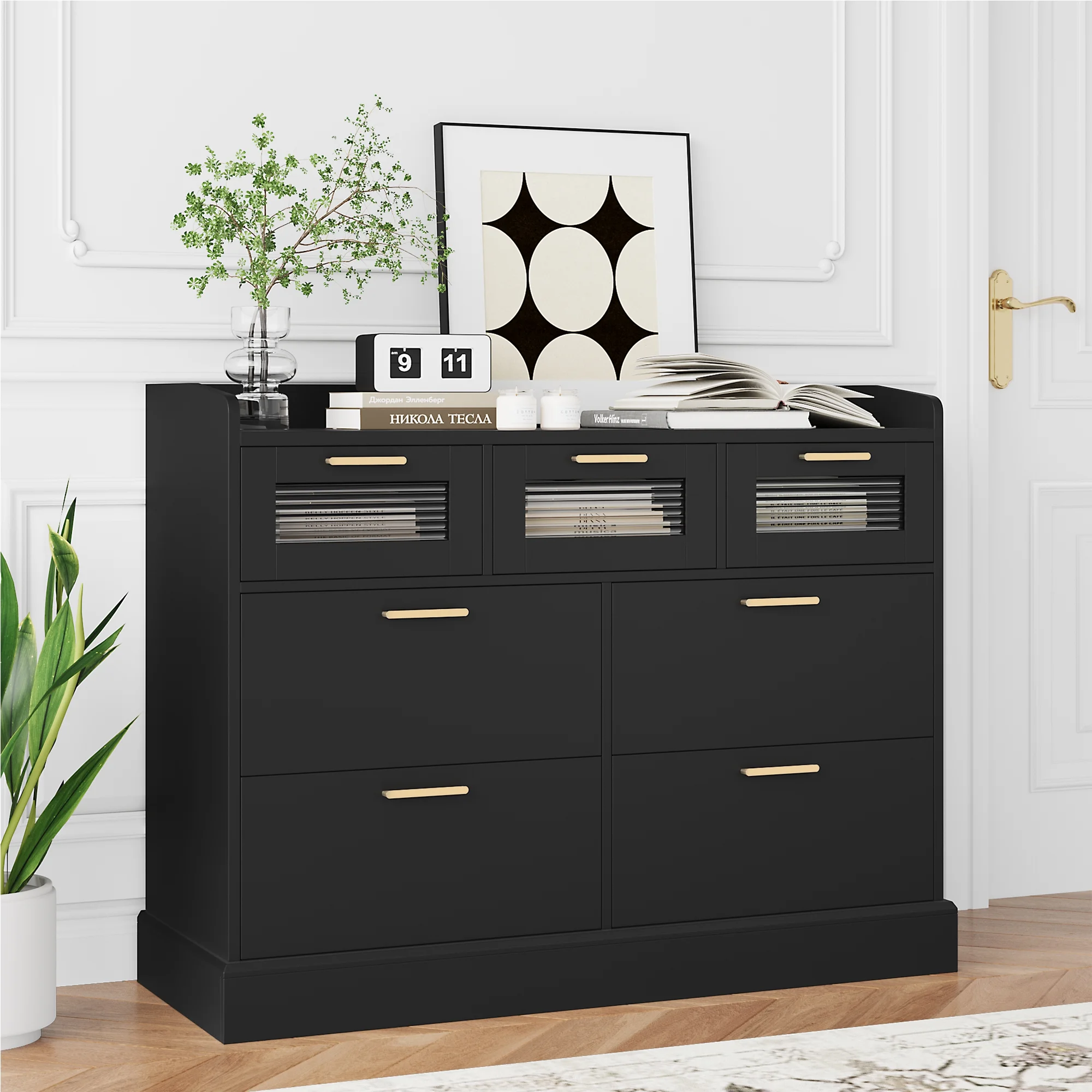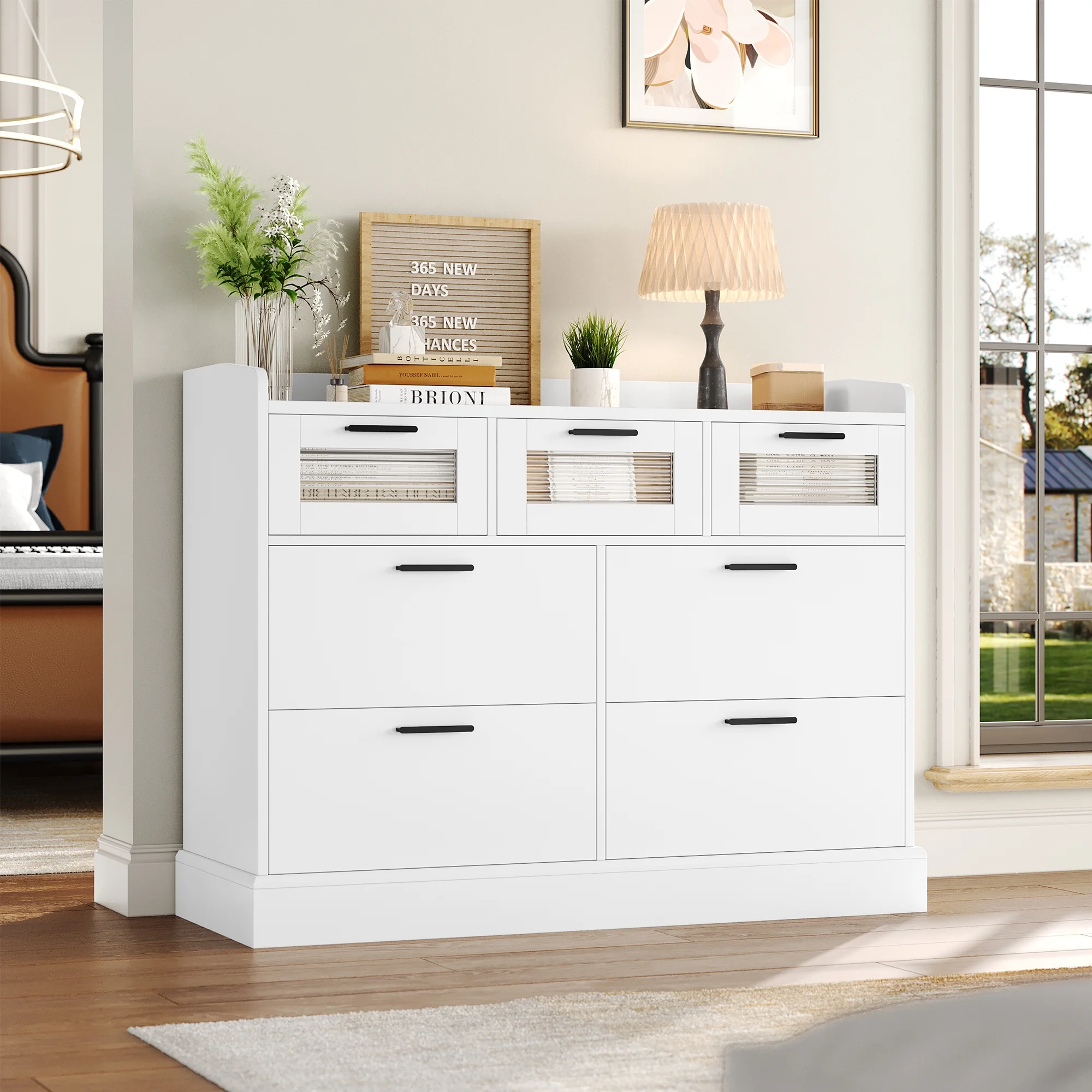Homfa 7 Drawer White Dresser for Bedroom, Glass Panel Wood Storage Cabinet for Living Room Dining Room