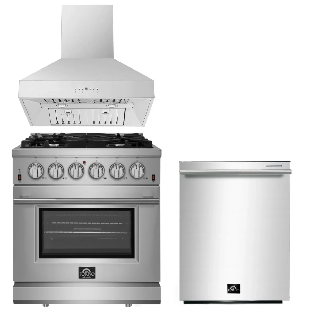 Forno Appliance Package - 30 Inch Gas Range, Wall Mount Range Hood, Dishwasher, AP-FFSGS6239-30-W-2
