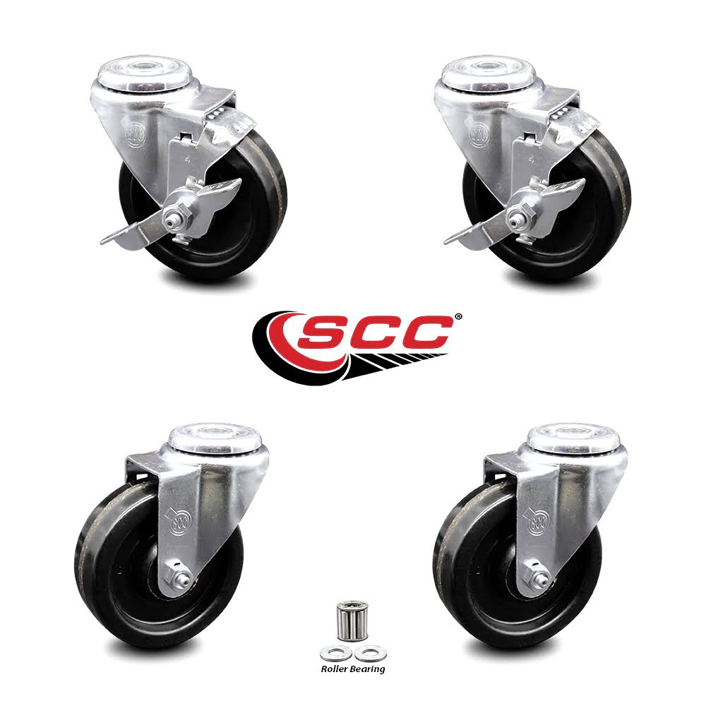 Phenolic Swivel Bolt Hole Caster Set of 4 w/Roller Bearing - 4 inch x 1.25 inch Black Wheels - Includes 2 with Top Locking Brake - Megean