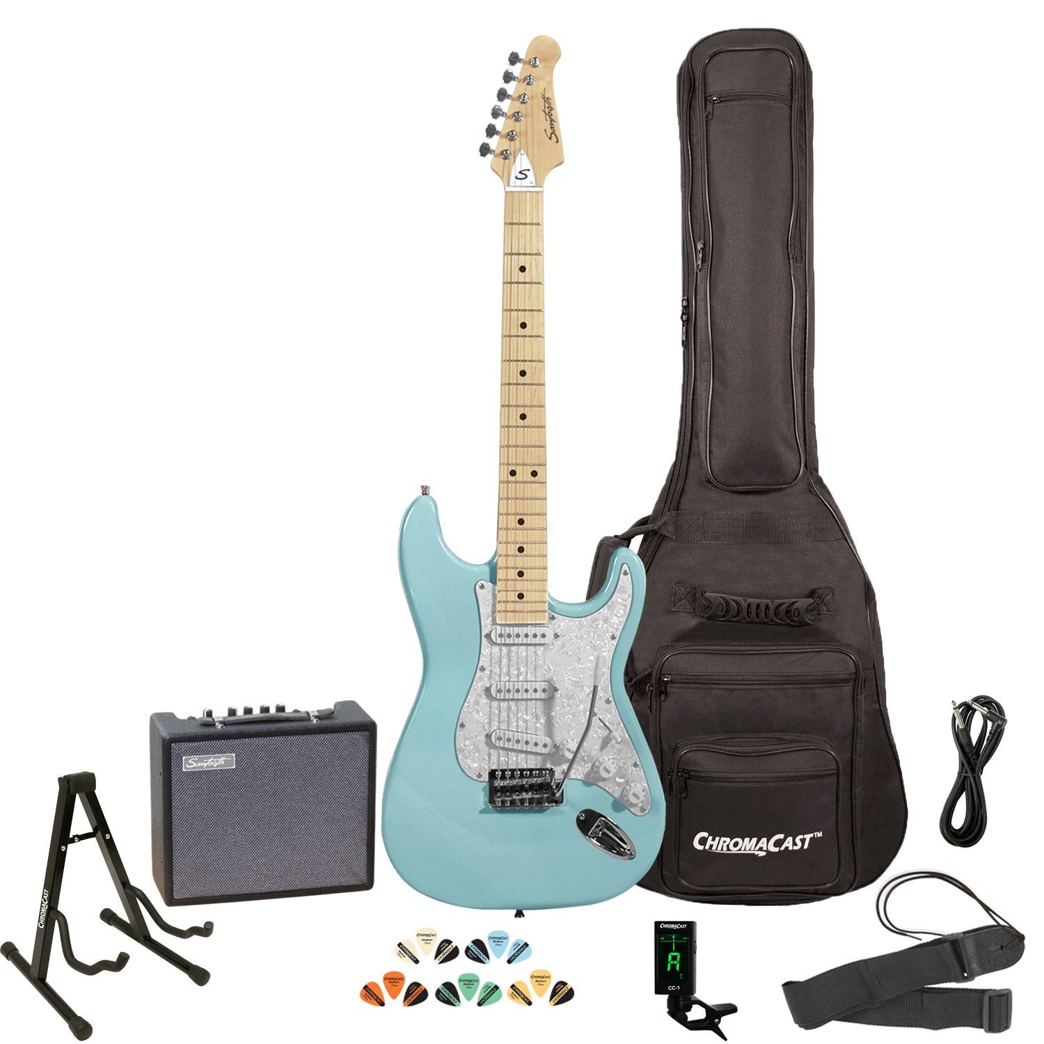 Sawtooth ST-ES-DBLP-KIT-3 Daphne Blue Electric Guitar with Pearl White Pickguard - Includes Accessories, Amp, Gig Bag and Online Lesson - Megean