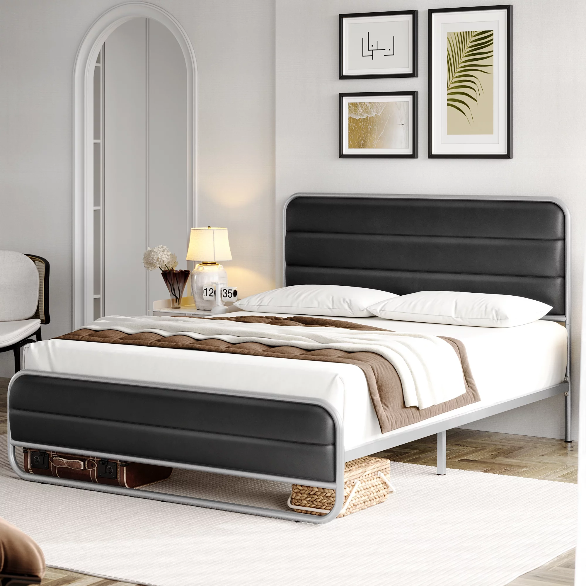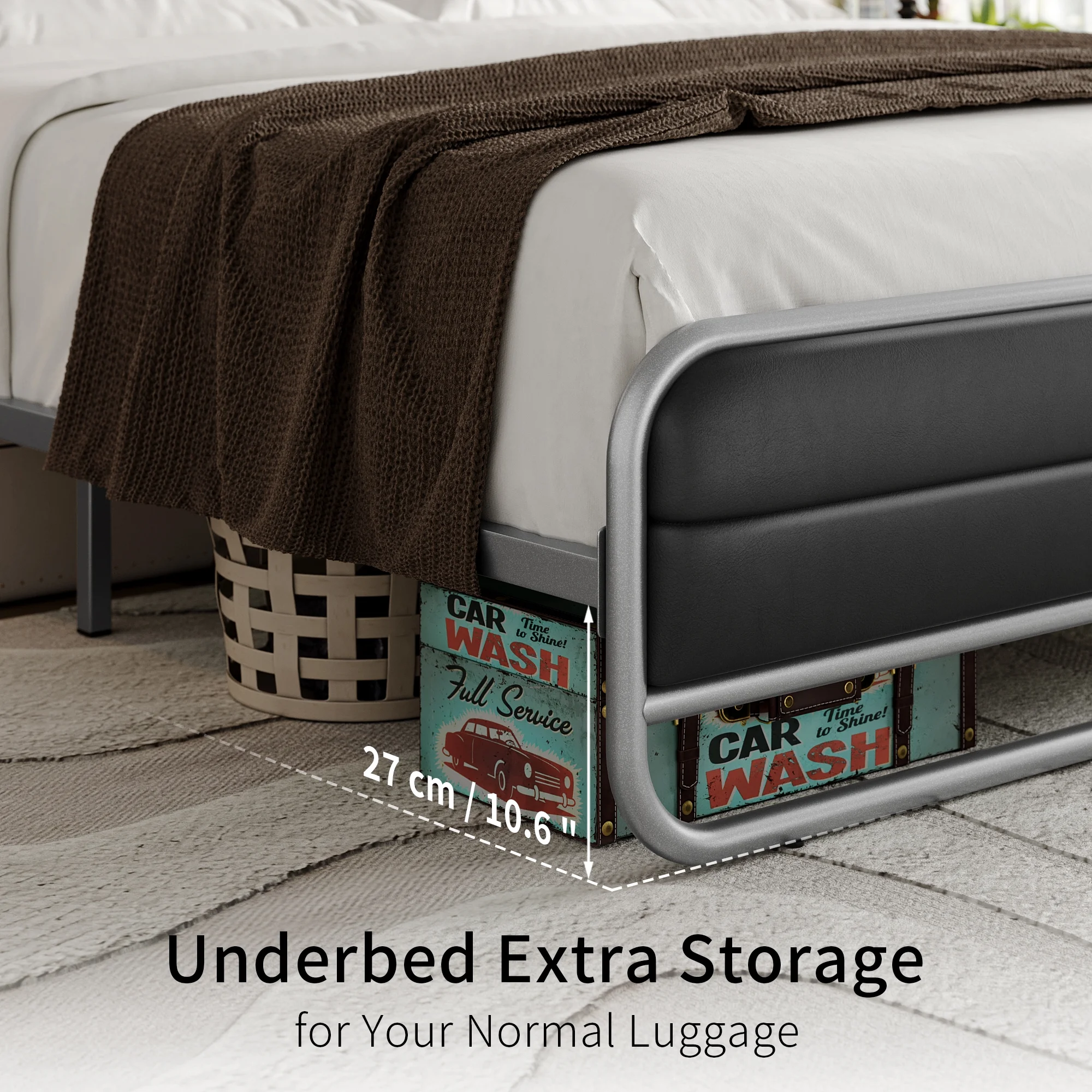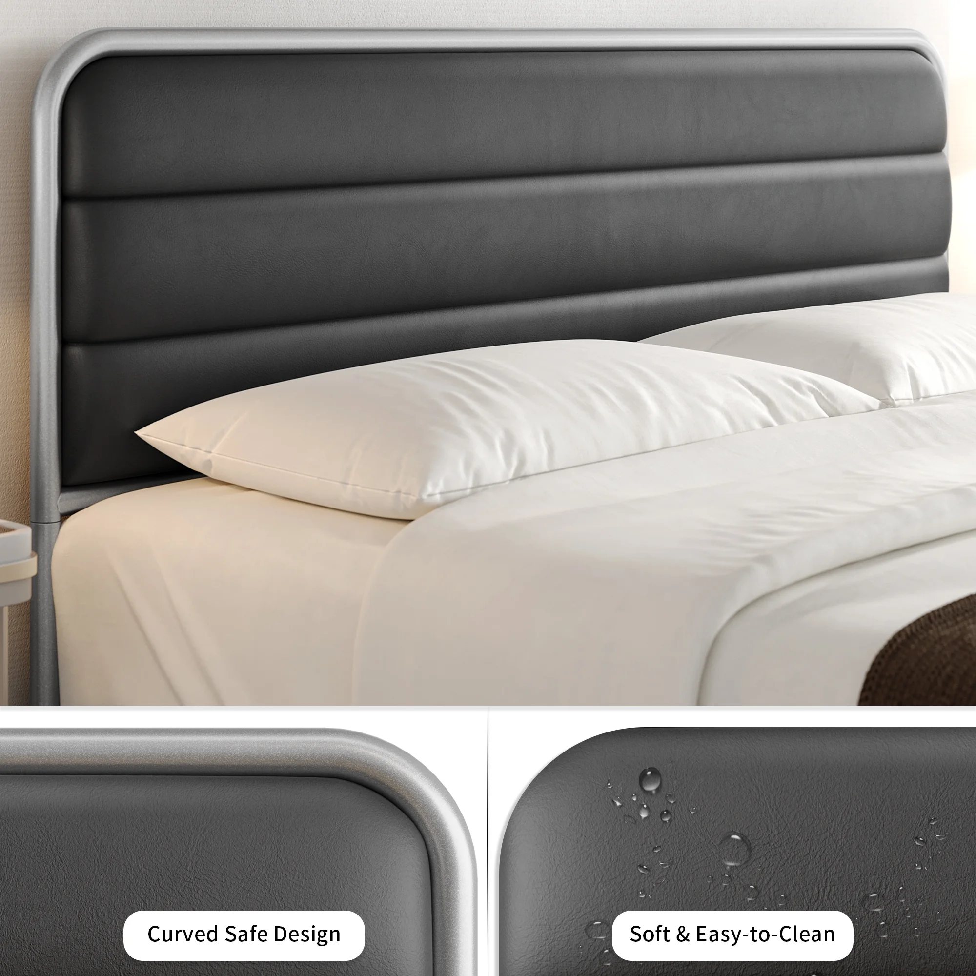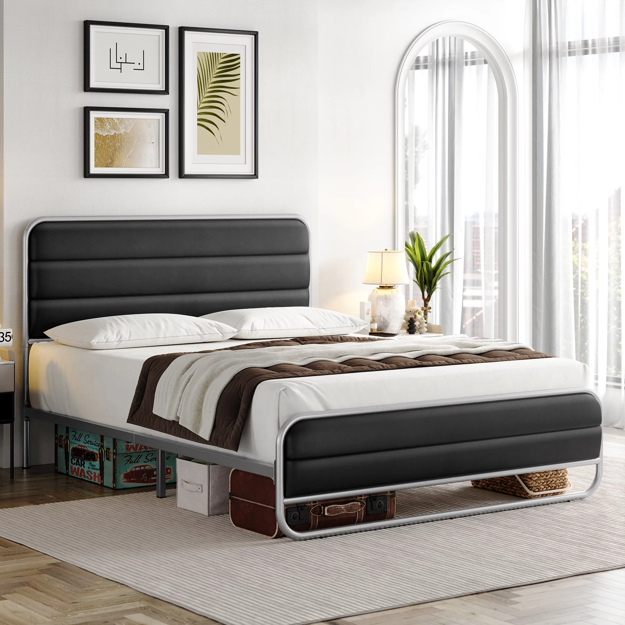 Homfa Full Bed Frame with PU Leather Upholstered Headboard, Silver Metal Tubular Platform Bed with 10.6 Under Bed Storage, Black