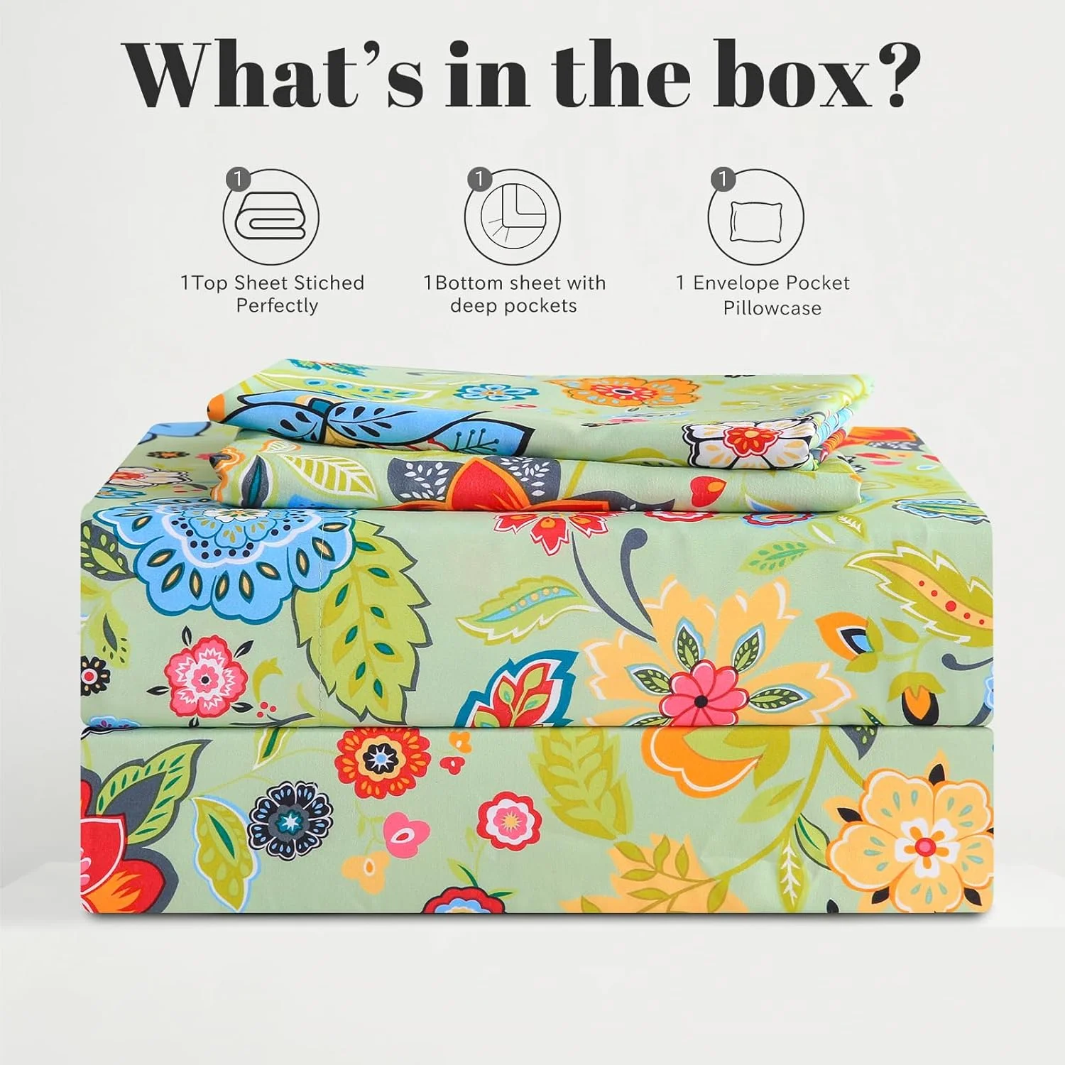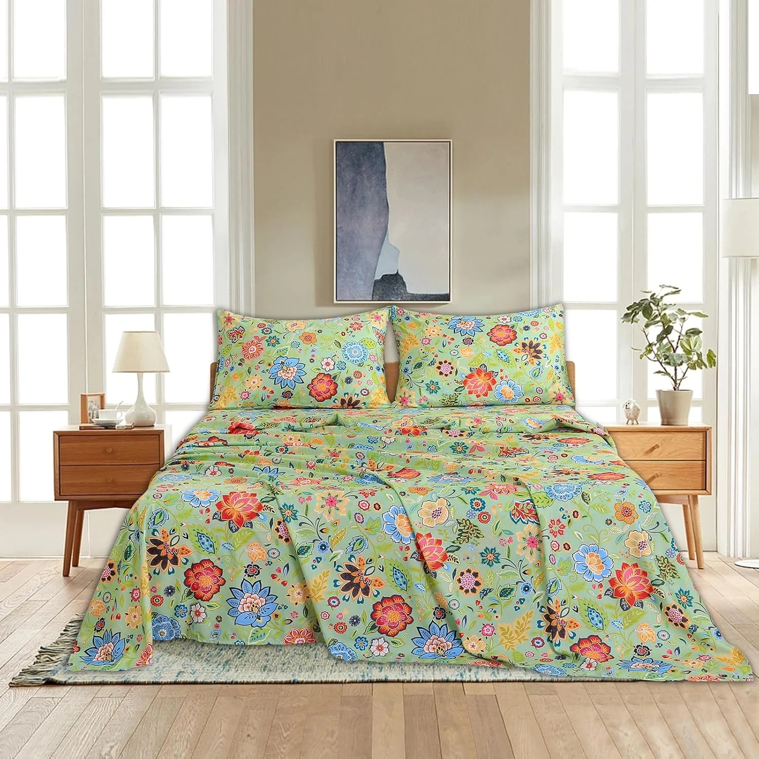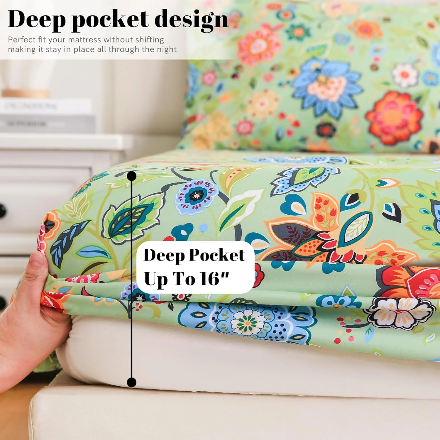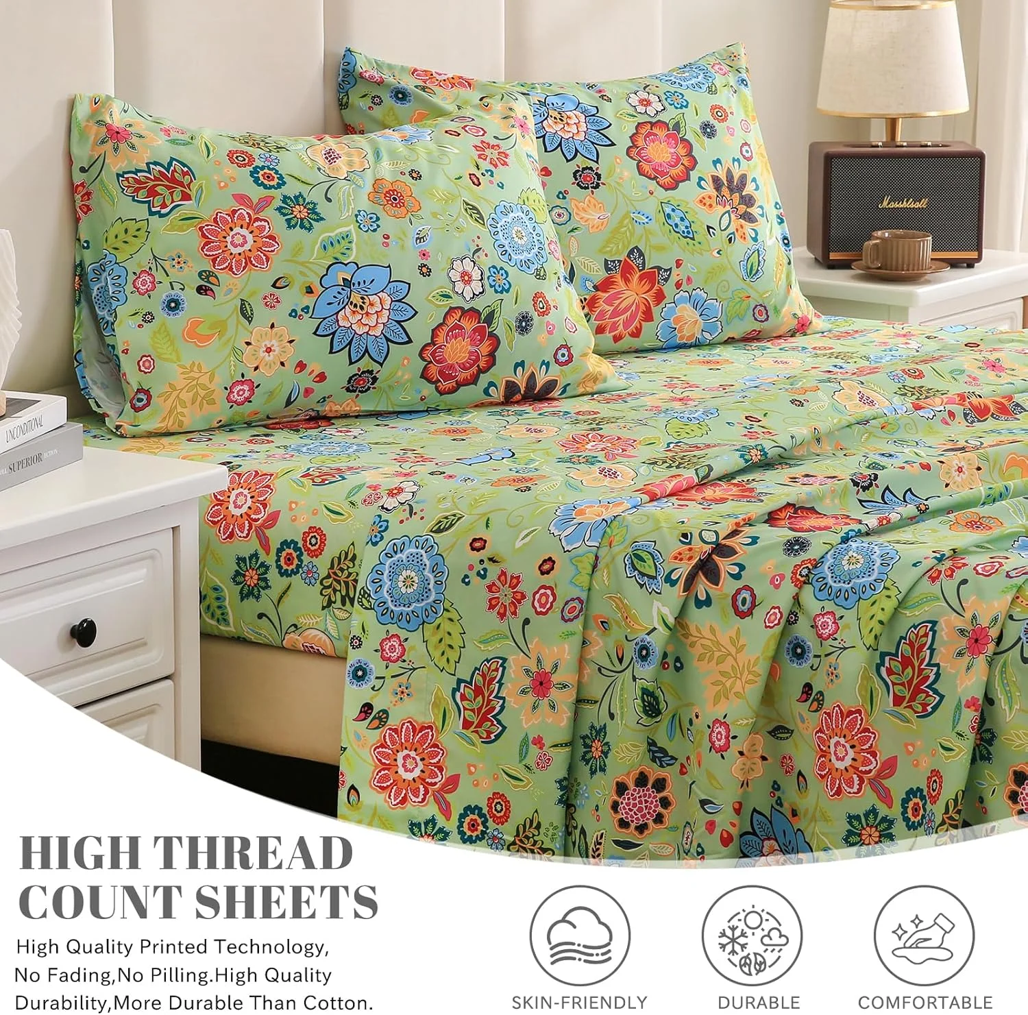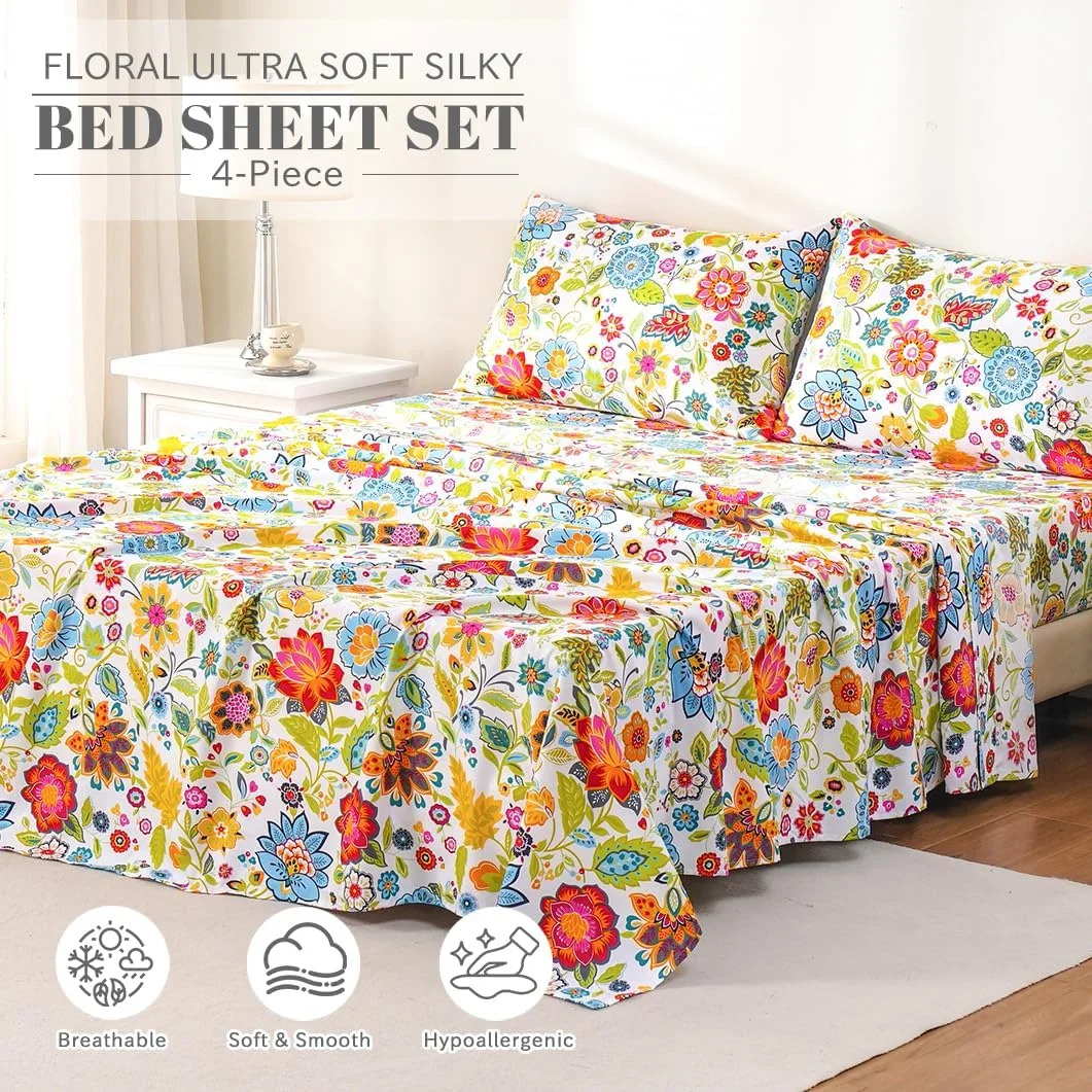 Full Sheet Set Ultra Soft, Breathable, Silky Flower Deep Pocket 100% Microfiber Bedding, 4 Piece Full Size with Floral Spring Design