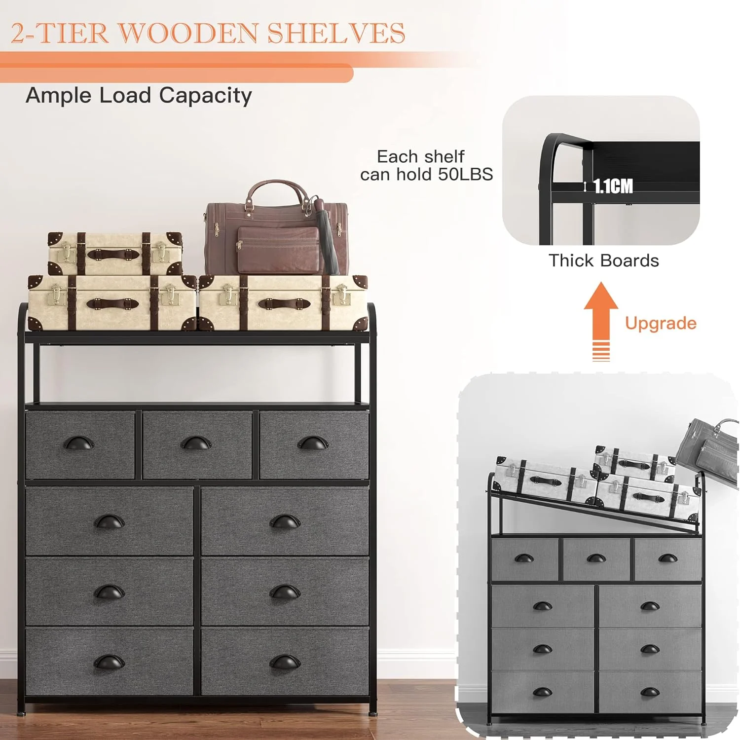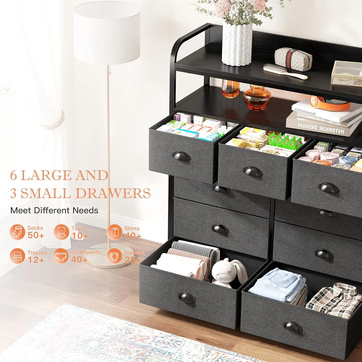 Dresser for Bedroom, Chest of Drawers for Bedroom,Tall Dresser with 9 Drawer Dresser,Fabric Dresser for Closet with Wood Top for Living Room,Entryway,2 Shelves,Metal Frame - Curated Treasures Market