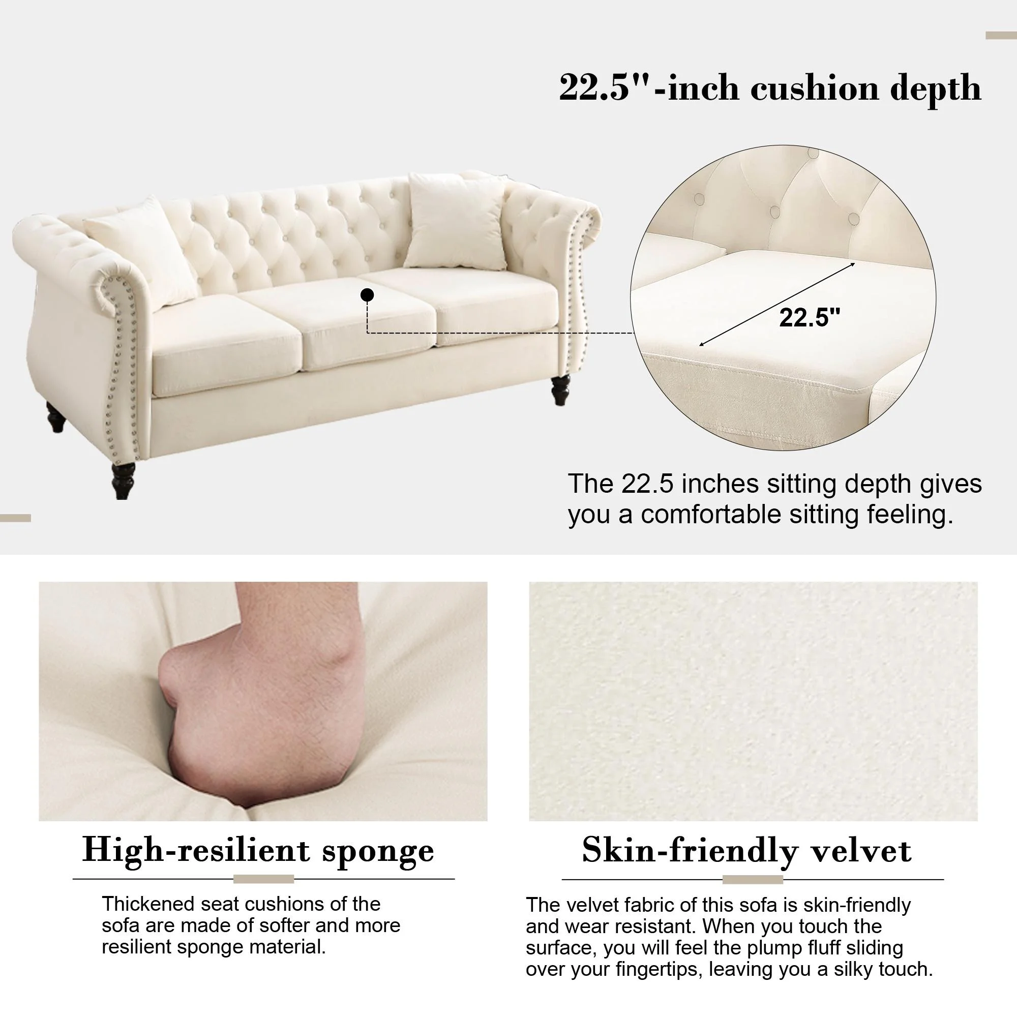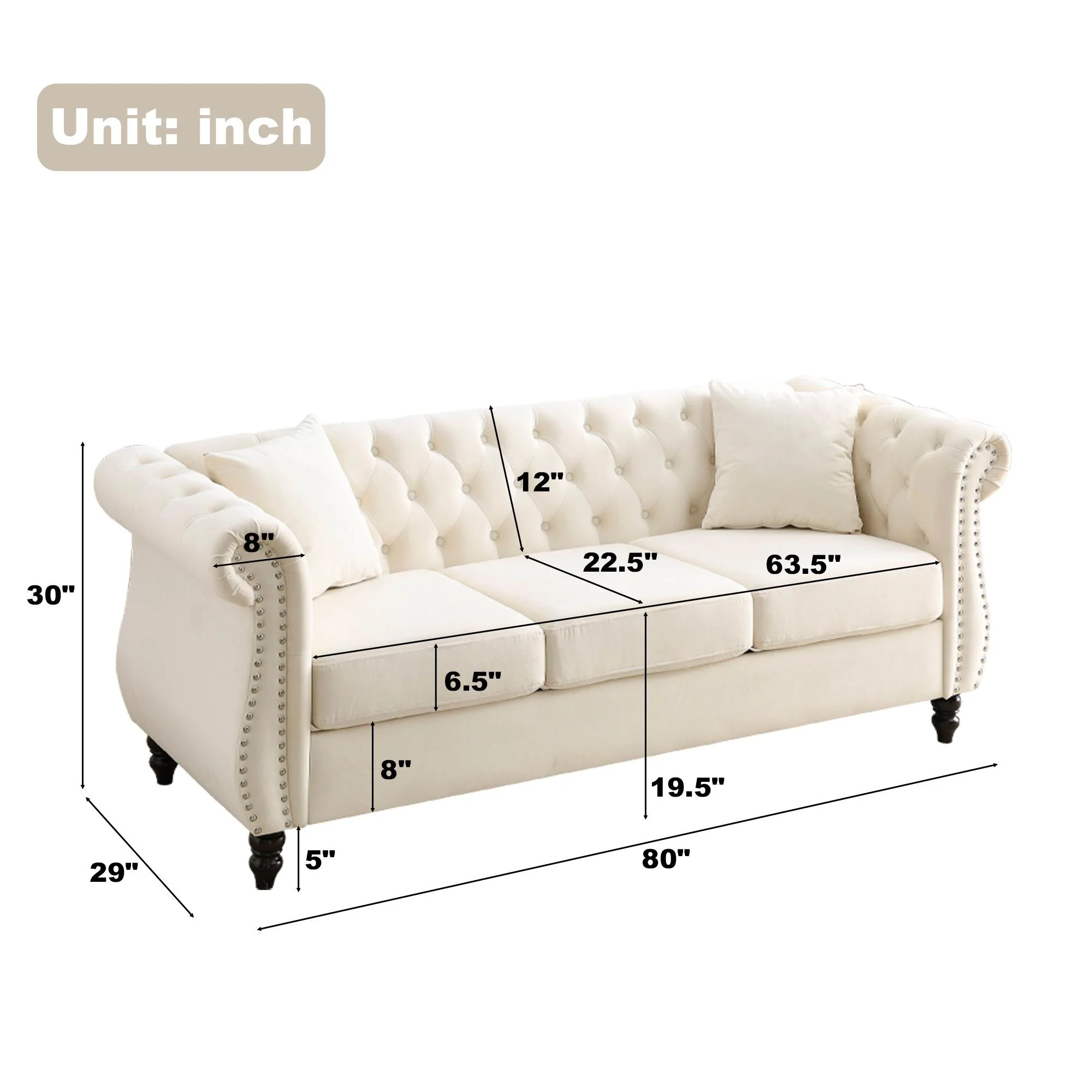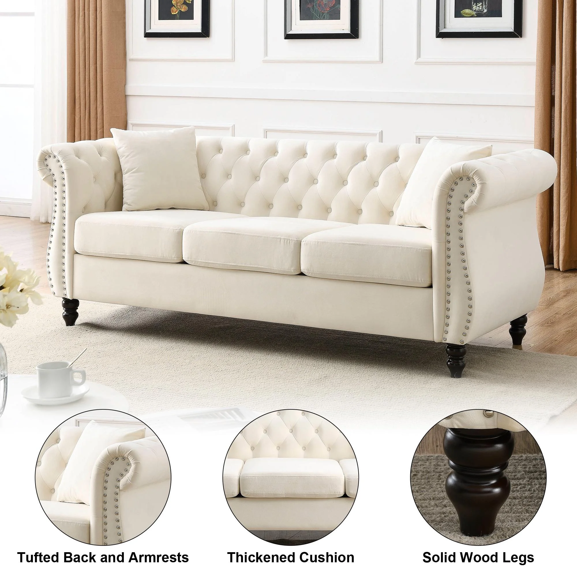 FURNINEST Living Room Sofa Furniture, Mid-Century 3-Seat Couches and Sofas, Velvet Upholstered Sofa Sofa with 2 Pillows and Wood Legs, Velvet Sofa for Living Room Bedroom, 80"L x 29"W x 30"H, Beige - Curated Treasures Market