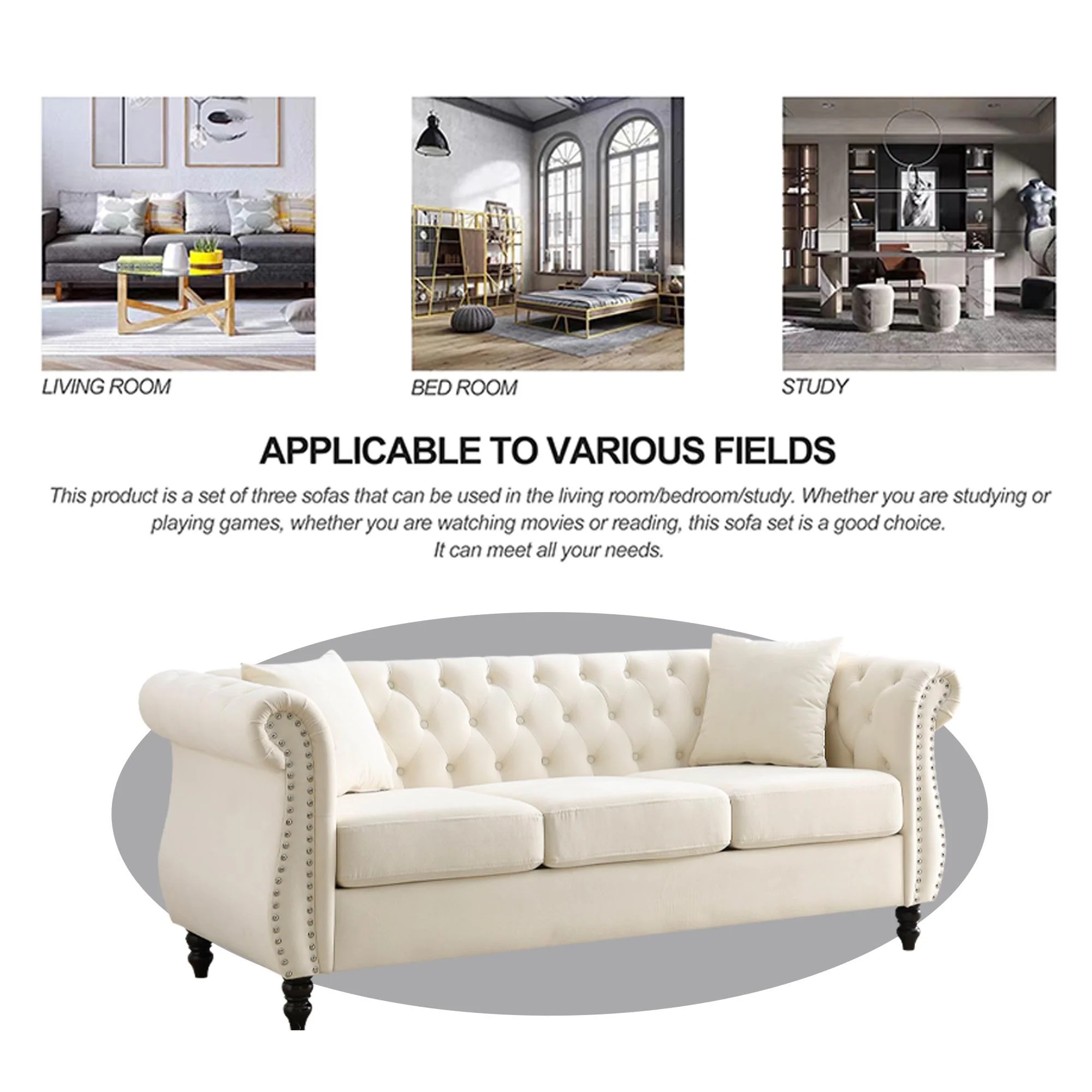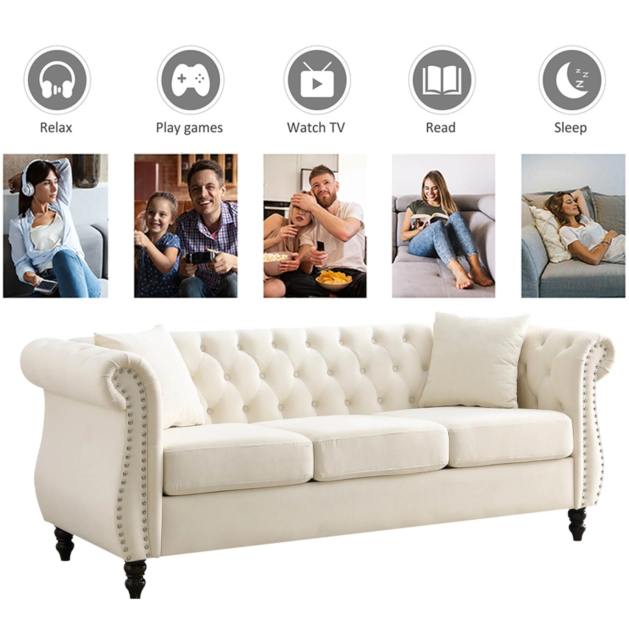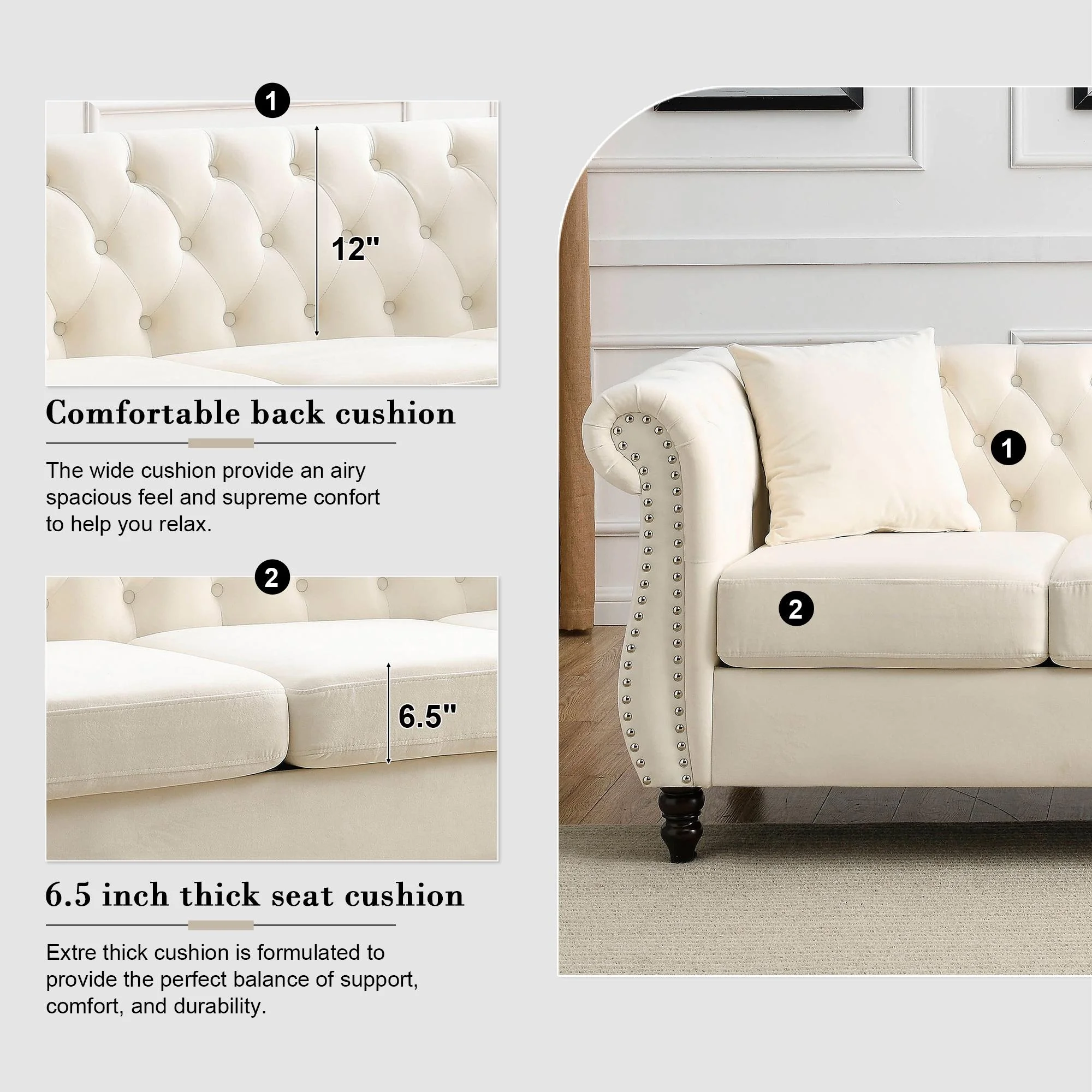 FURNINEST Living Room Sofa Furniture, Mid-Century 3-Seat Couches and Sofas, Velvet Upholstered Sofa Sofa with 2 Pillows and Wood Legs, Velvet Sofa for Living Room Bedroom, 80"L x 29"W x 30"H, Beige - Curated Treasures Market