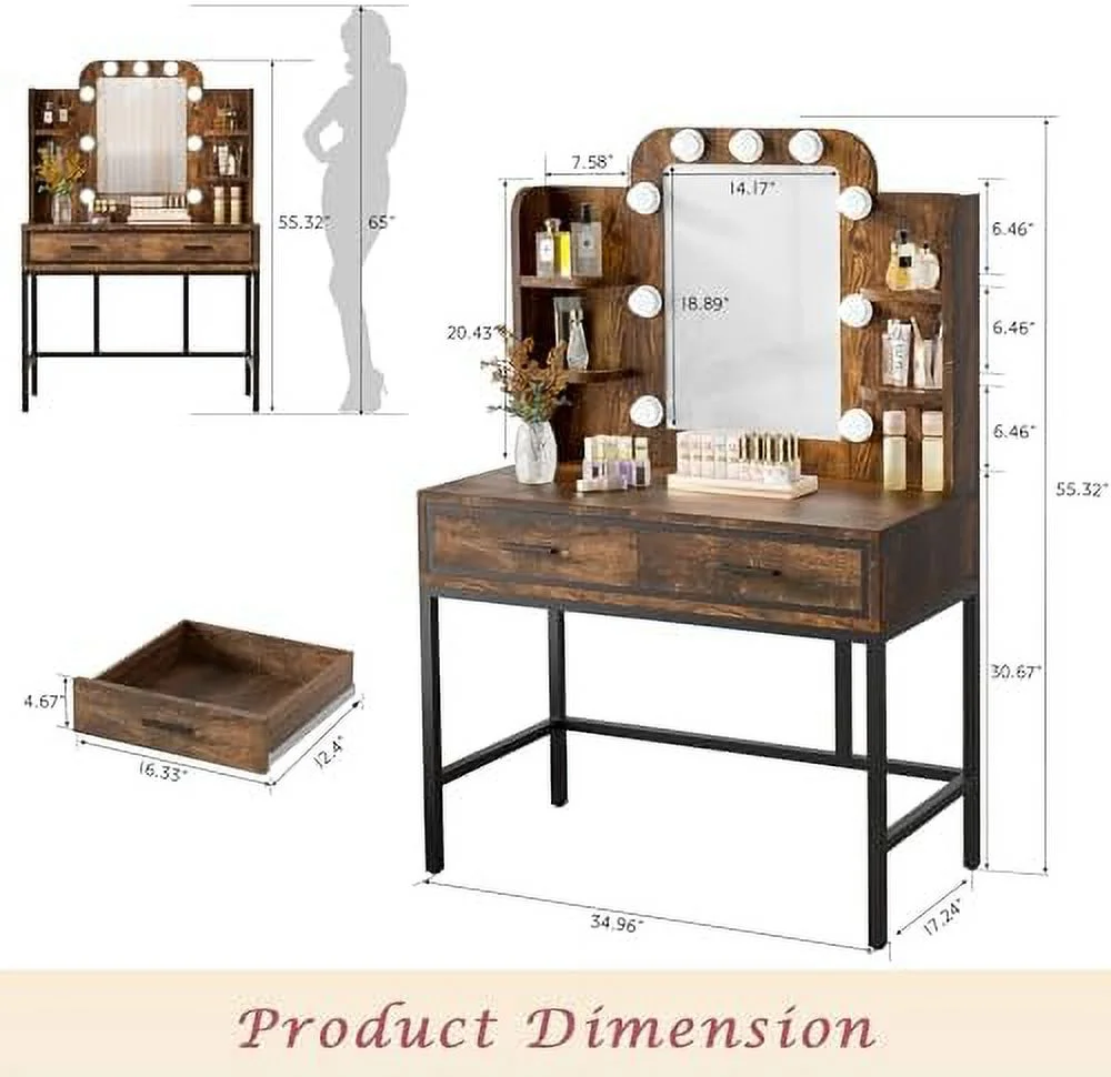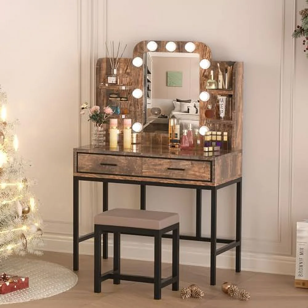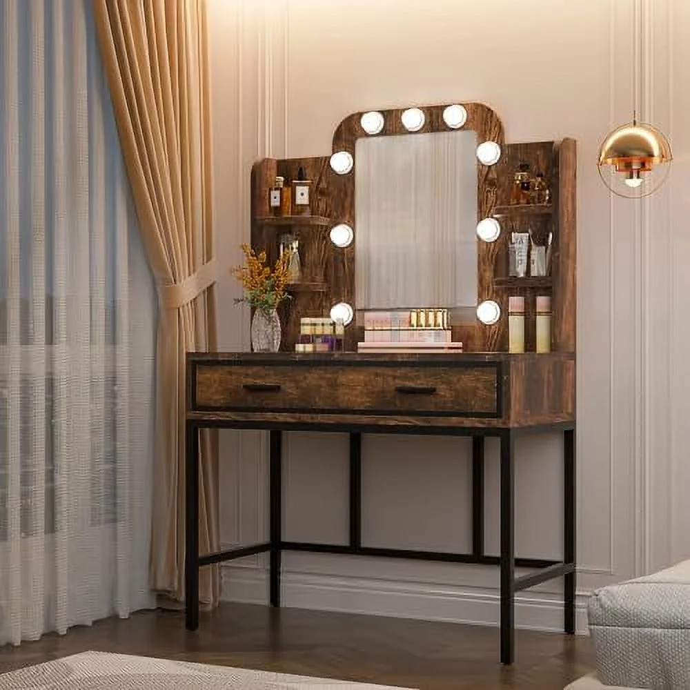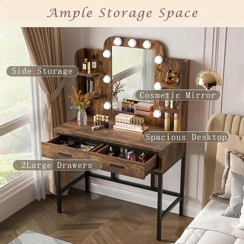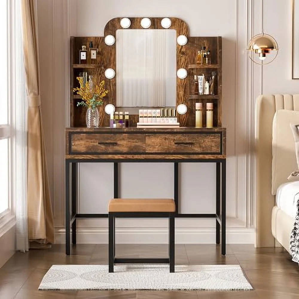 TQJKLFDY Vanity Set Vanity Desk with LED Lights and Mirror Rustic Elegant Dressing Table with 2 Drawers & Open Shelves for Women Girls Vintage Desk for Bedroom Brown\u2026 - Curated Treasures Market