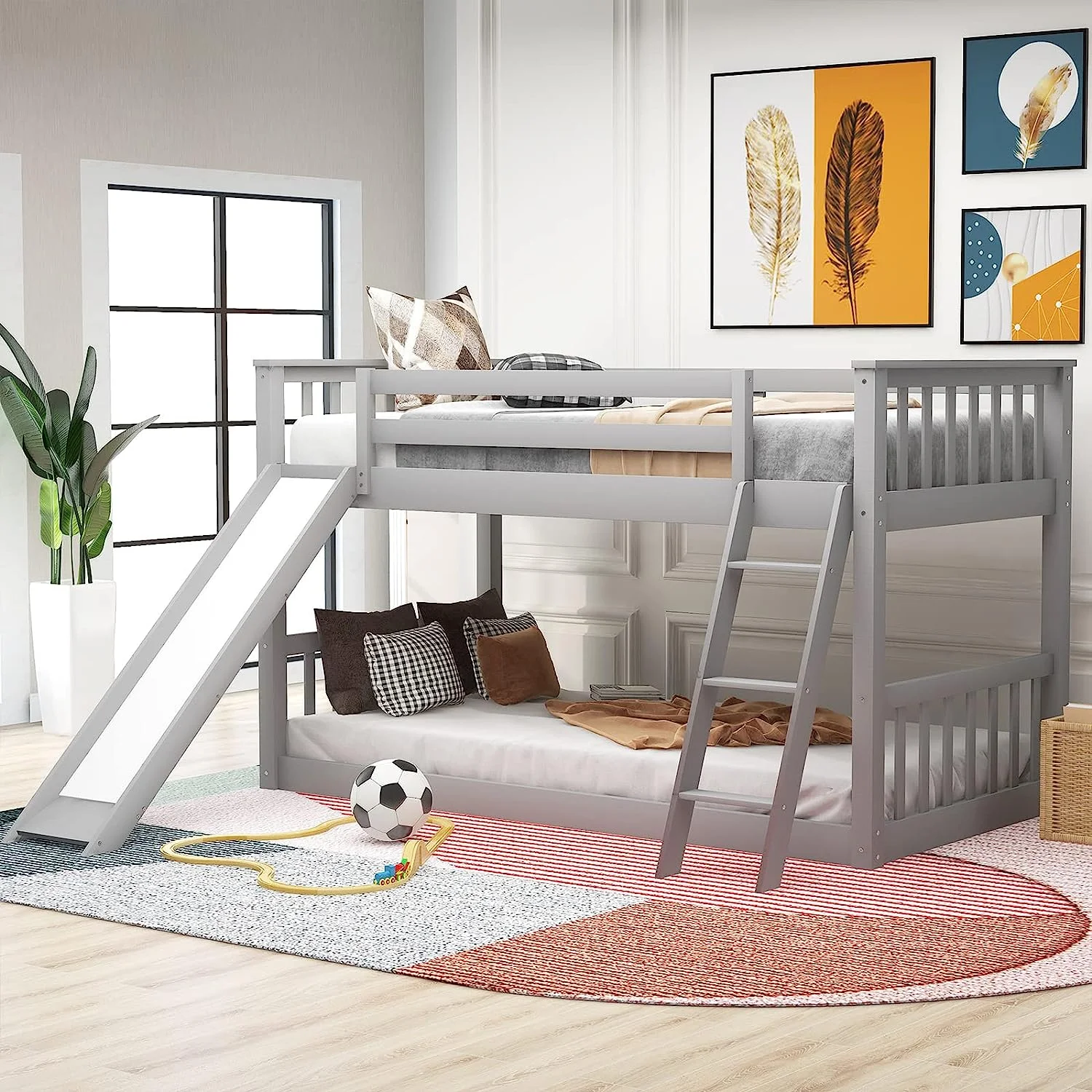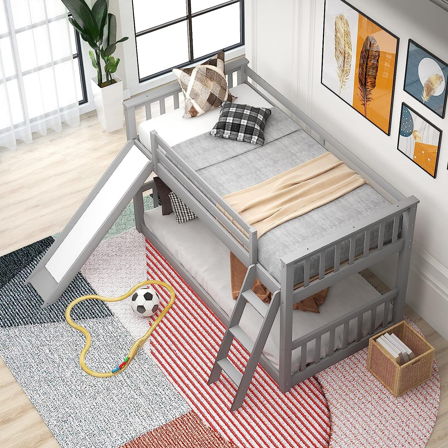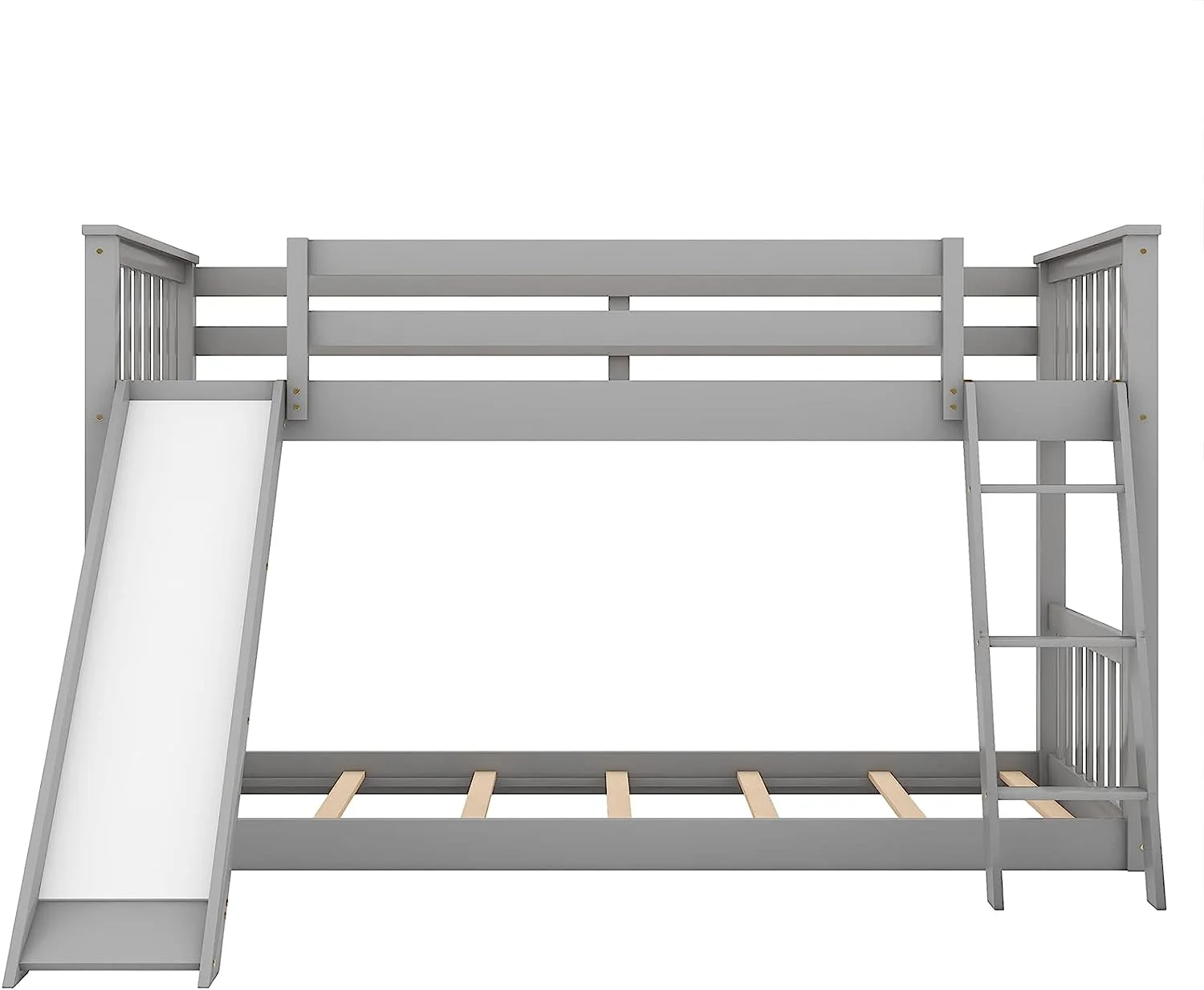 Twin Over Twin Floor Bunk Bed with Slide and Ladder Solid Pine Wood Low Bunkbeds w/Safety Guardrails No Box Spring Needed Noise Free for Dorm Bedroom Guest Room Gray - Curated Treasures Market