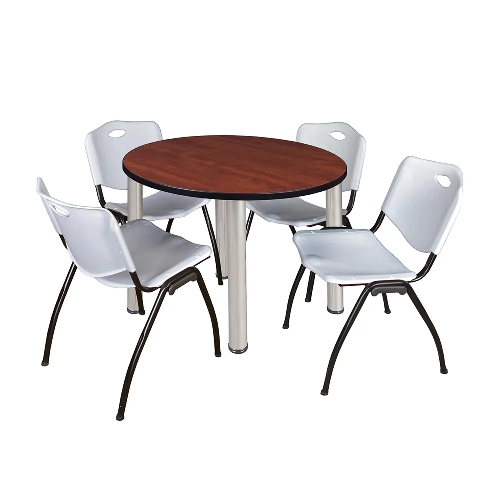 Belen Kox Kee 42" Round Breakroom Table- Cherry/ Chrome & 4 'M' Stack Chairs- Grey - Curated Treasures Market