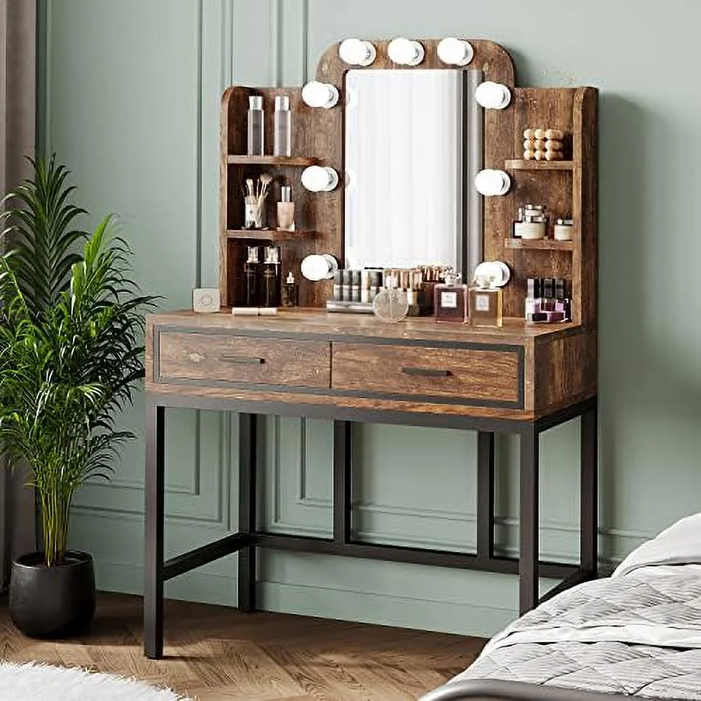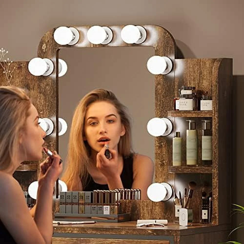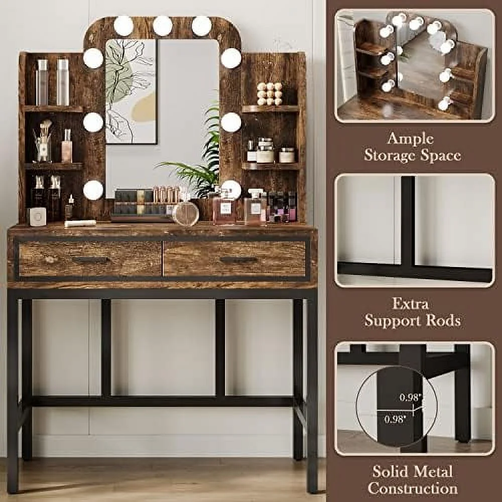 TQJKLFDY Vanity Desk with Mirror & Lights Vanity Table with 9 LED Lights 2 Drawers and 4 Shelves Vintage Vanity Set Table for Bedroom Rustic Brown - Curated Treasures Market