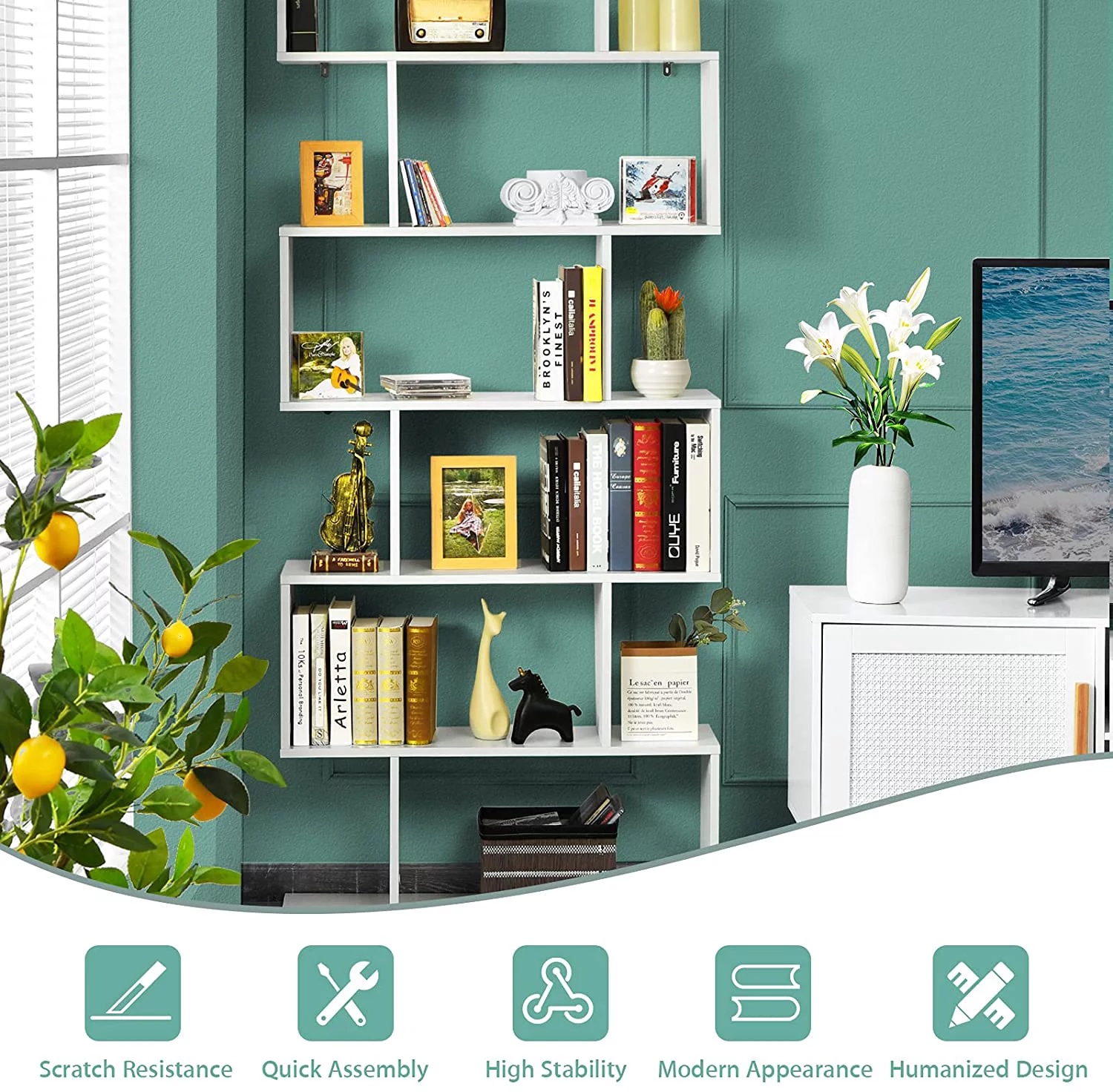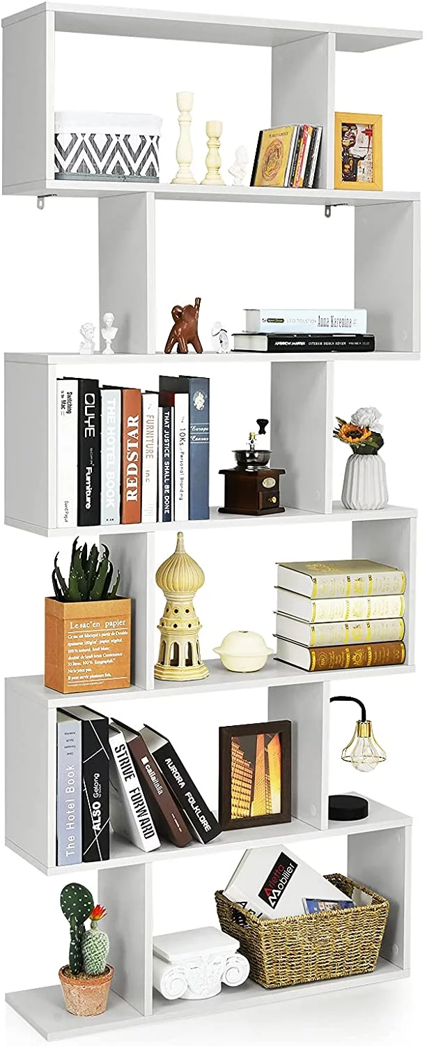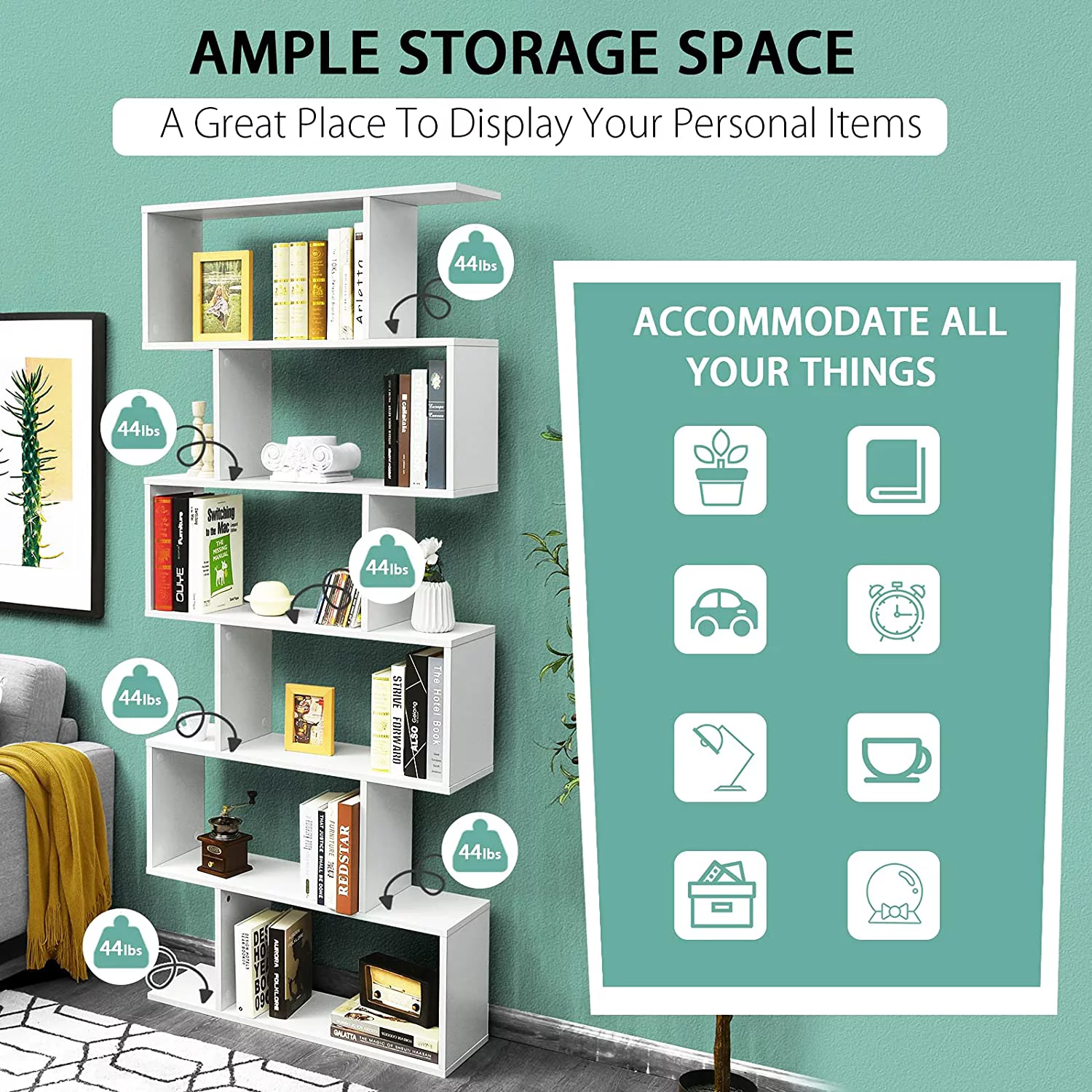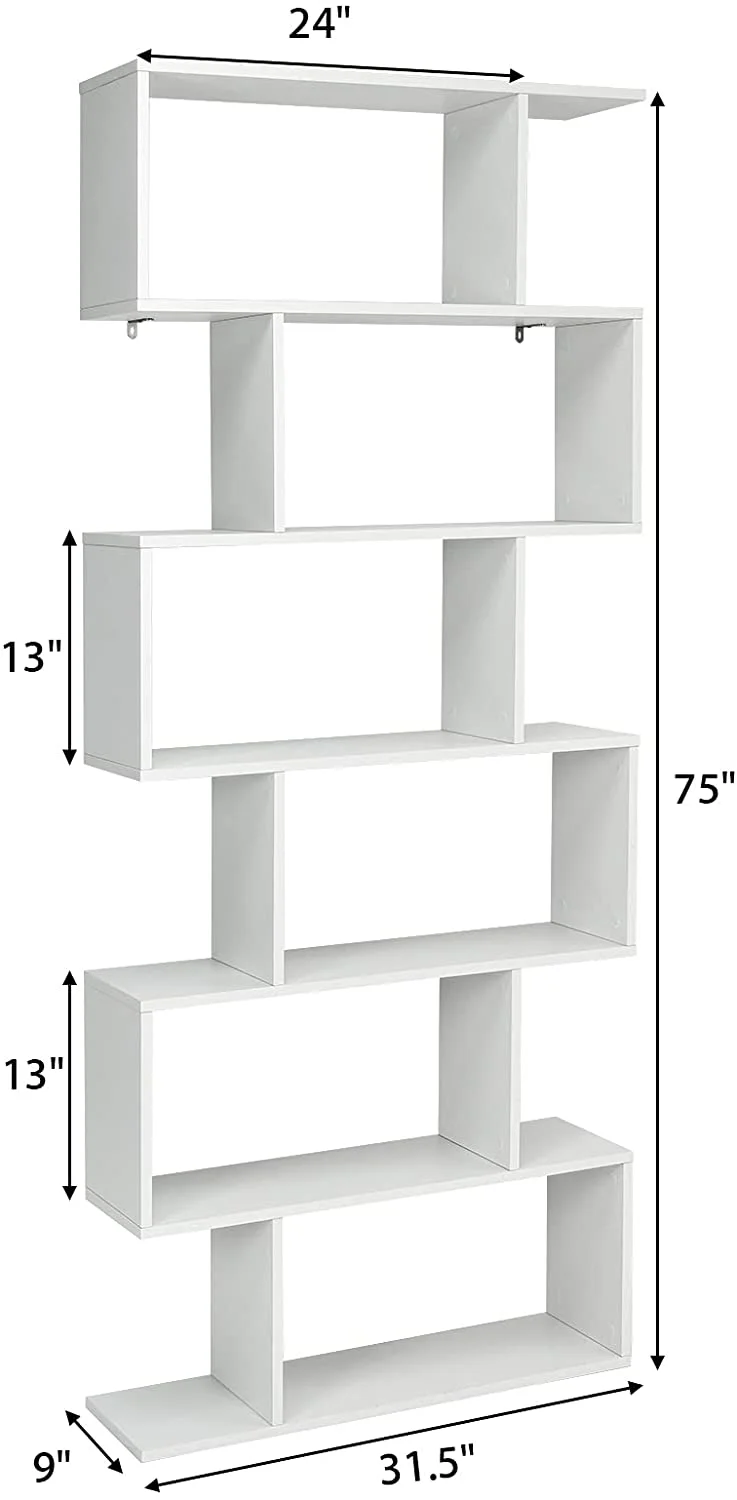 6 Tier S Shaped Bookshelf, 31.5''L x 9''W x 75''H, Wooden Bookcase and Bookshelves w/Anti-Toppling Device, Room Divider Display Shelves for Living Room, Home Decor, 6 Shelf Bookshelf - Curated Treasures Market