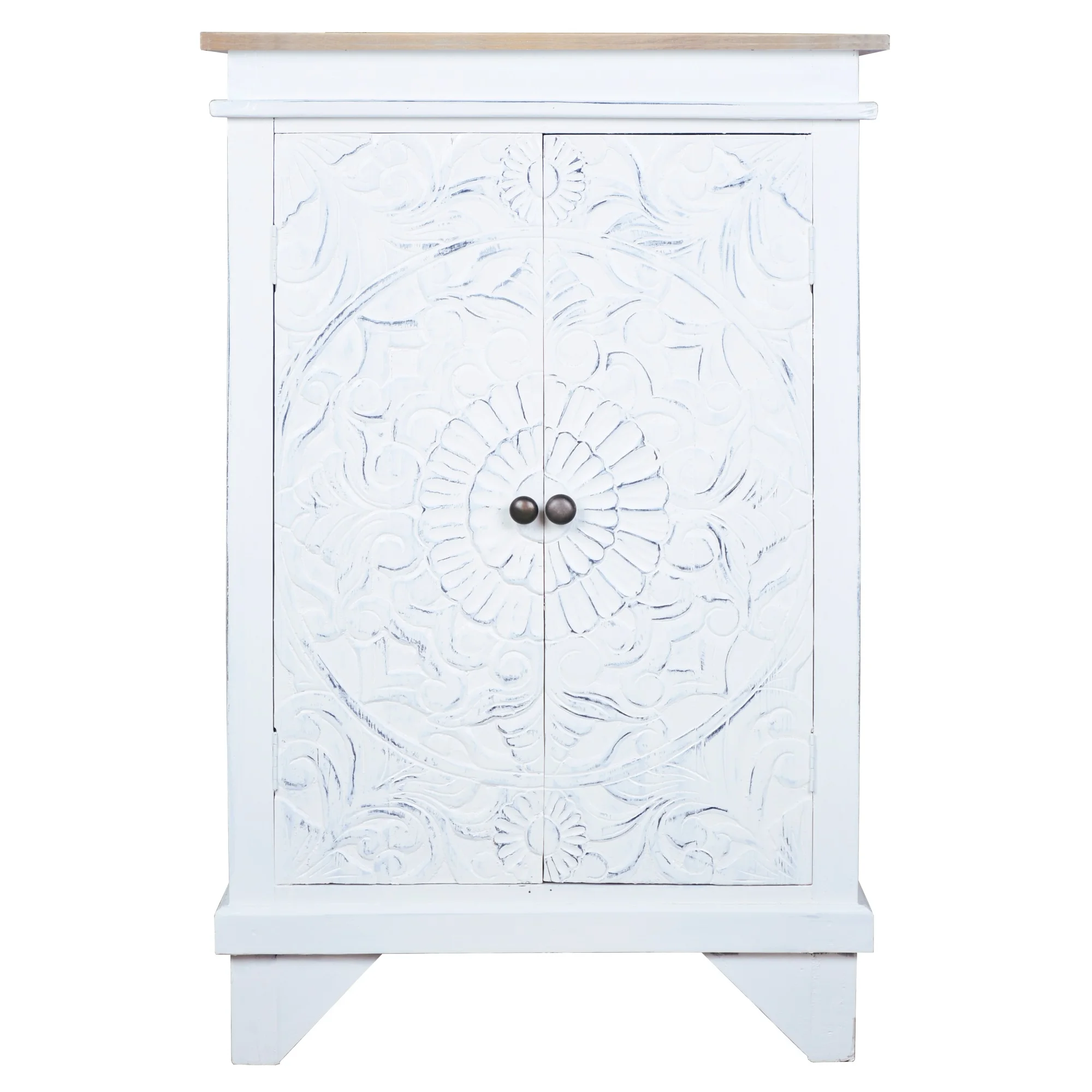 Besthom Shabby Chic Cottage Distressed White and Driftwood Brown Wood Carved Accent Cabinet - Curated Treasures Market