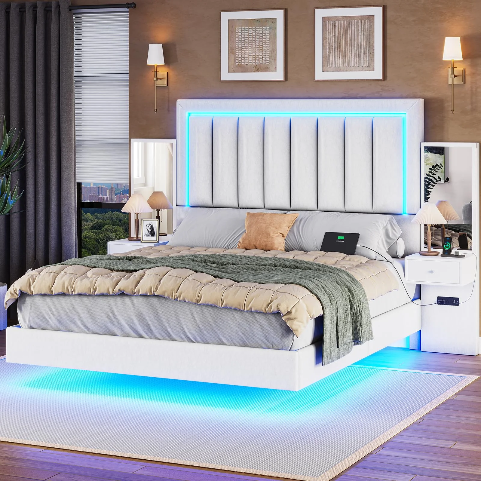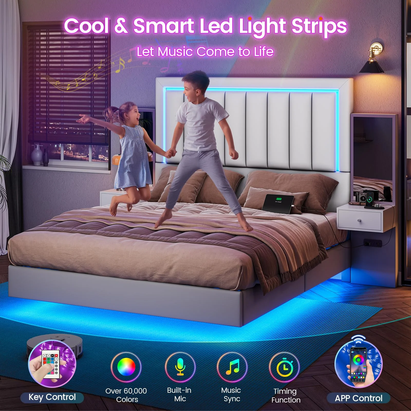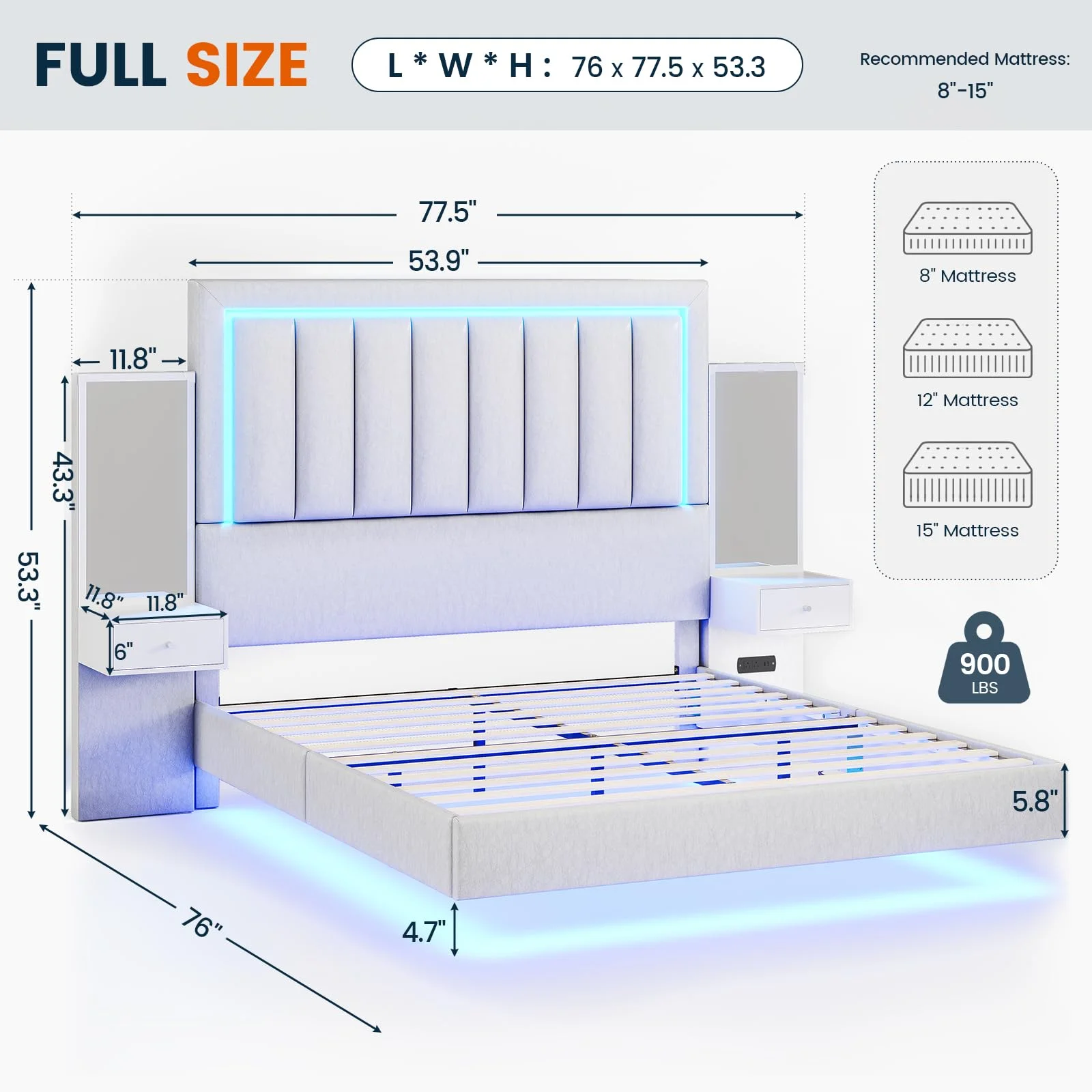Full Size Floating Bed Frame with USB Port Charging Station and Led Ligt,53.3" Tall Headboard, White PU Leather Platform Bed Frame,2 Nightstands with Mirror - Curated Treasures Market