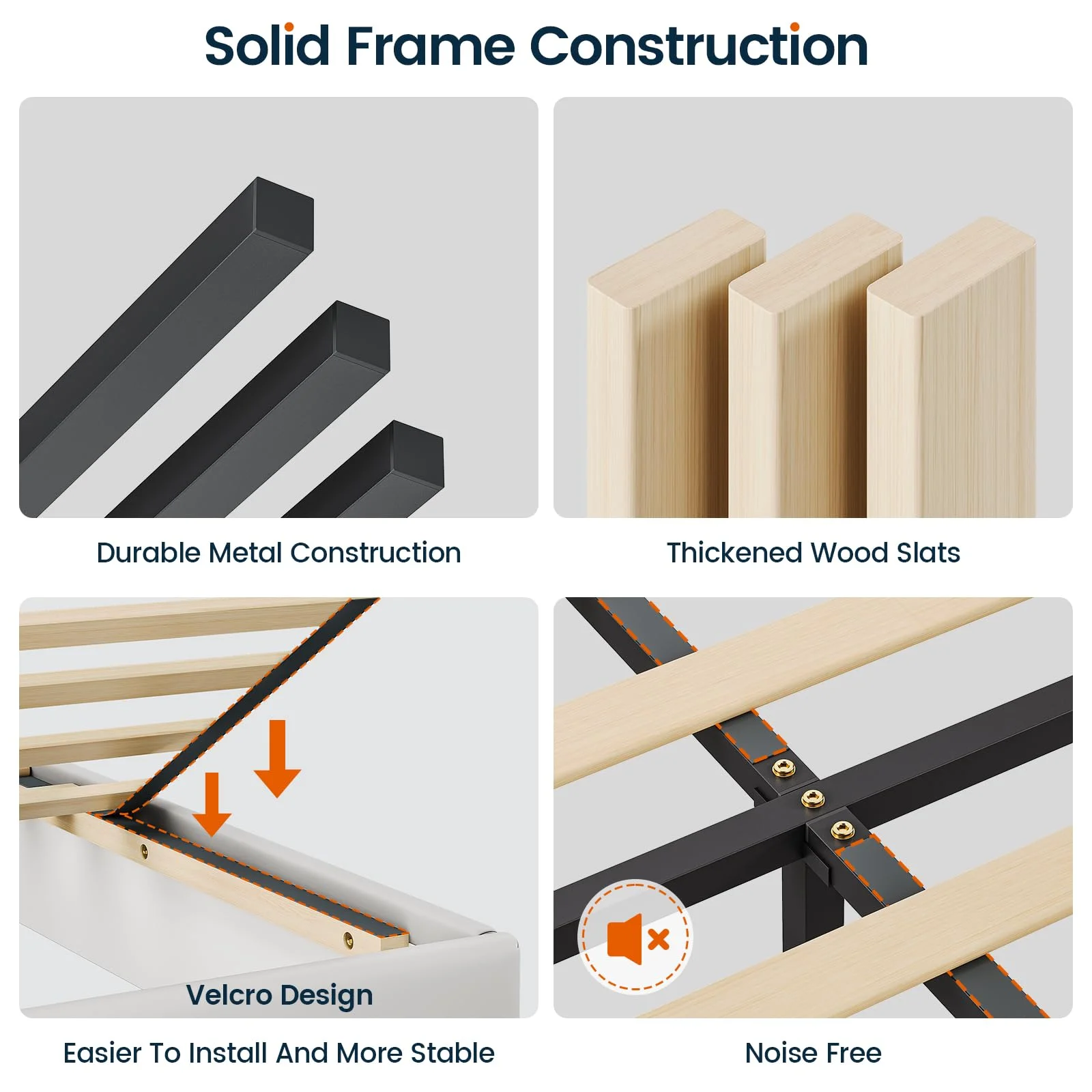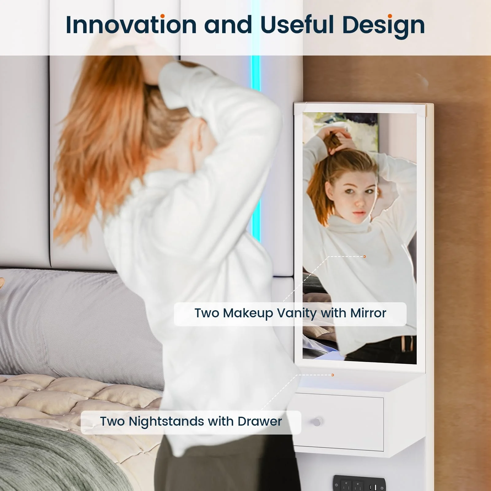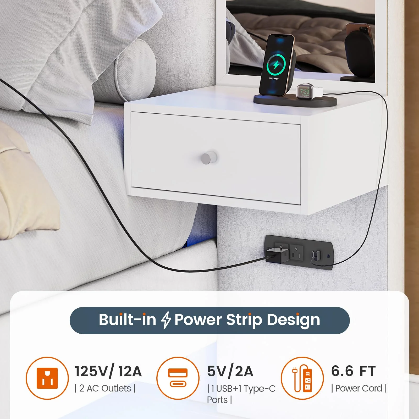 Full Size Floating Bed Frame with USB Port Charging Station and Led Ligt,53.3" Tall Headboard, White PU Leather Platform Bed Frame,2 Nightstands with Mirror - Curated Treasures Market