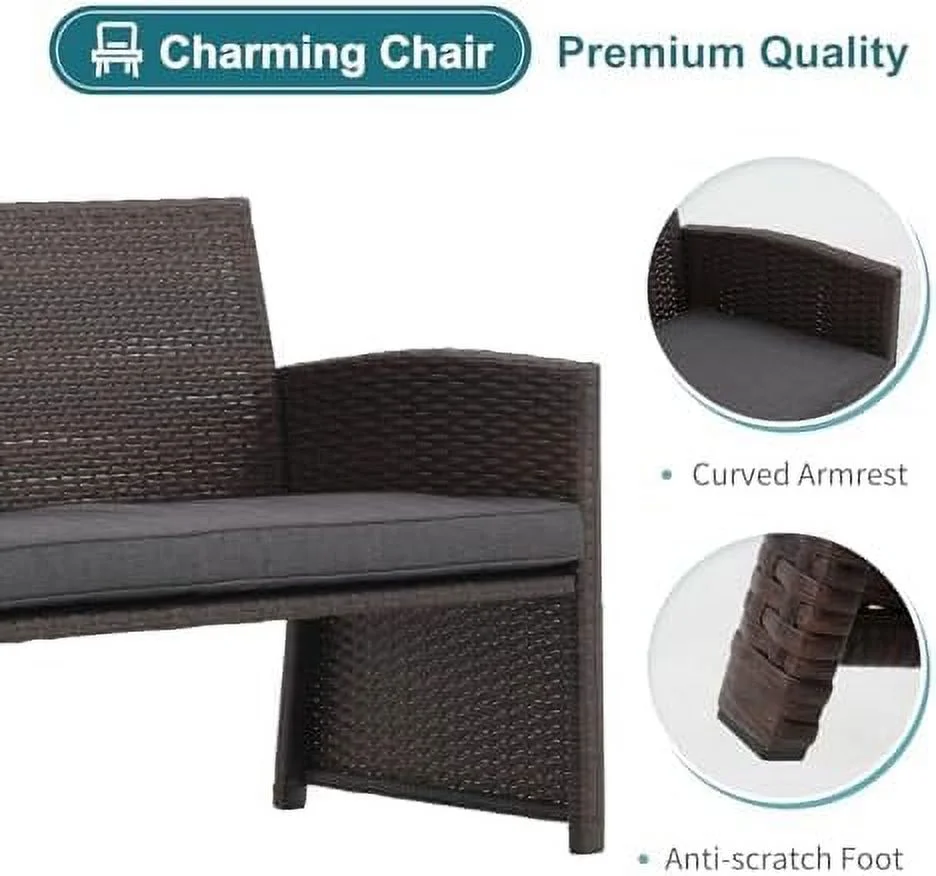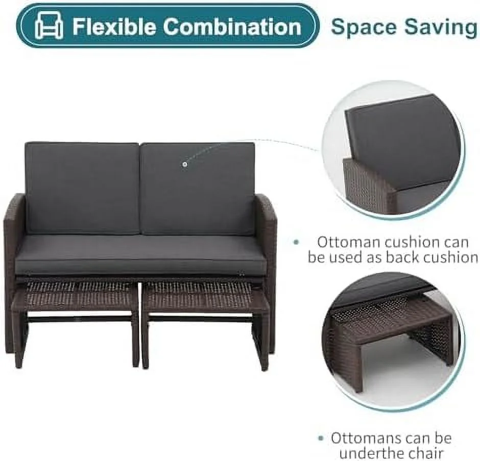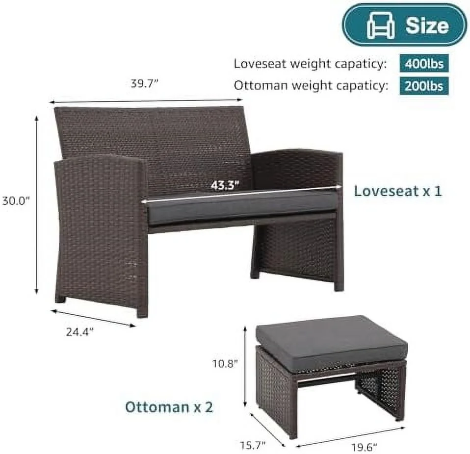 ZWNLKQG Outdoor Loveseat 3 Piece Patio Set Outdoor Conversation Set All-Weather Wicker Love Seat with Ottoman/ Brown Rattan Blue - Curated Treasures Market
