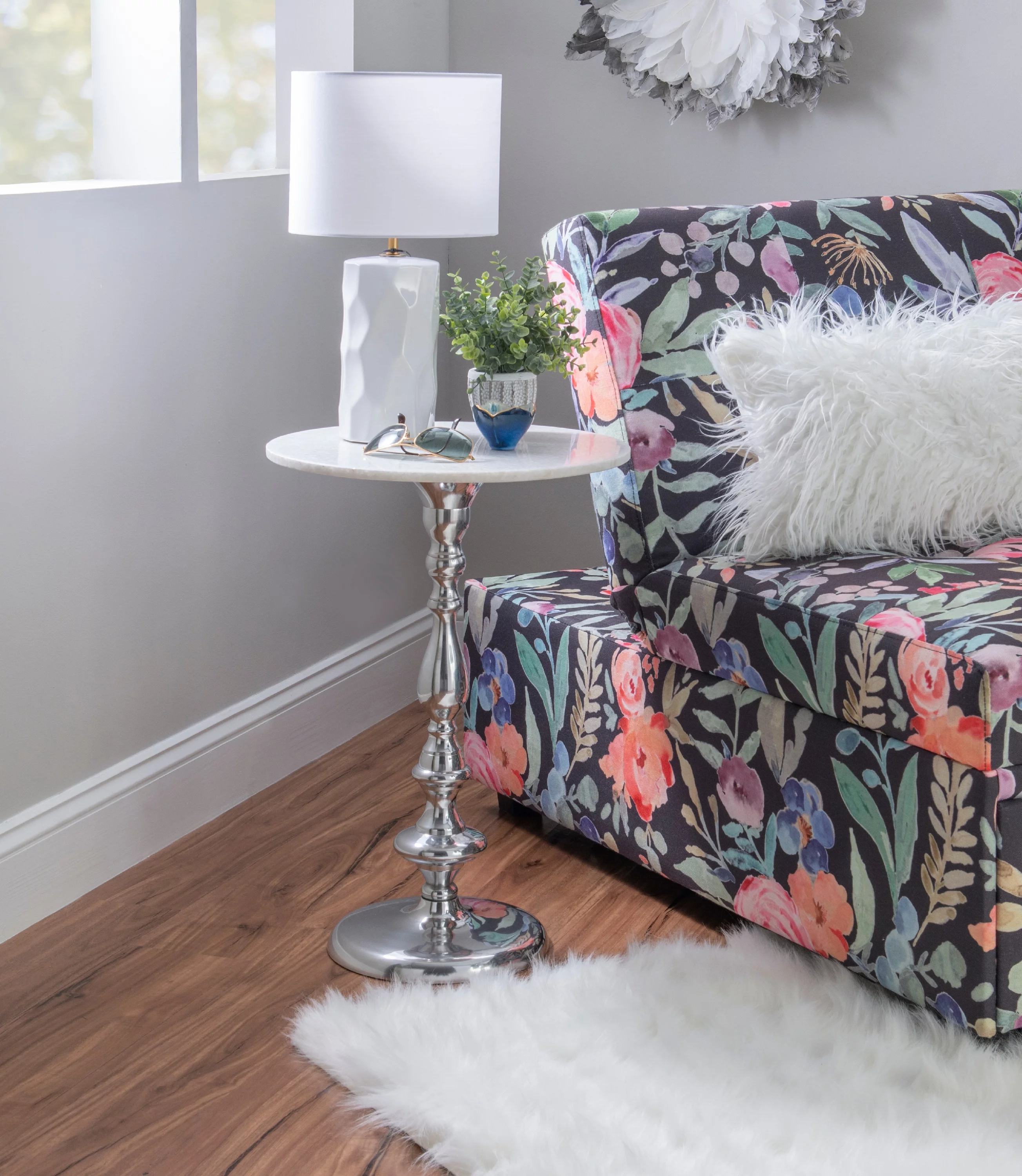 Powell Wiggins Round Side Table, 23.5" Tall, Silver Finish with White Marble - Curated Treasures Market