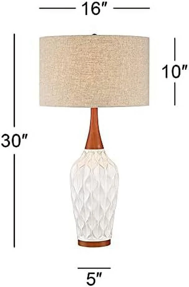 JDZHAPPYLIFE Lighting Rocco Mid Century Modern Table Lamp 30" Tall White Wave Geometric Ceramic Oak Wooden Neck Tan Fabric Drum Shade for Living Room Bedroom House Bedside Nightstand - Curated Treasures Market