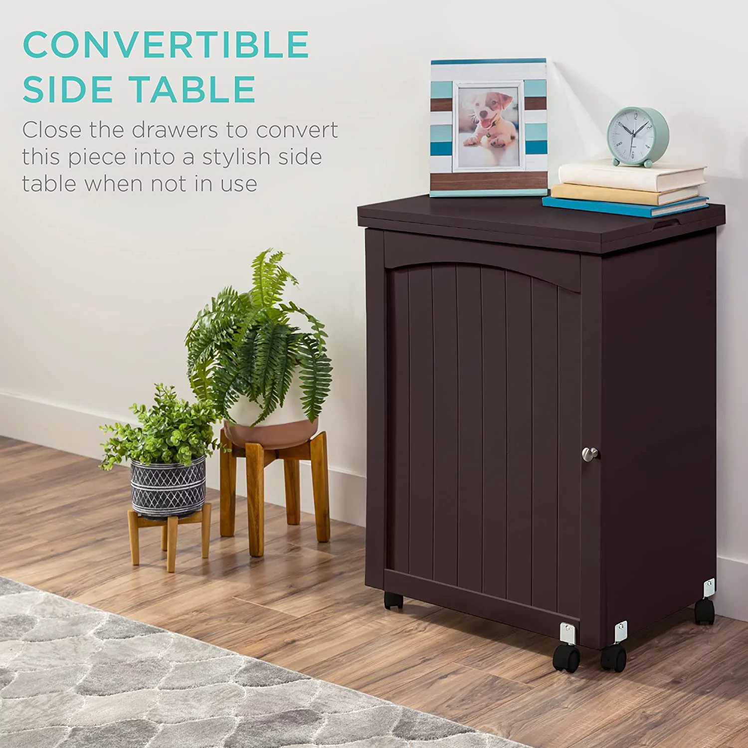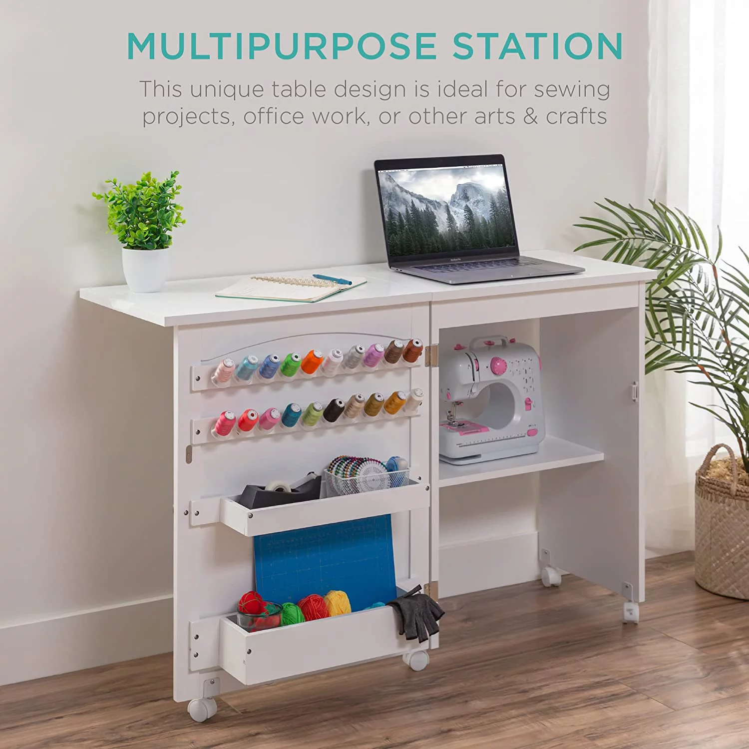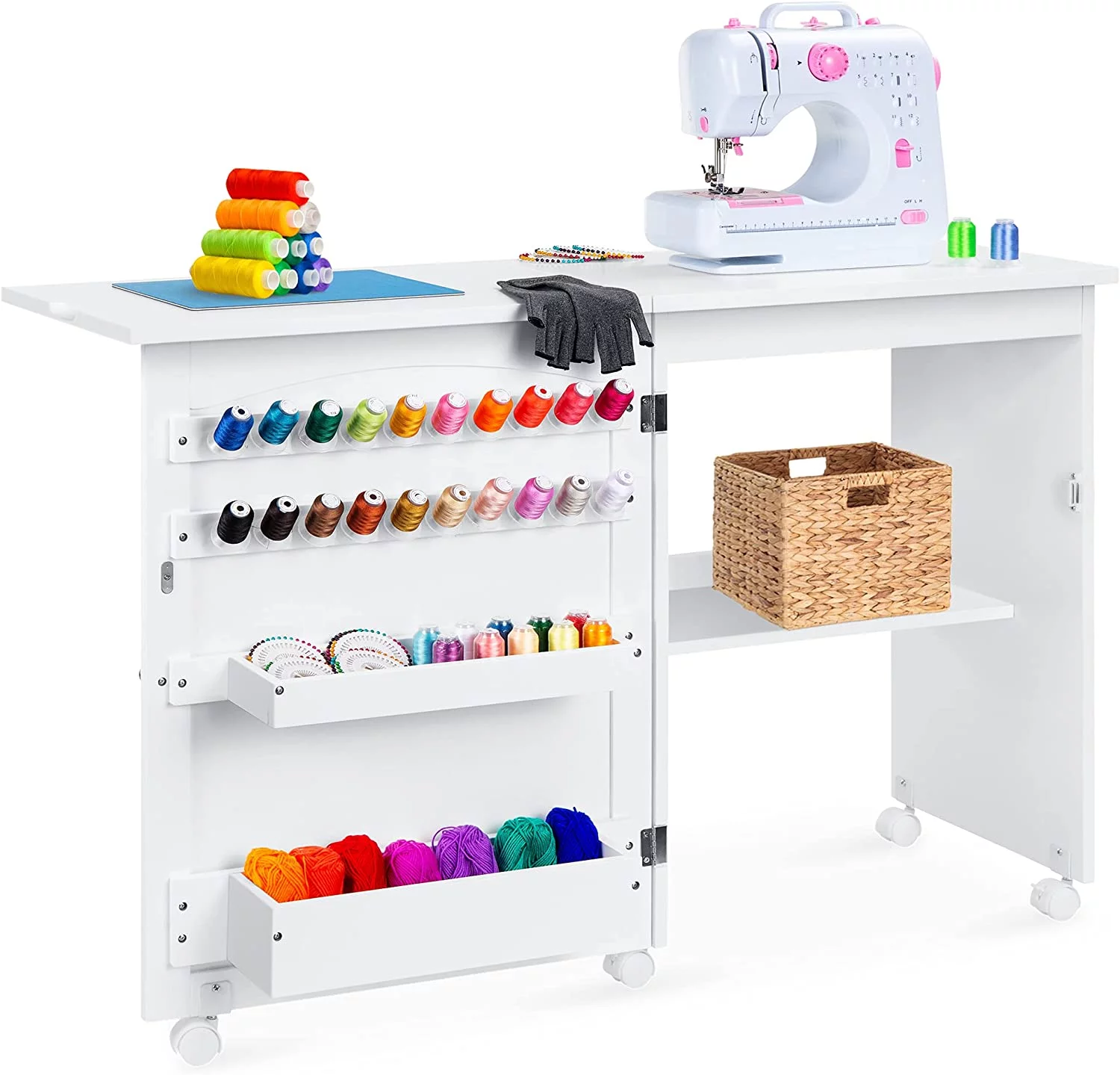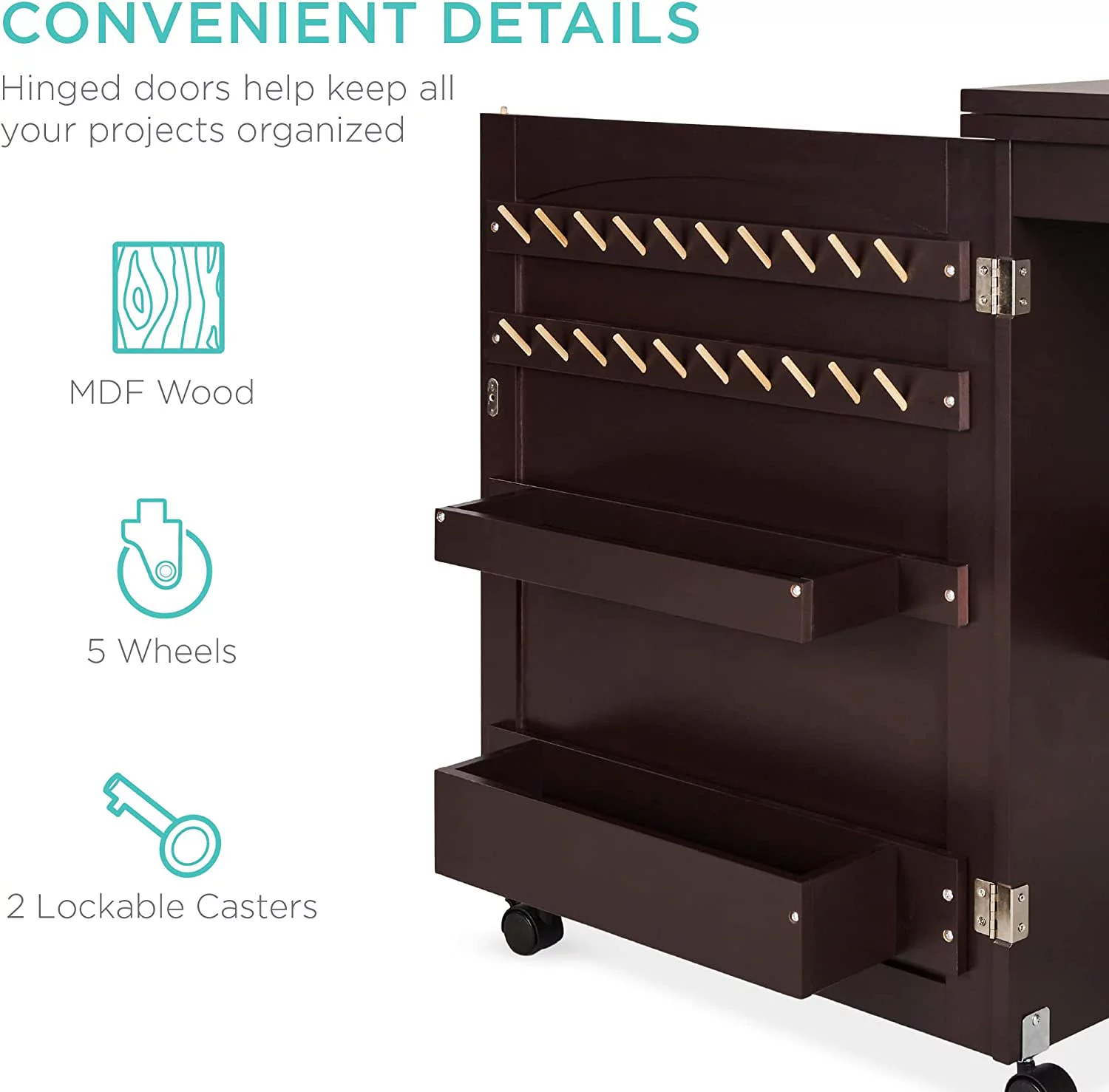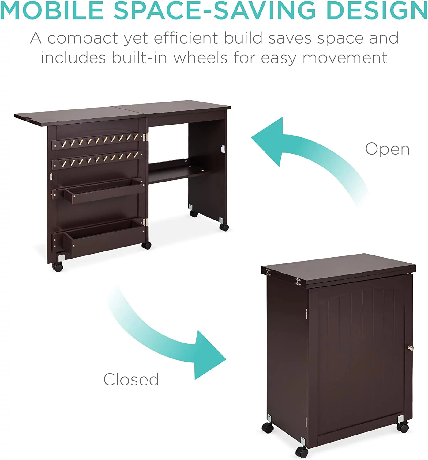 Folding Sewing Table Multipurpose Craft Station & Side Desk with Compact Design, Wheels, Shelves, Bins, Pegs, Magnetic Doors, Metal Doorknobs - Espresso - Curated Treasures Market