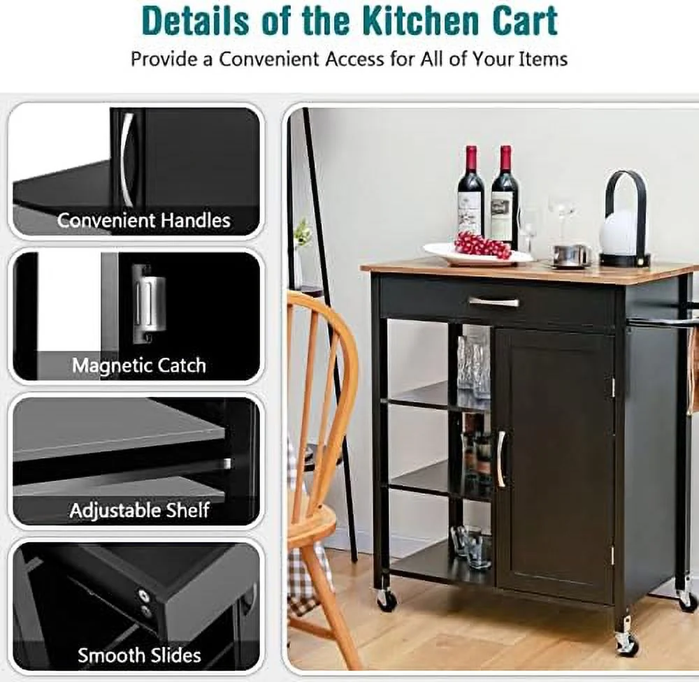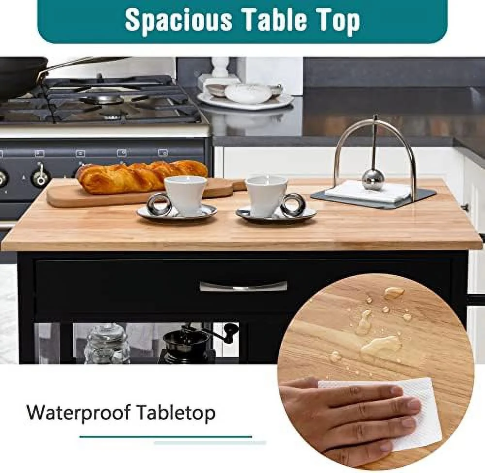 GVJMTKP Kitchen Island with Rolling Kitchen Cart with Towel Rack Drawer and 3-Tier Open Shelves Kitchen Island on Wheels with Rubber Wood Top 34.5 x 18.5 x 36.5 Inches (Black) - Curated Treasures Market