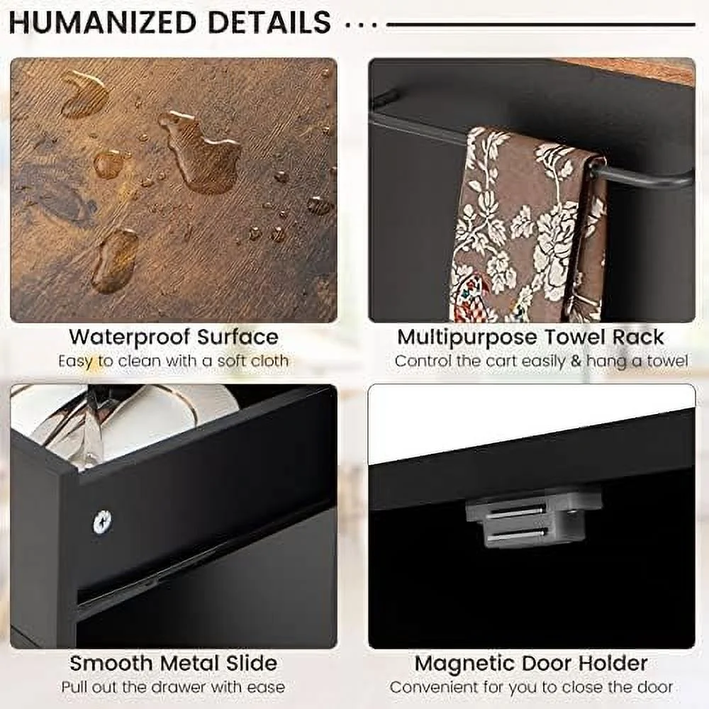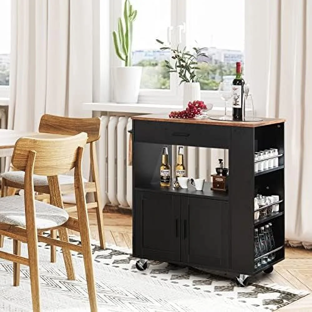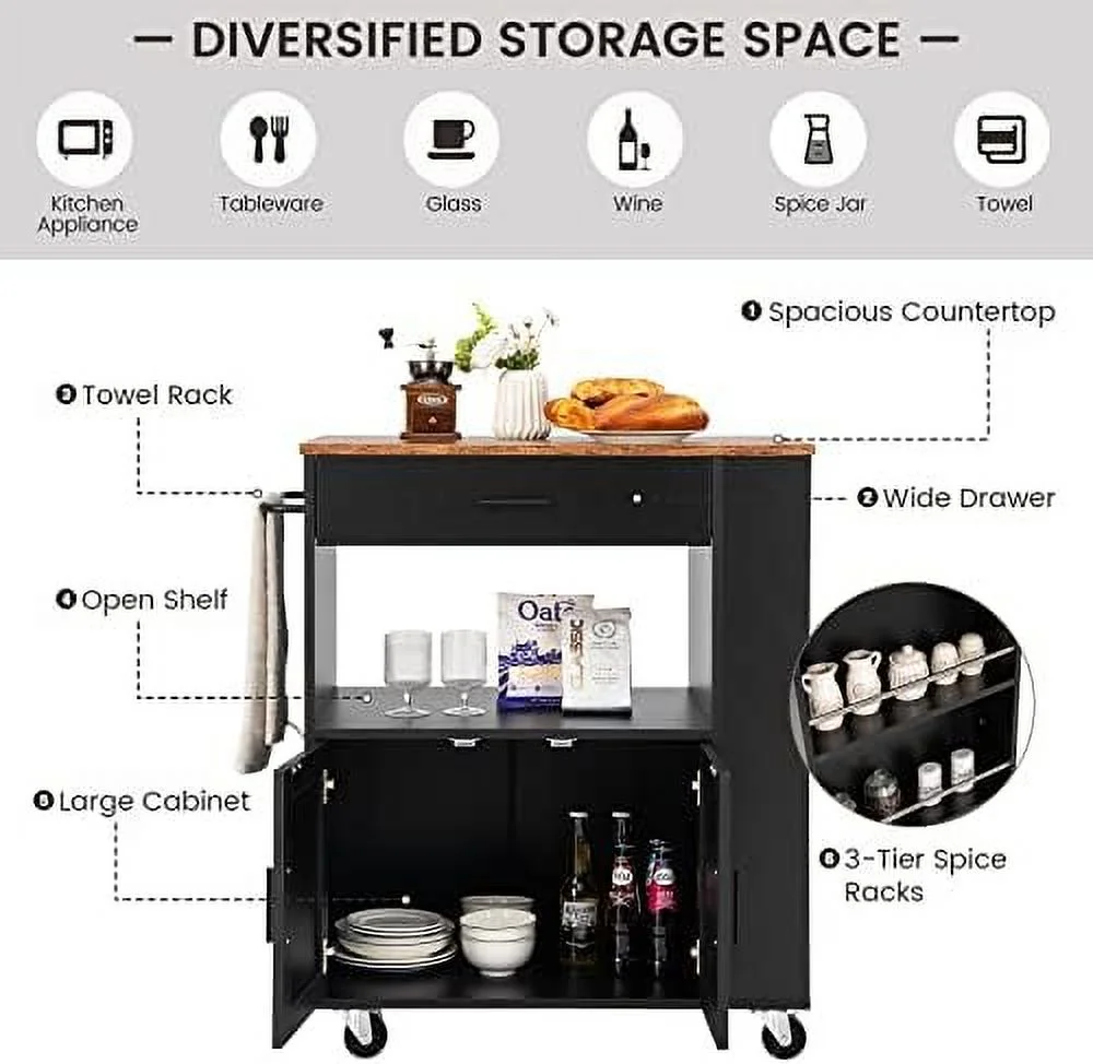 TJUNBOLIFE Kitchen Island on Wheels Rolling Kitchen Trolley with 3 Spice Racks Drawer Open 2-Door Cabinet Kitchen Serving Cart with Towel Rack & 2 Lockable Casters (Black) - Curated Treasures Market