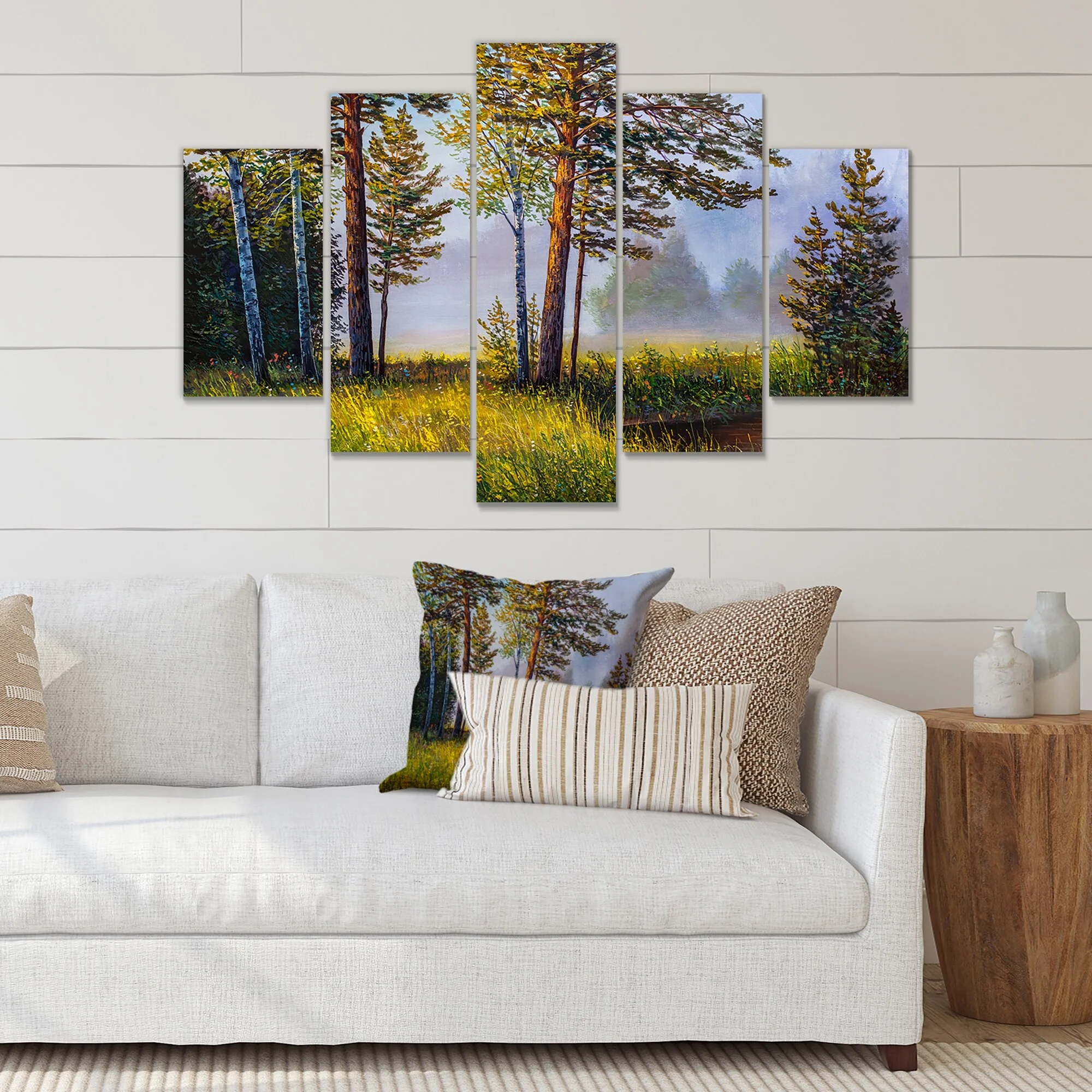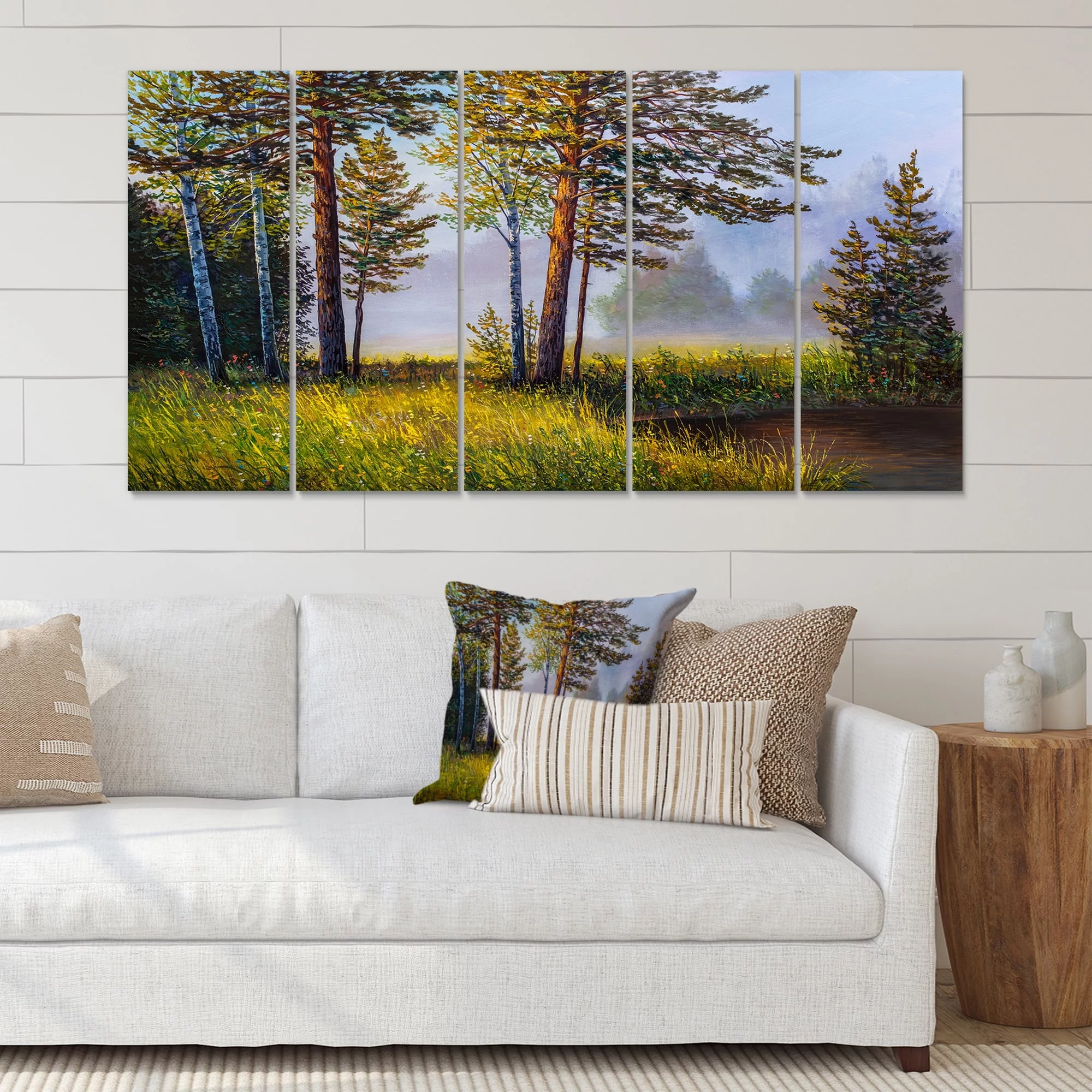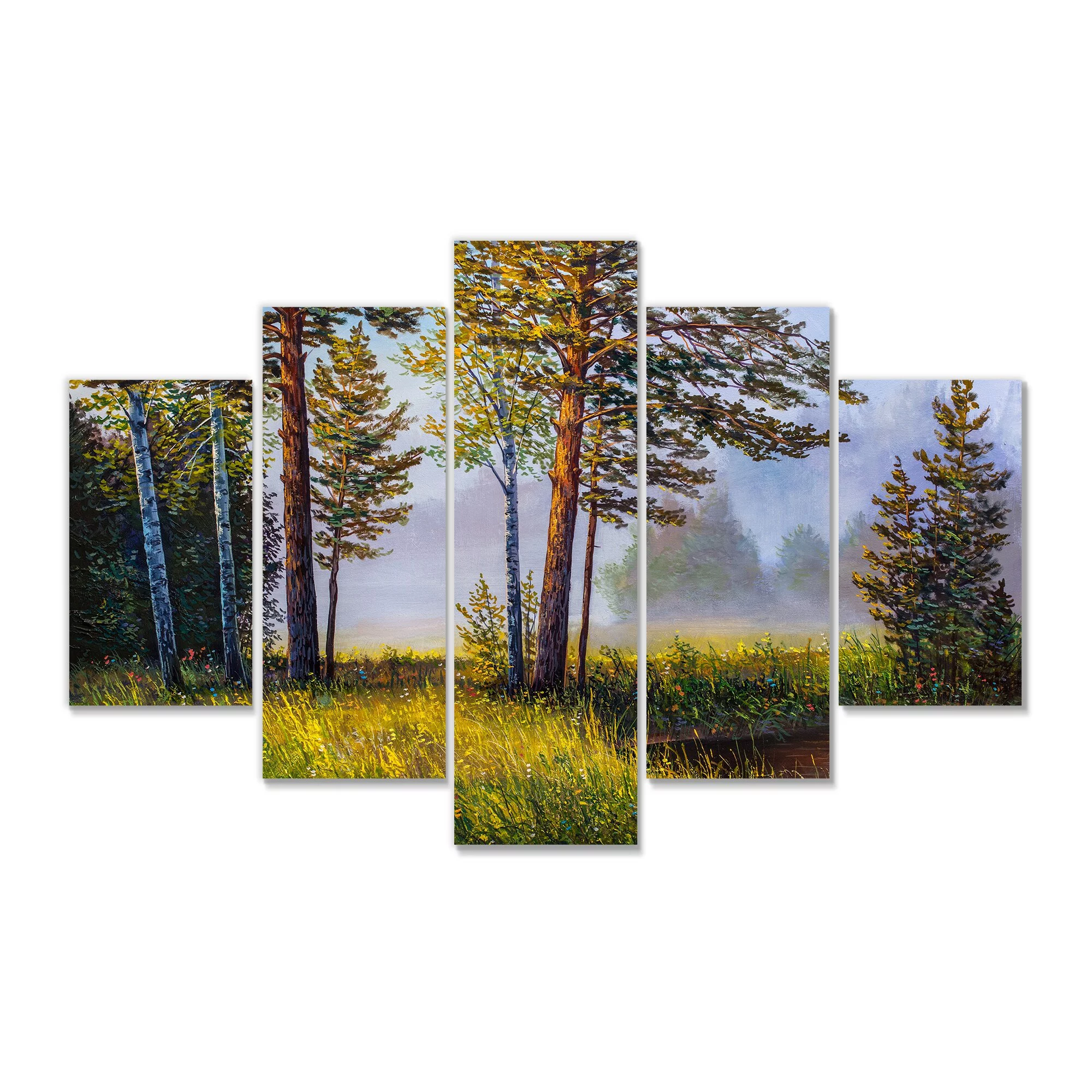 DESIGN ART Designart "Subtle Evening Light Through The Trees III" Lake House Canvas Wall Art Print 60 in. wide x 32 in. high - 5 Panels Diamond Shape - Curated Treasures Market