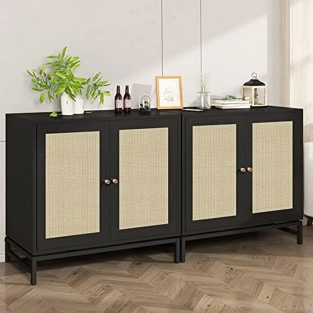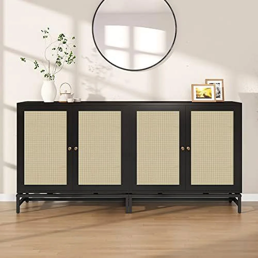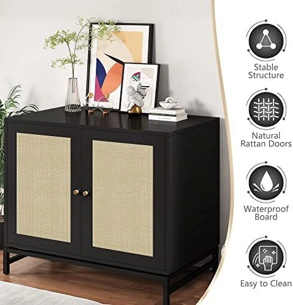 GEROBOOM Black Sideboard Buffet Cabinet with Rattan Cabinet Accent Cabinet with 2 Doors Kitchen Cabinet Console Table with Adjustable Shelves Entryway Cabinet for Dining Room Living Ro - Curated Treasures Market