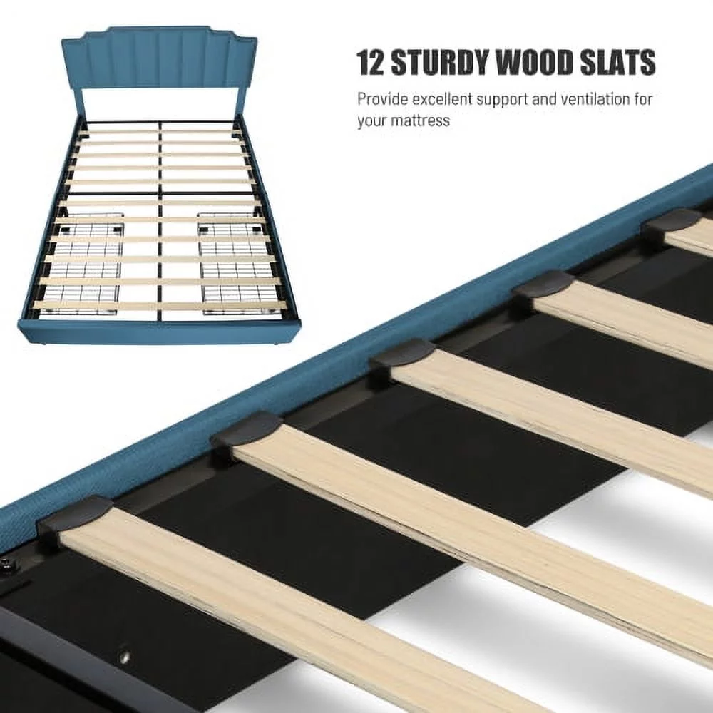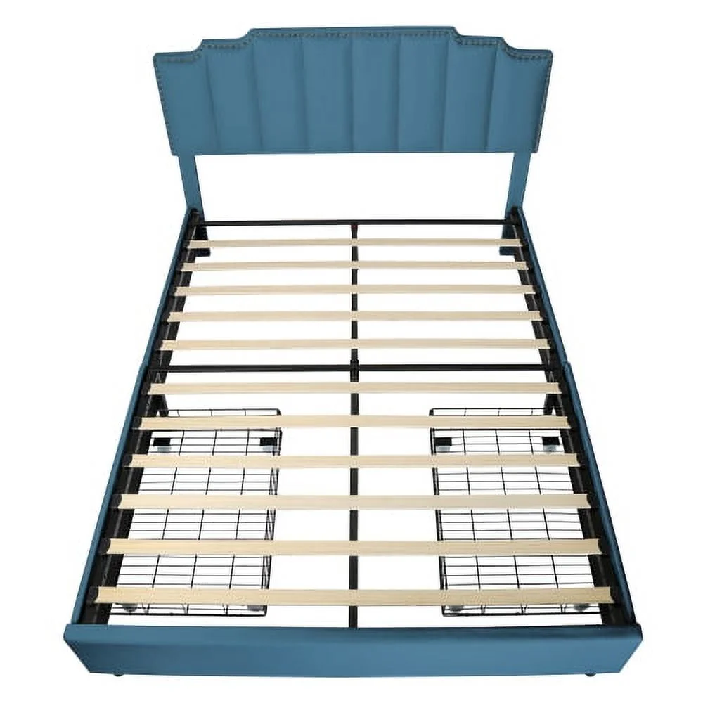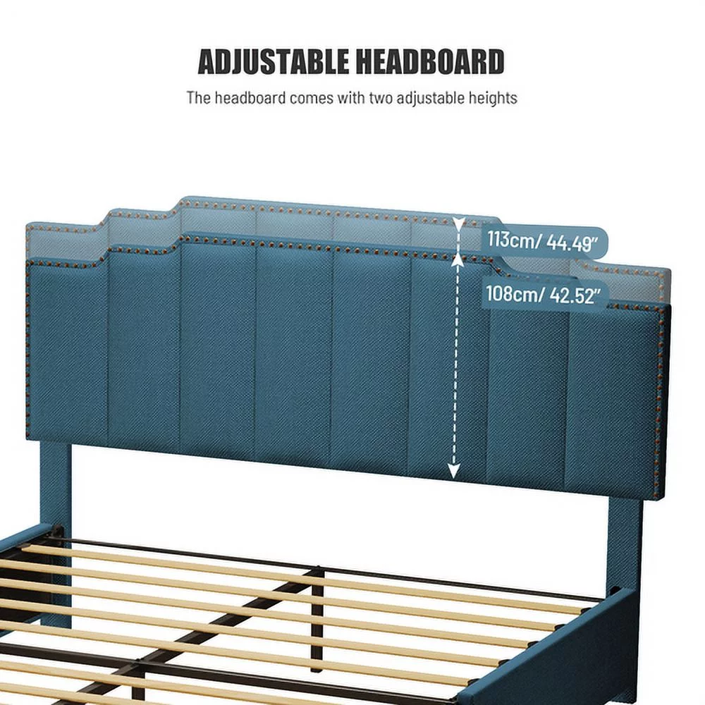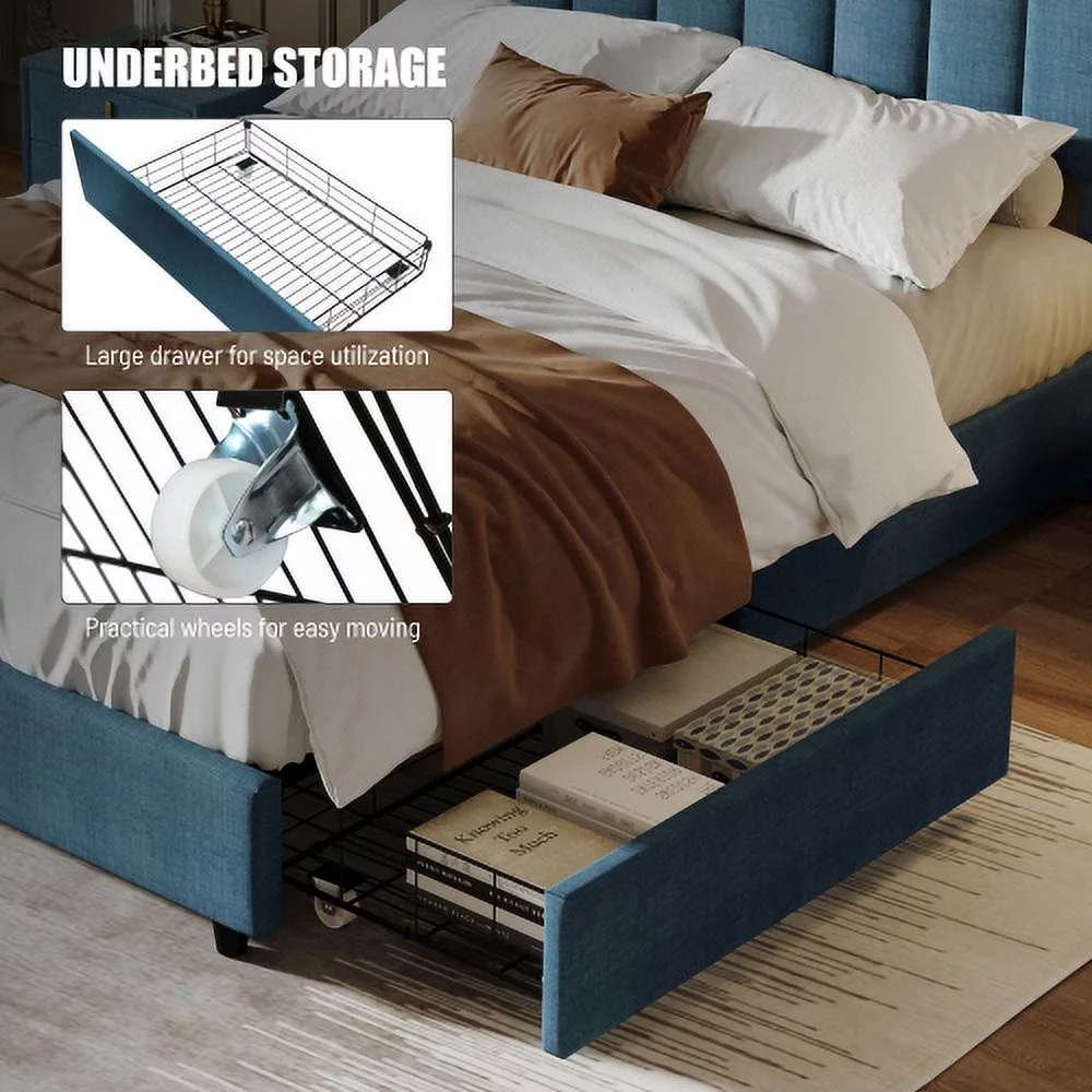 YLtoohoom Queen Size Upholstered Platform Bed Linen Bed Frame with 2 Drawers Stitched Padded Headboard with Rivets Design Strong Bed Slats System No Box Spring Needed Blue - Curated Treasures Market