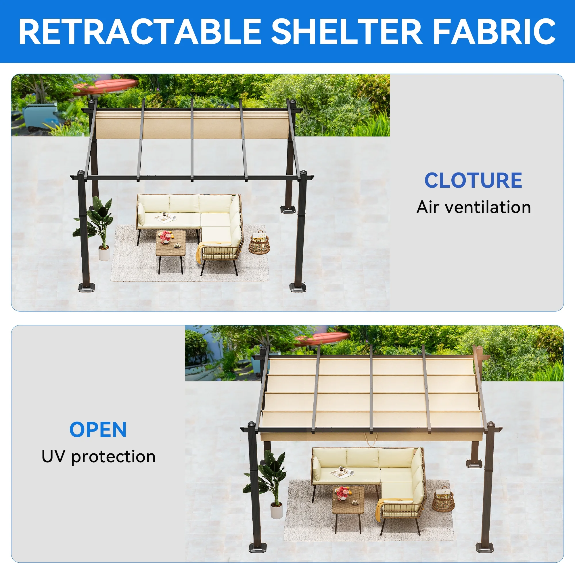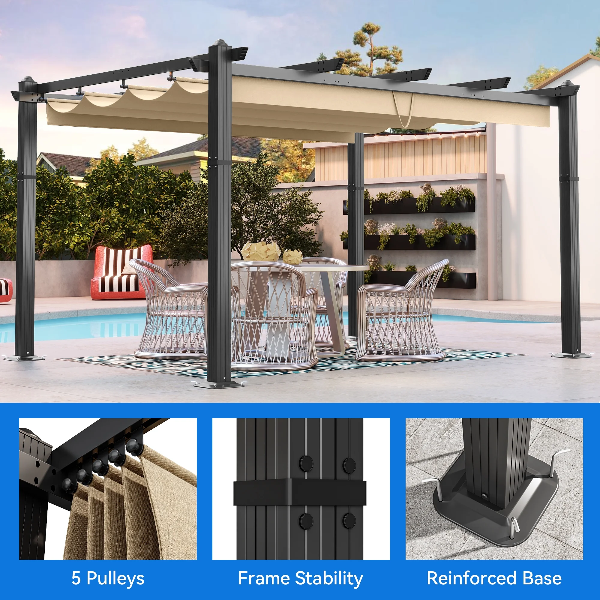 Dextrus 10x13ft Outdoor Aluminum Pergola, Retractable Pergola Canopy Shelter Grape Trellis With Sunshade,Brown Curtain - Curated Treasures Market
