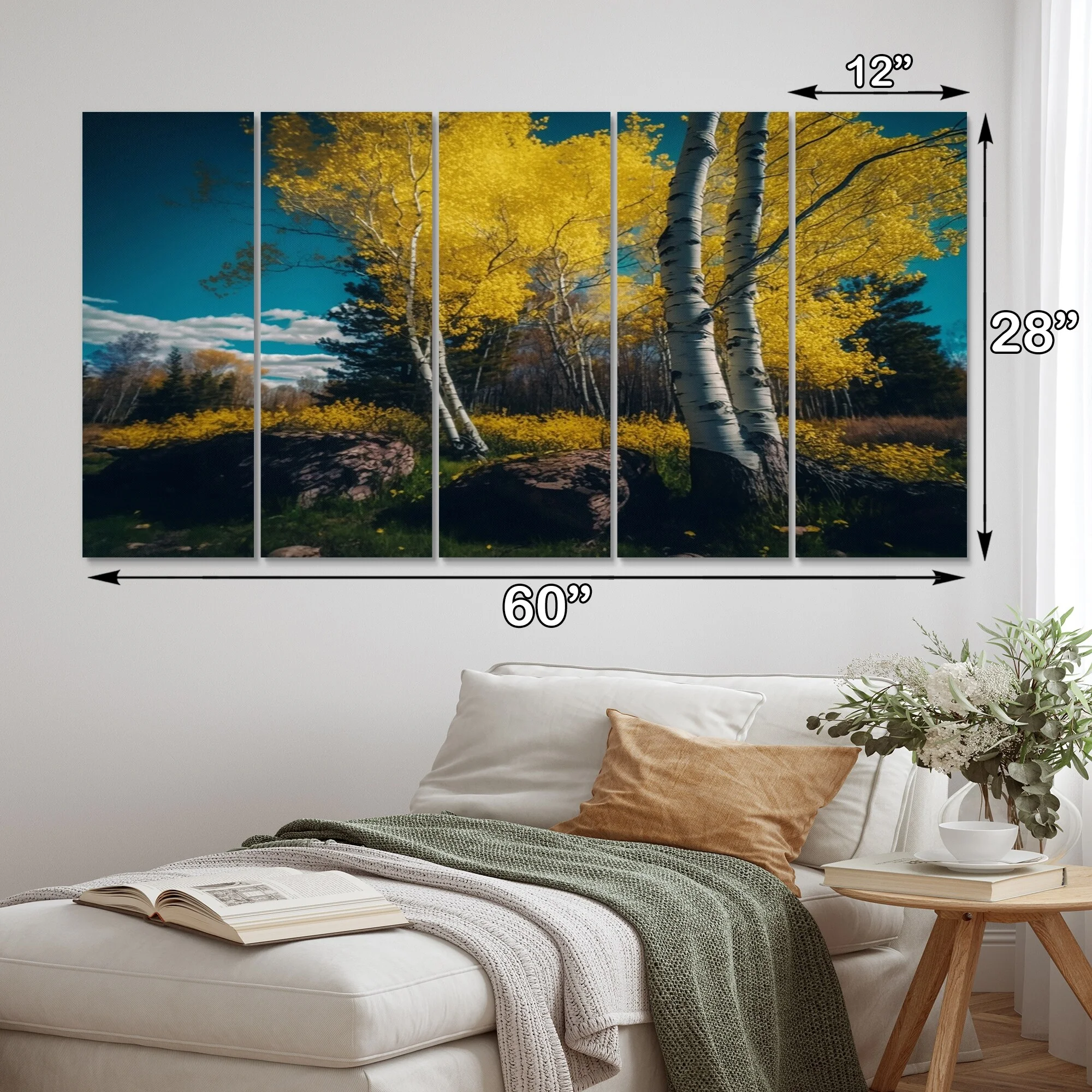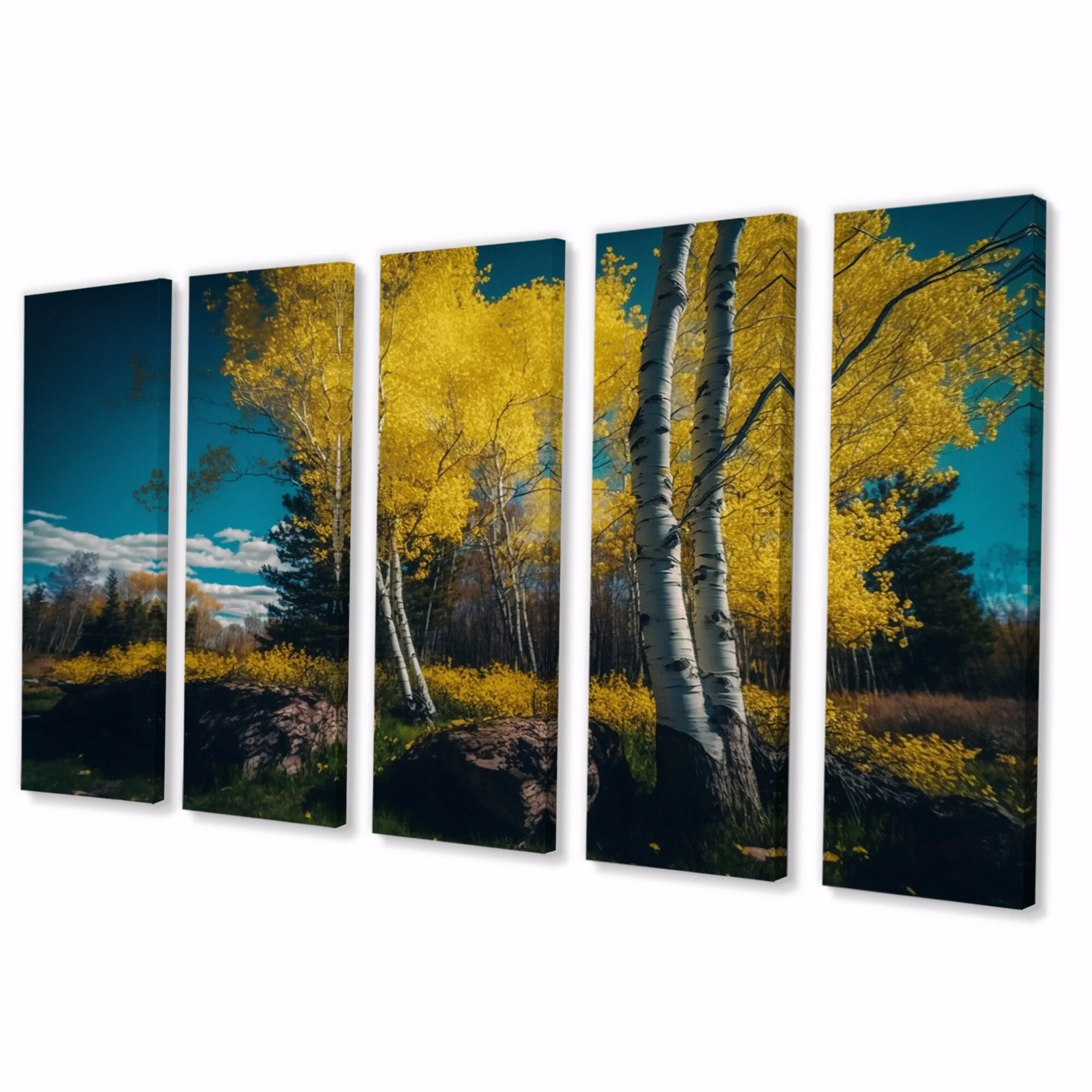 DESIGN ART Designart "Blossoming Birches On A Sunny Lake Day I" Landscape Forest Multipanel Wall Art Prints 60 In. Wide X 32 In. High - 5 Panels - Curated Treasures Market