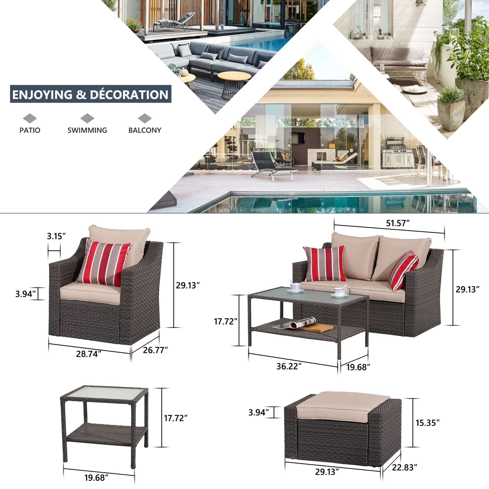 5Pcs Outdoor Patio Furniture Conversation Dining Set Strapping Chairs And Ottoman, Bistro Glass Coffee Table For Poolside Backyard Garden - Curated Treasures Market