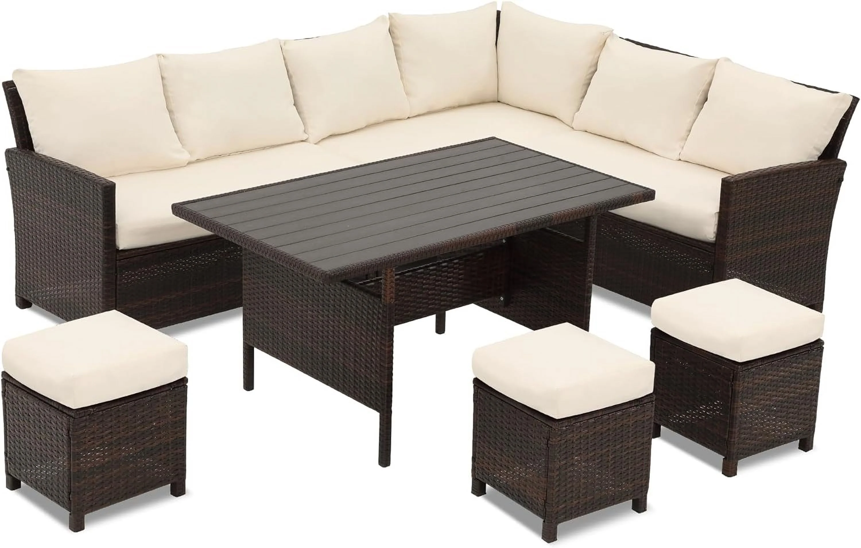 Superjoe Patio Furniture Conversation Set, 7 Piece High Curved Back All Weather Wicker Outdoor Dining Sectional Sofa with Dining Table and Chair, Ivory - Curated Treasures Market