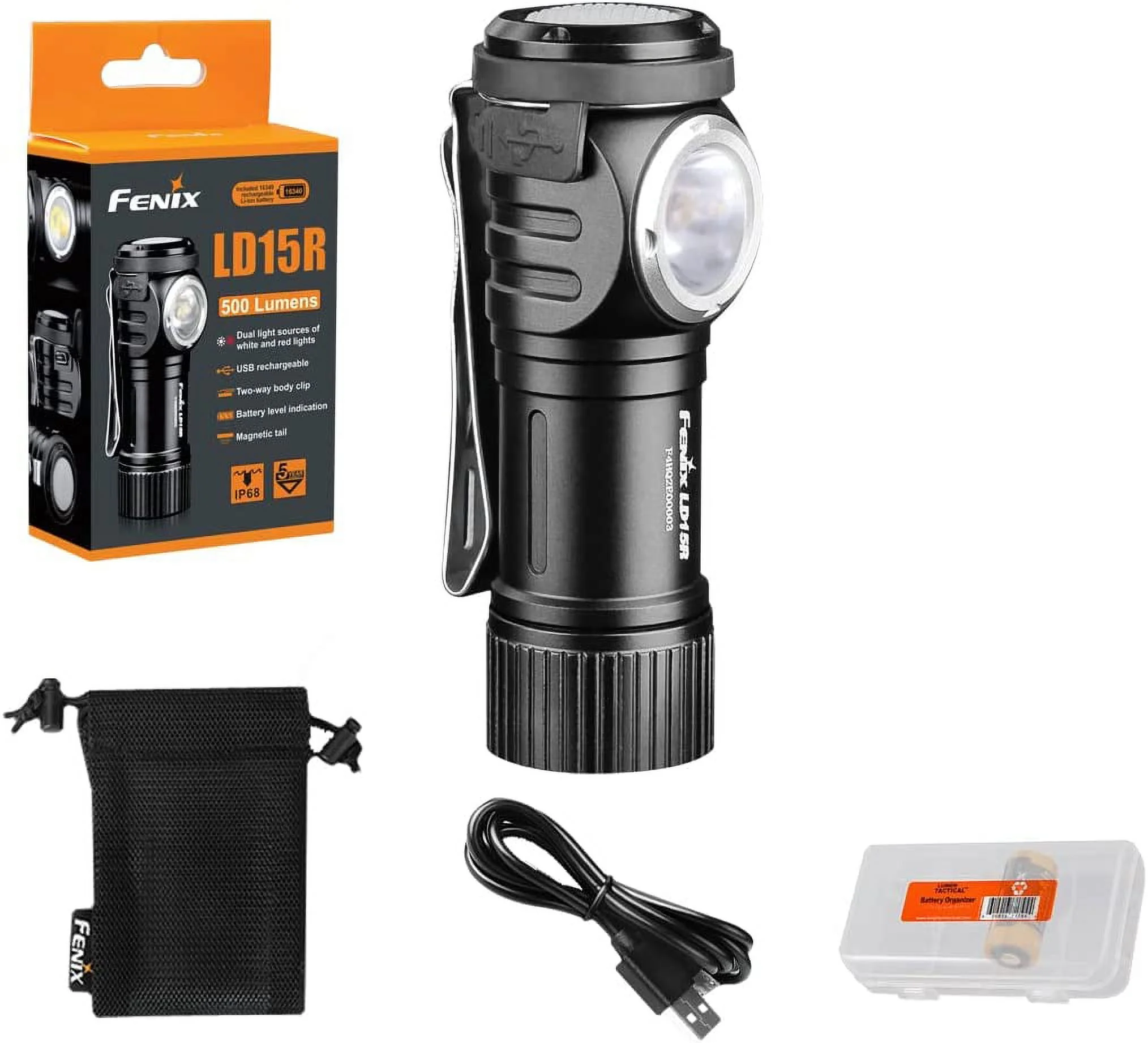 Fenix LD15R Right-Angle Flashlight, 500 Lumen Rechargeable White & Red LEDs Ultra Compact Mini Size, with Clip and LumenTac Organizer - Curated Treasures Market