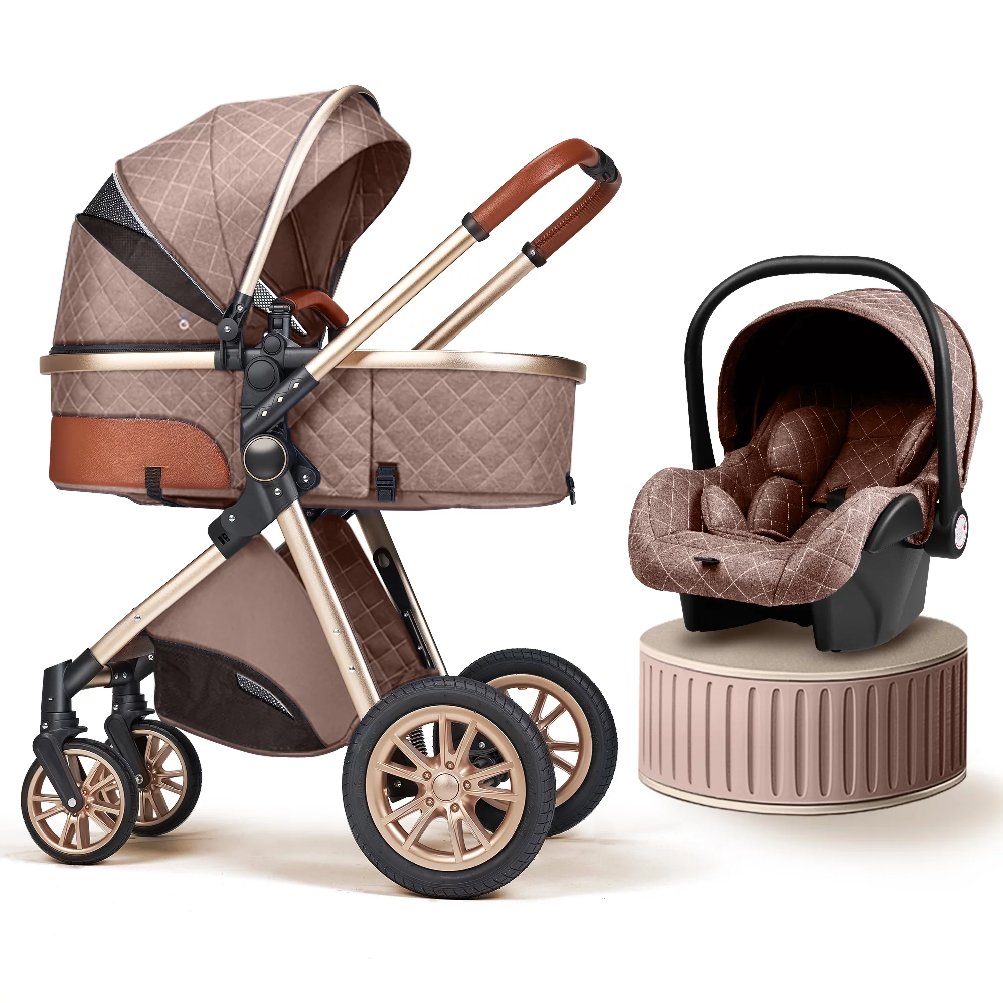 High Landscape Stroller 0-36 Months Kids Unisex Folding Infant Newborn Bassinet Pram(Brown) - Curated Treasures Market