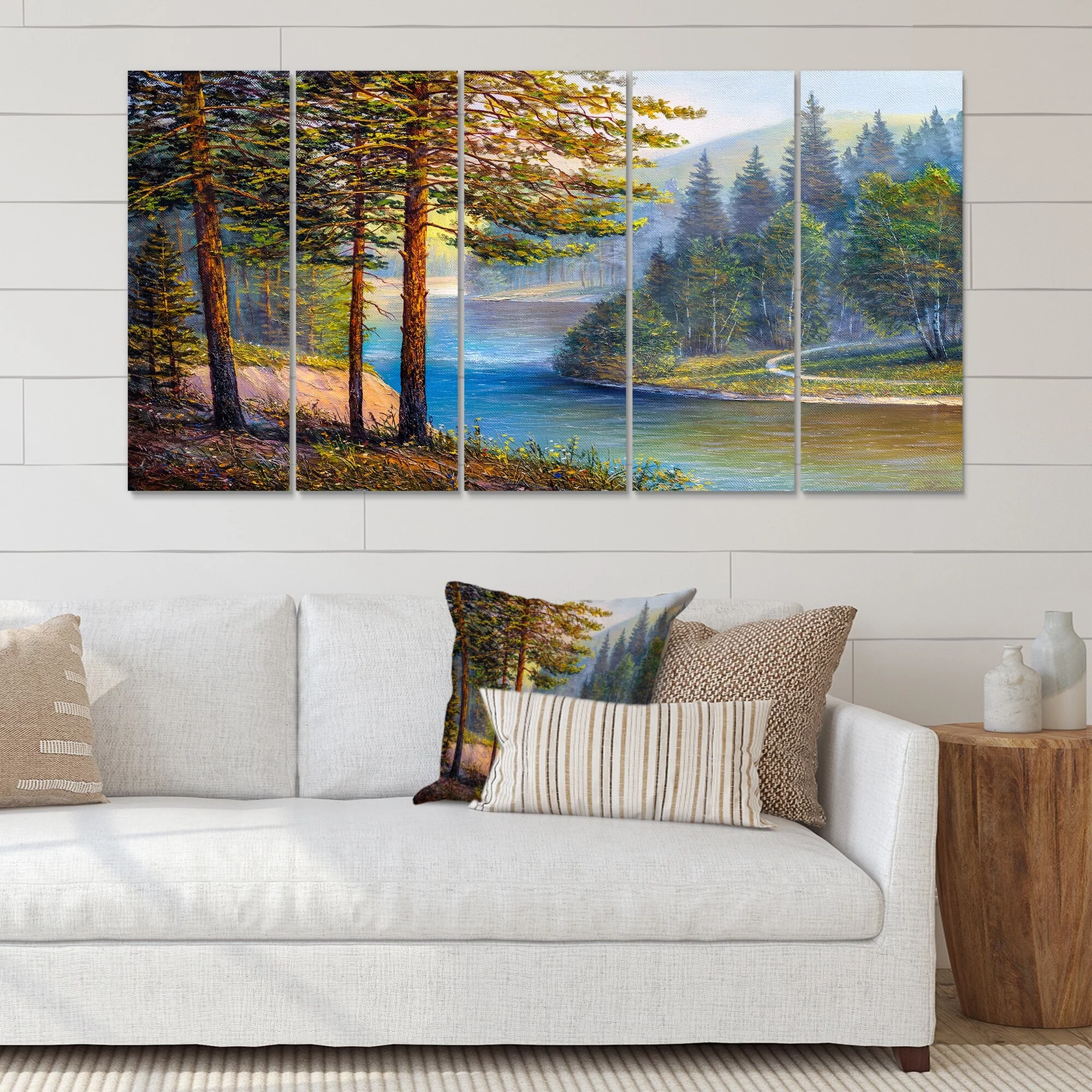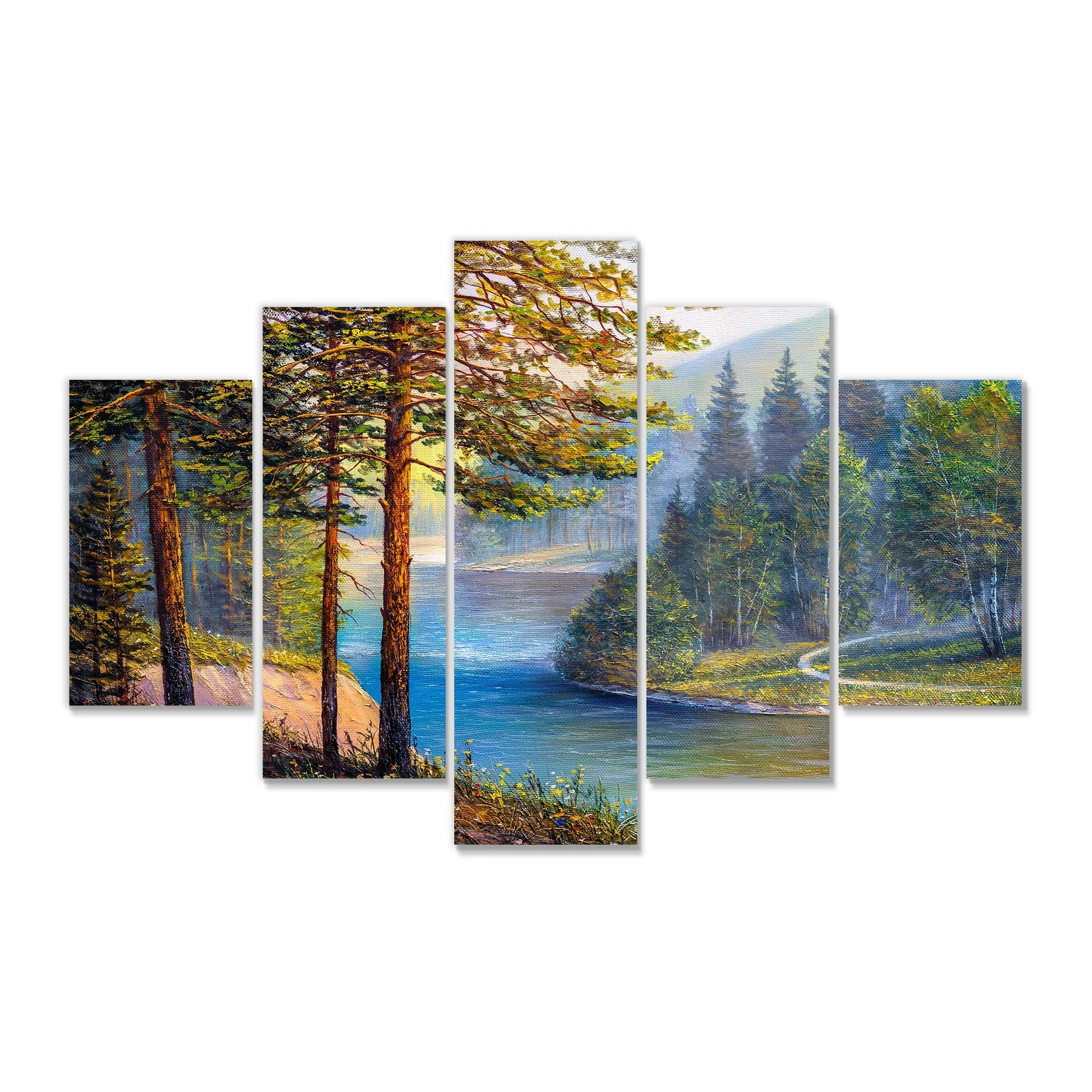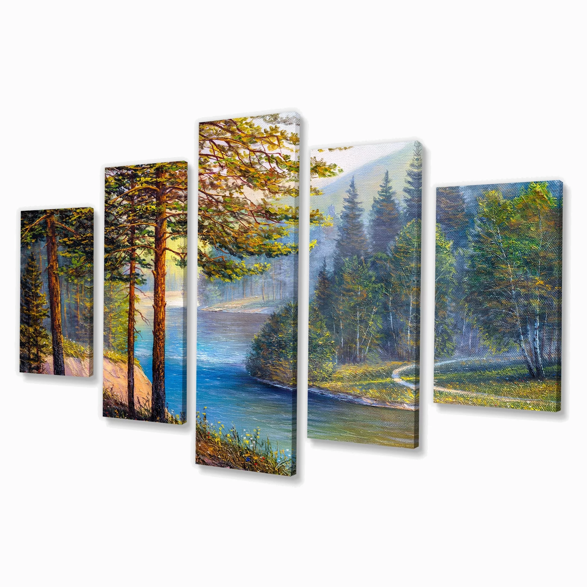 DESIGN ART Designart "Morning Sunlight Through The Pine & Fir Forest" Lake House Canvas Wall Art Print 60 in. wide x 28 in. high - 5 Panels Equal - Curated Treasures Market