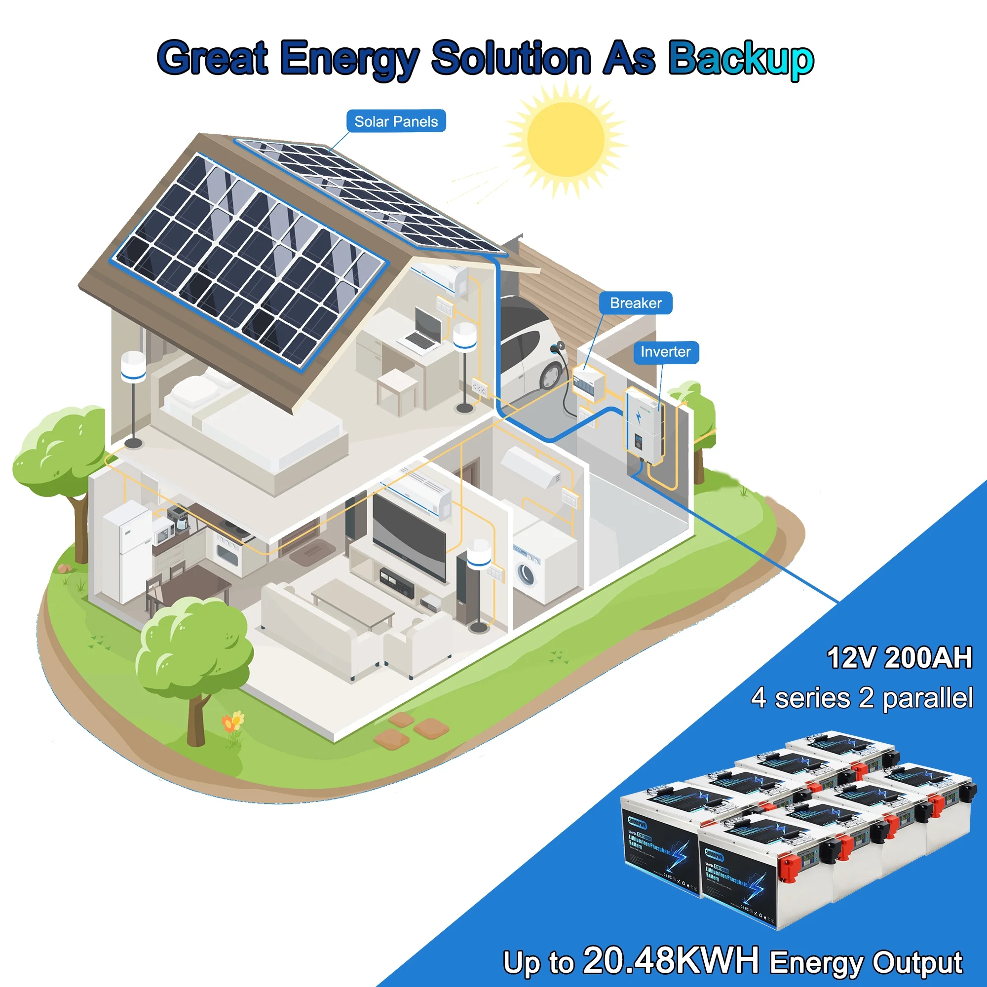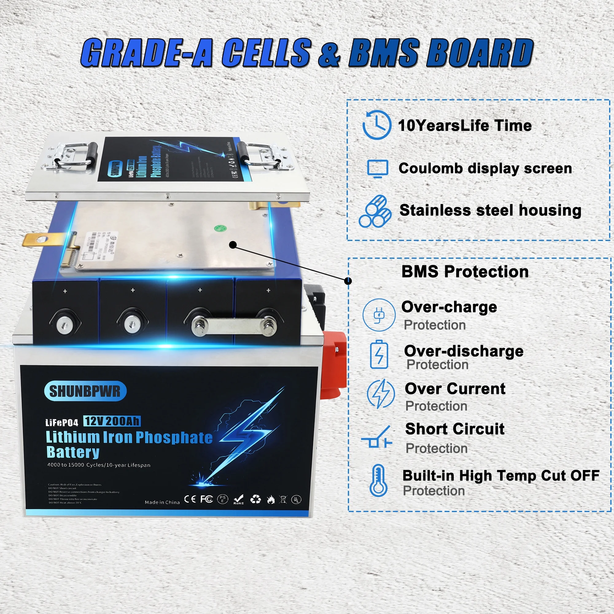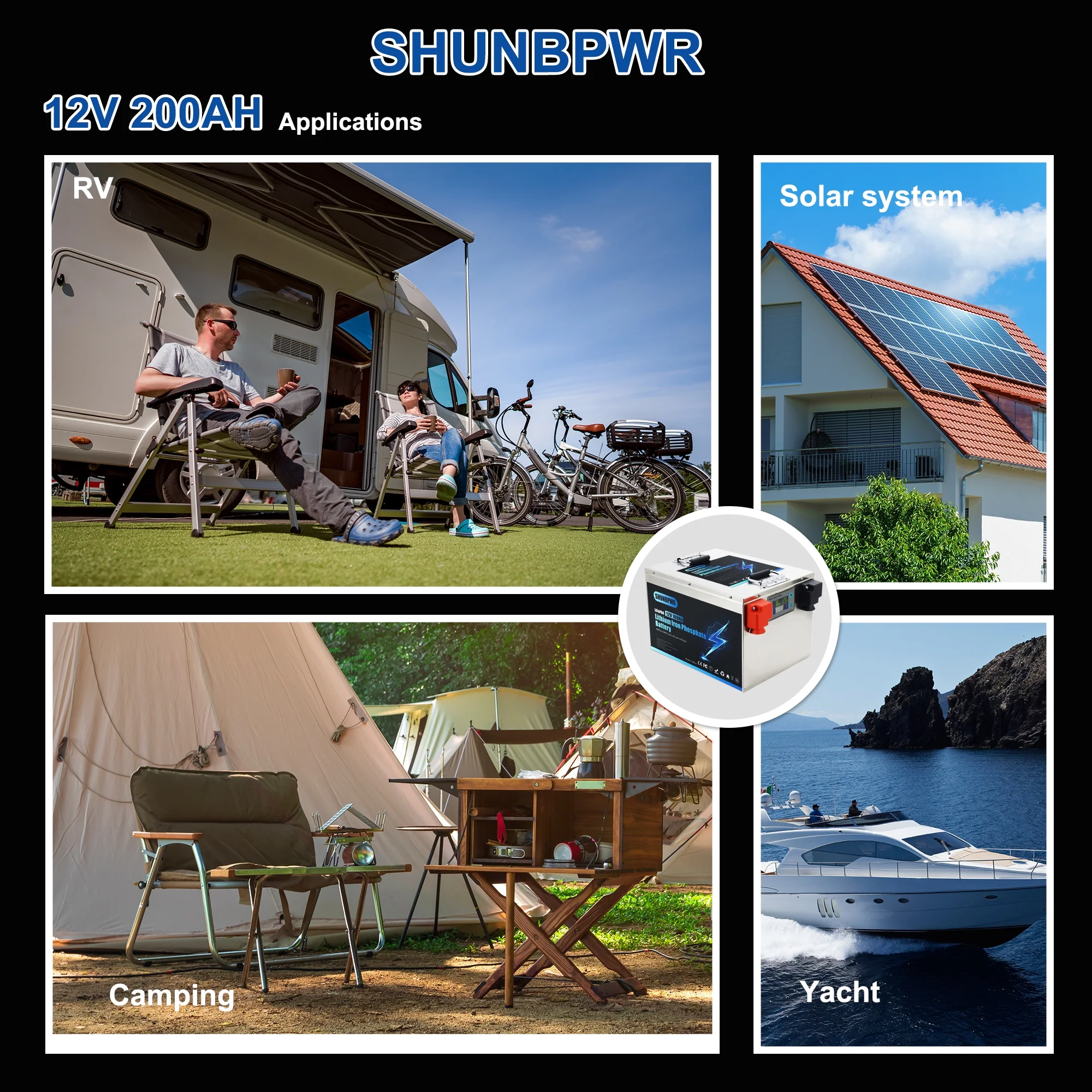 SHUNBPWR Lifepo4 12V 200Ah 2560Wh Lithium Battery Built-in 200A BMS Low Temperature Charging 15000+ Deep Cycle Battery for RV Trolling Motor Solar Golf Cart Backup power system - Curated Treasures Market