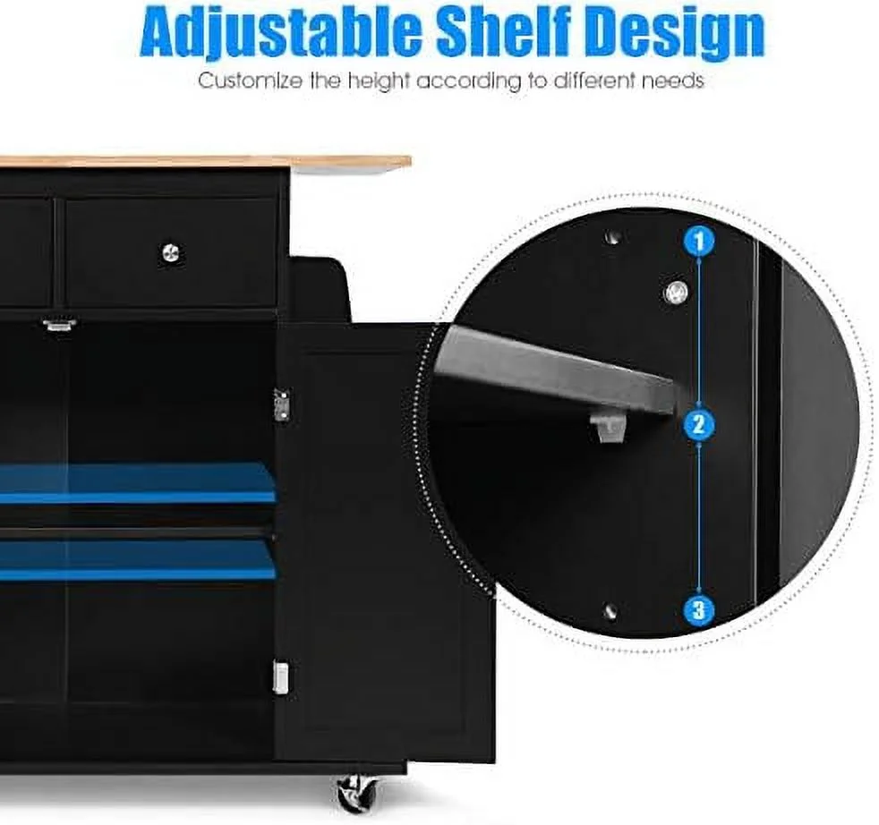 JDZHAPPYLIFE Kitchen Island Cart Rolling Wood Trolley with Cabinet Towel Handle 2 Drawers Side Spice Rack and Wine Bottle Rack Kitchen Cart on Wheels Rubber Wood Countertop (Black) - Curated Treasures Market
