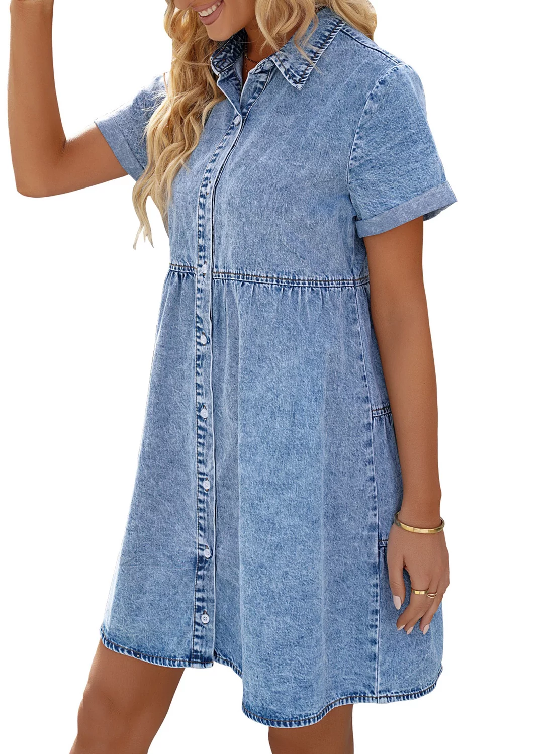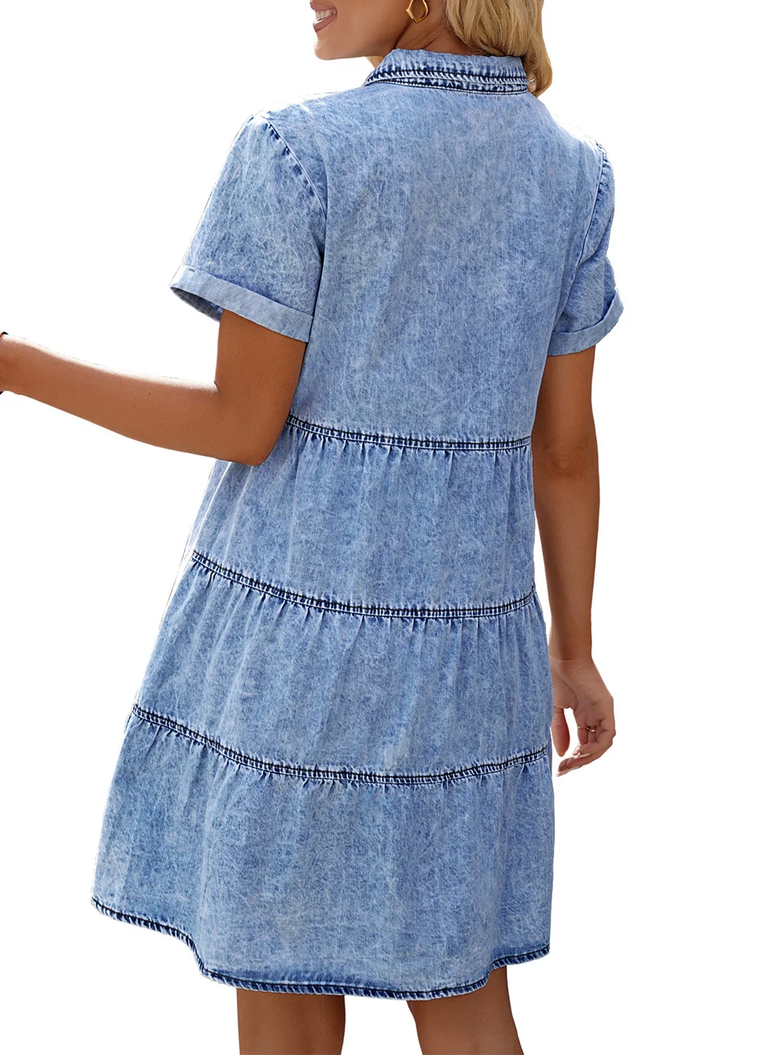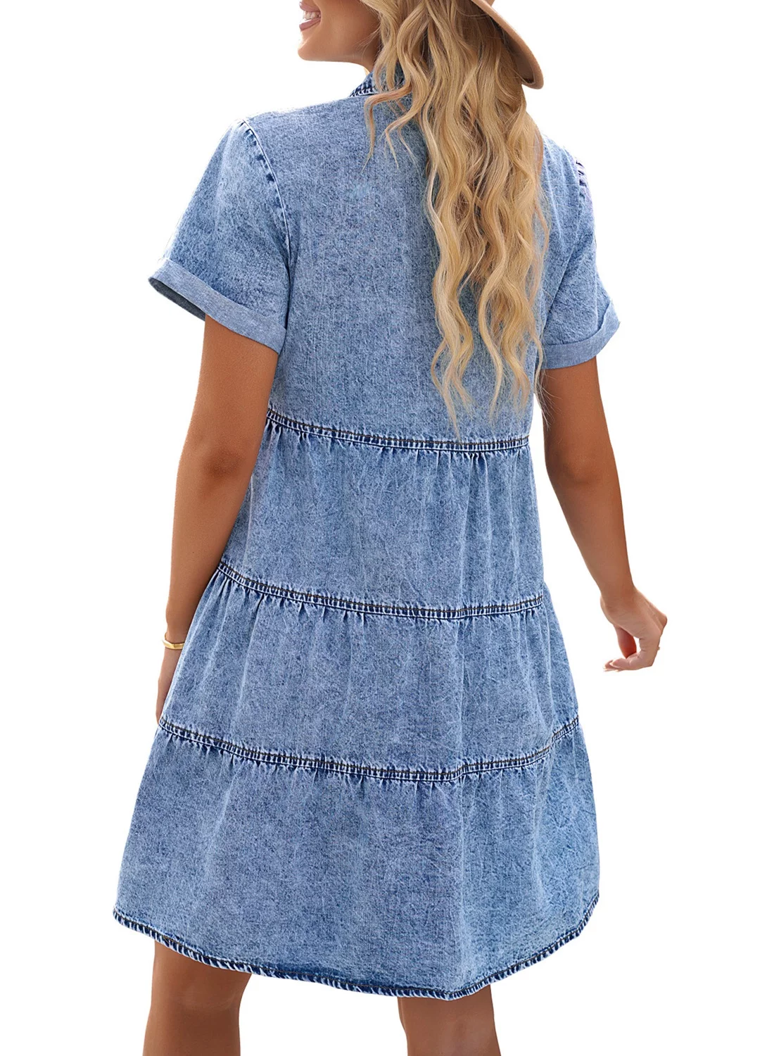 LookbookStore Women s Babydoll Tiered Short Sleeve Denim Dress Button Down Tunic Dress Size XL Size 16 Size 18 - Curated Treasures Market