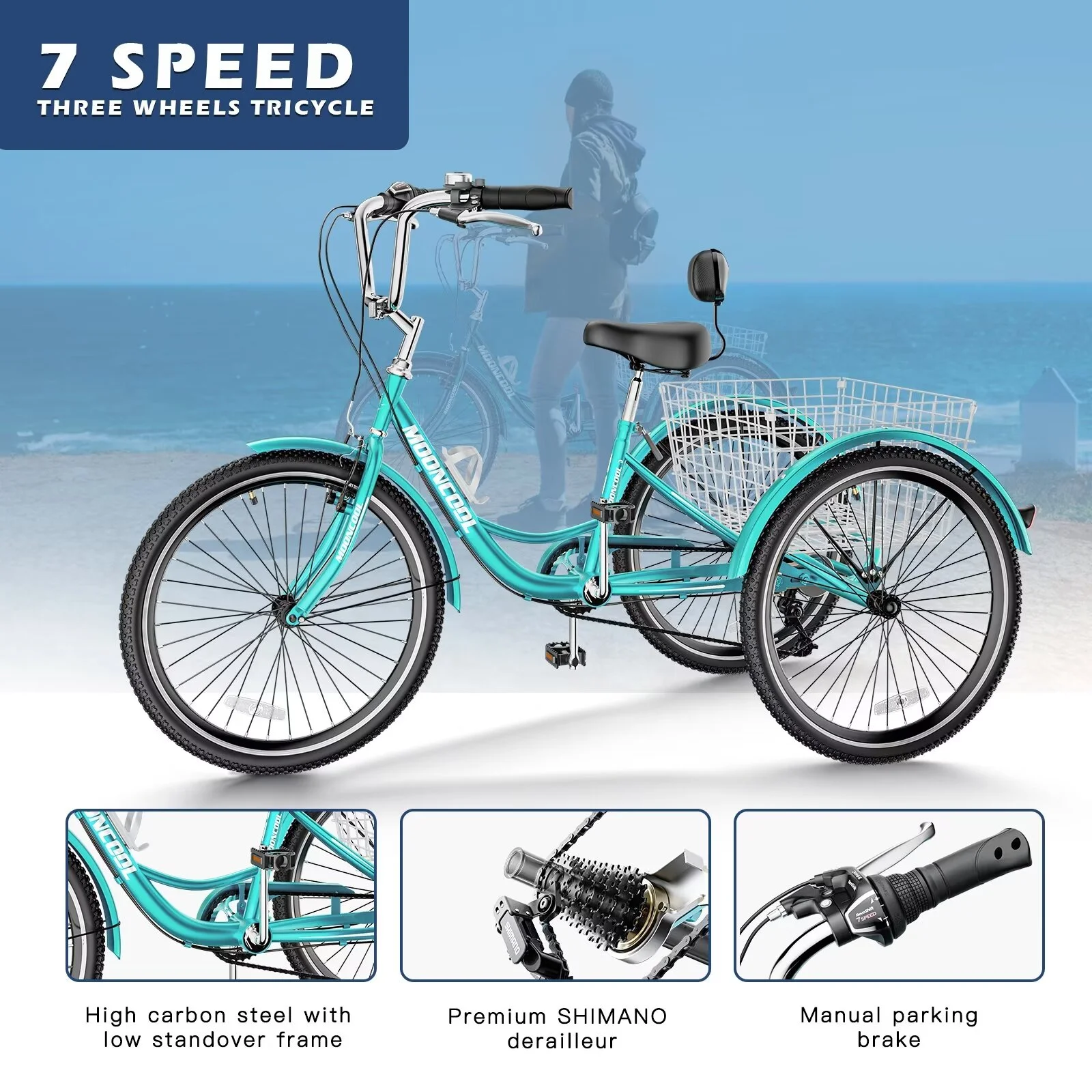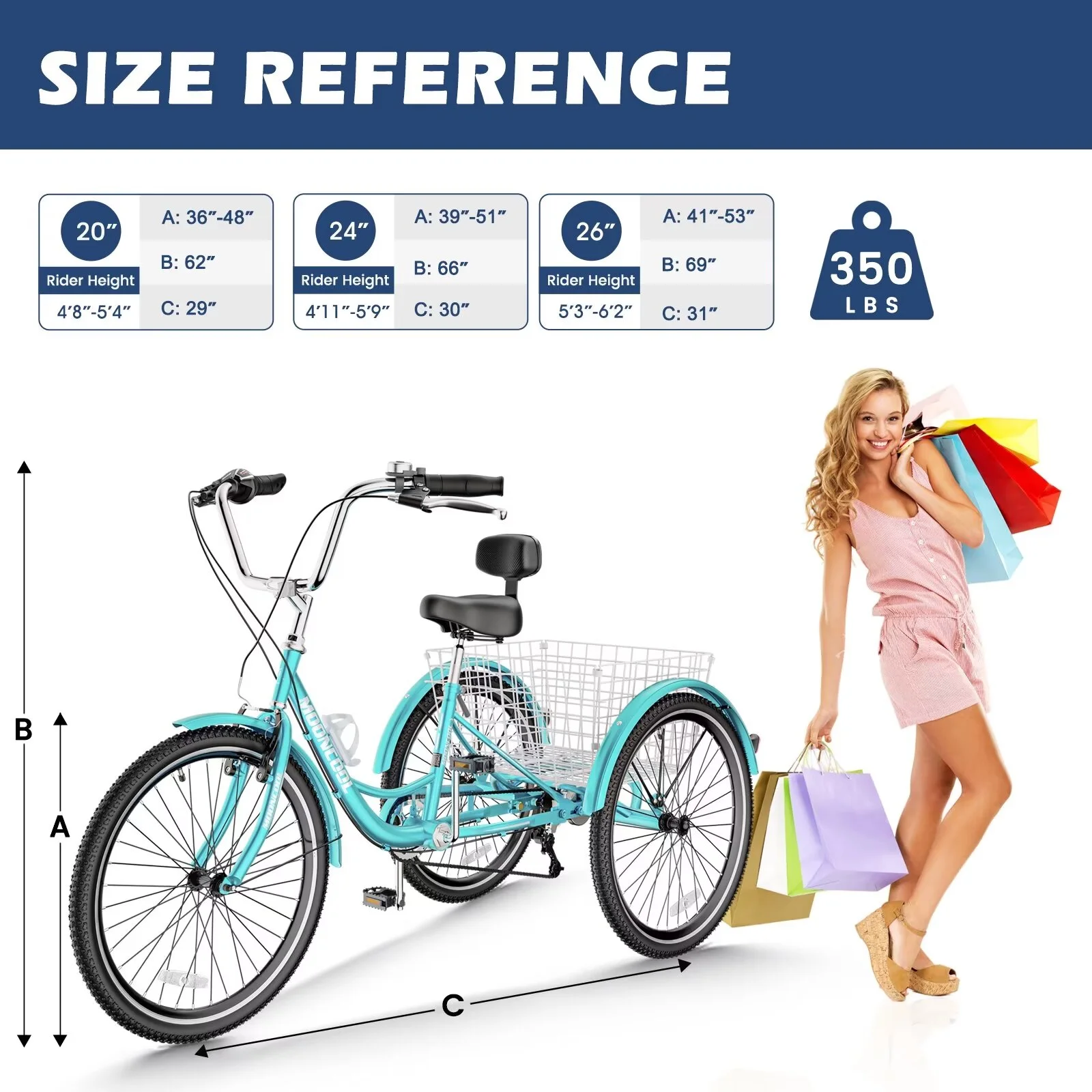 MOPHOTO 20''/24''/26'' Tricycle for Adults, 7 Speed 3-Wheel Bike, Comfort Cruiser Trike, Cyan Tricycle with Big Basket - Curated Treasures Market