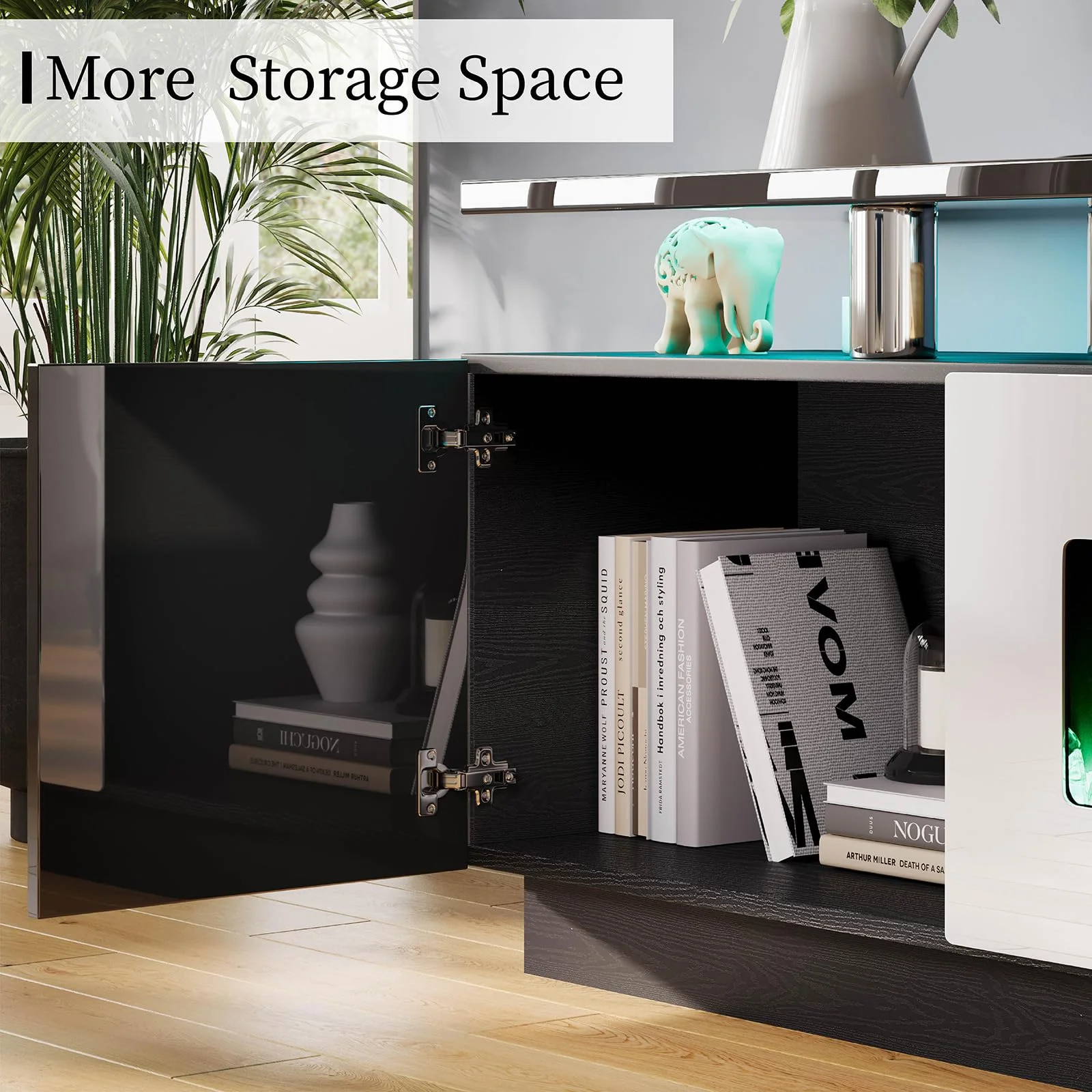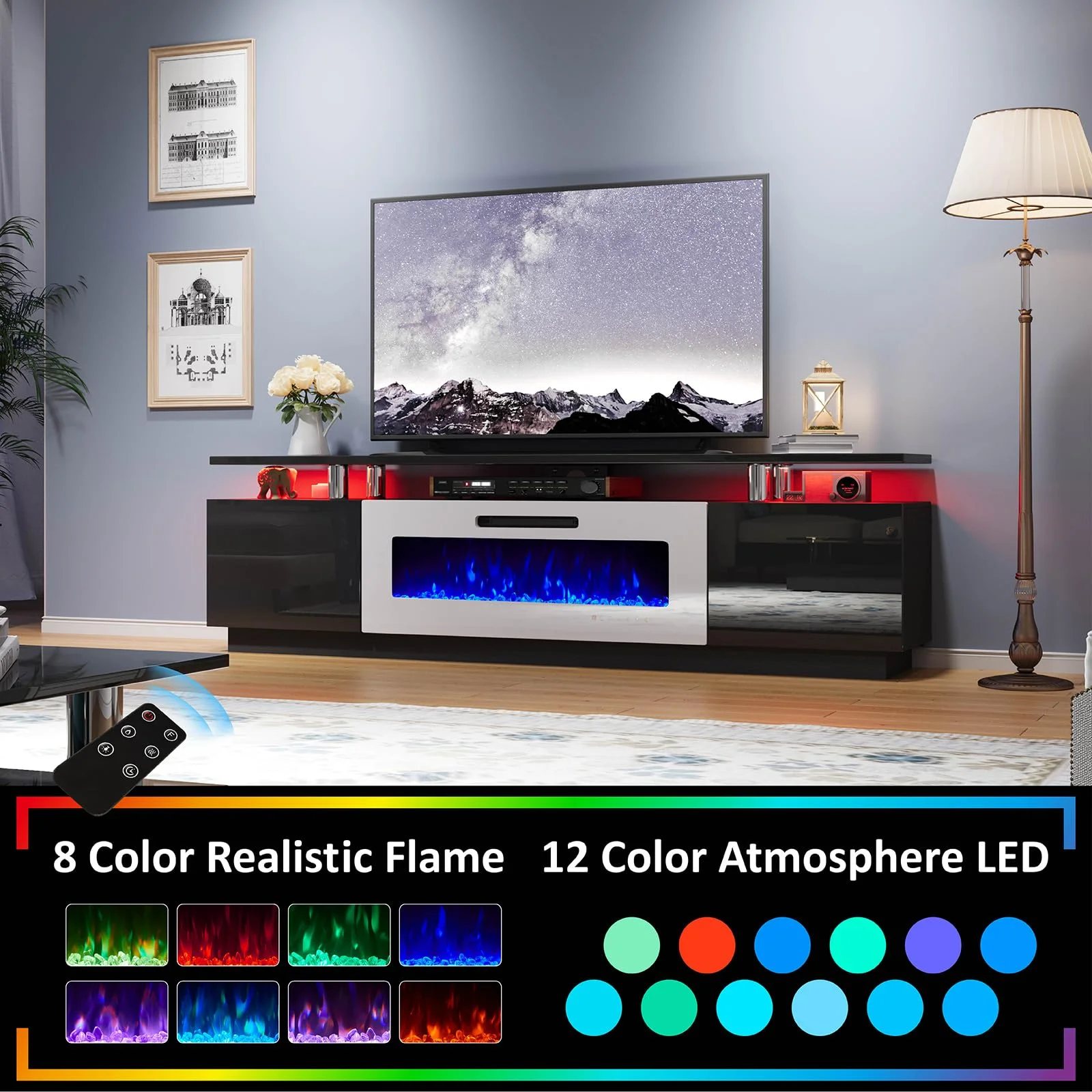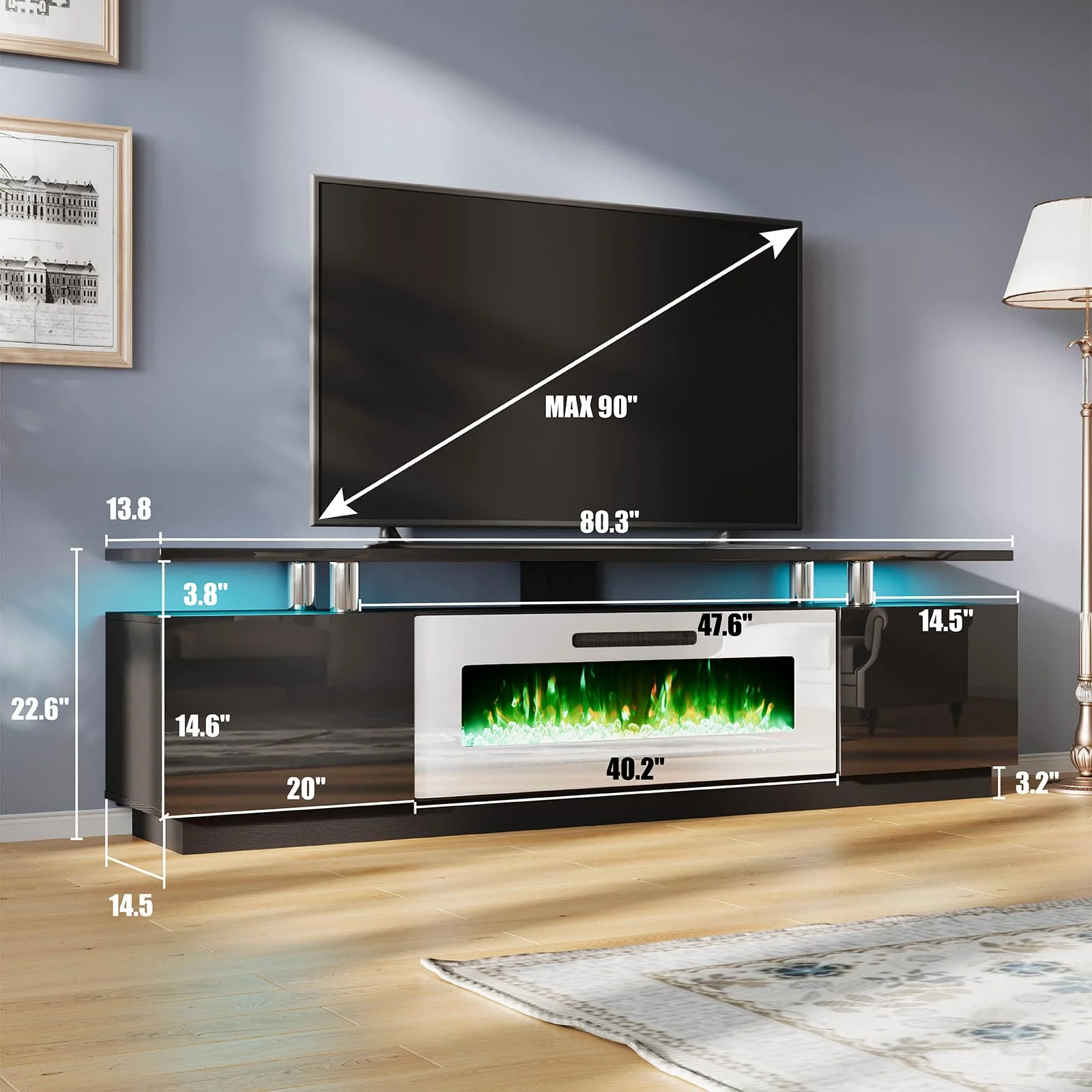 AMERLIFE 2 Tiers Fireplace TV Stand with 40" Fireplace,80" Modern High Gloss Entertainment Center for TVs up to 90", Black & White - Curated Treasures Market