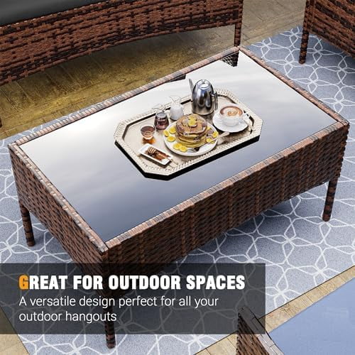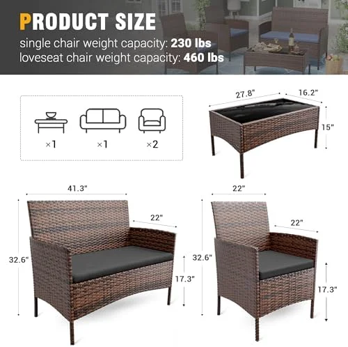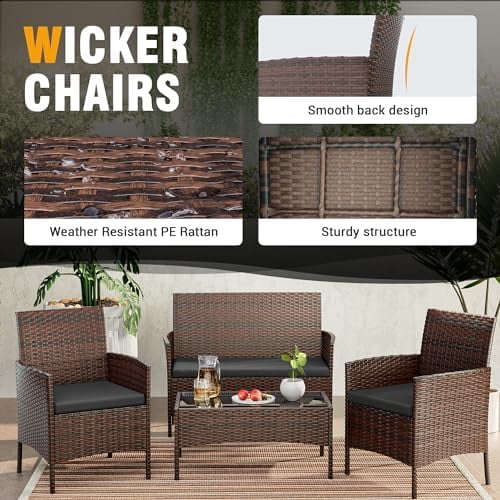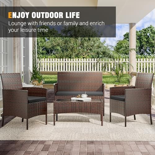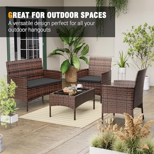 WTYNKAE Patio 4 Pieces Outdoor Rattan Chair Wicker Sofa Sectional Conversation Porch Loveseat w Cushions and Table for Backyard Balcony Pool Garden (Brown-Grey) - Curated Treasures Market