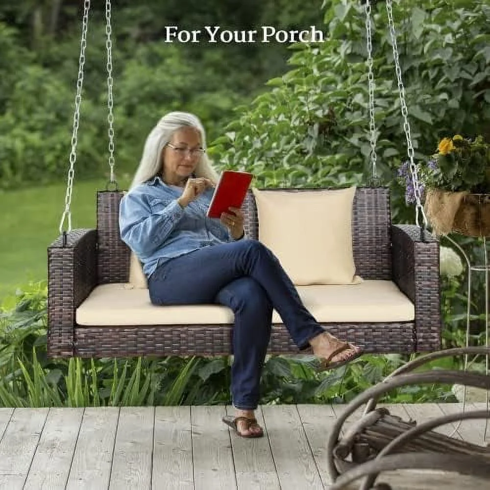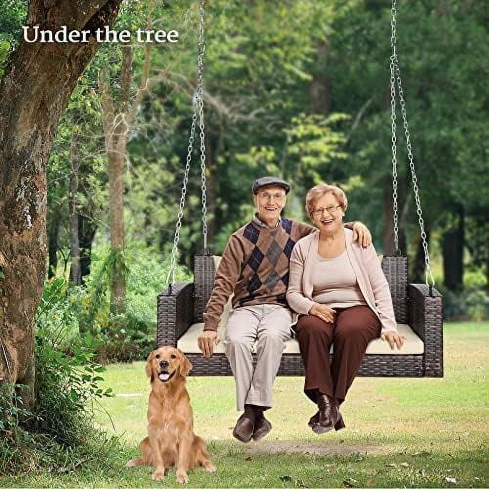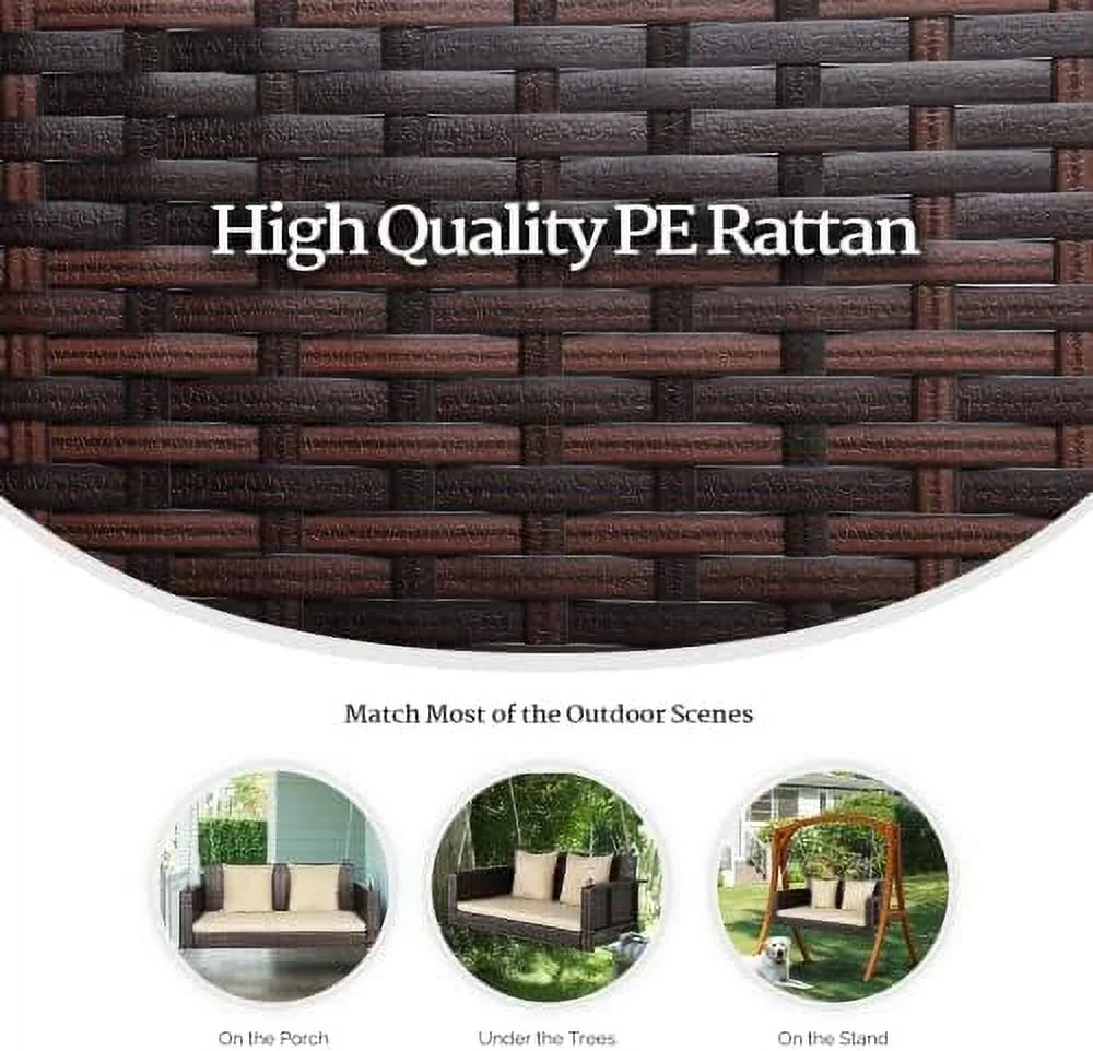 JDZHAPPYLIFE Heavy Duty 800 LBS Wicker Hanging Porch Swing with Cushions & Chains 4FT Outdoor Rattan Swing Bench for Garden Yard Lawn (Black+Blue) - Curated Treasures Market