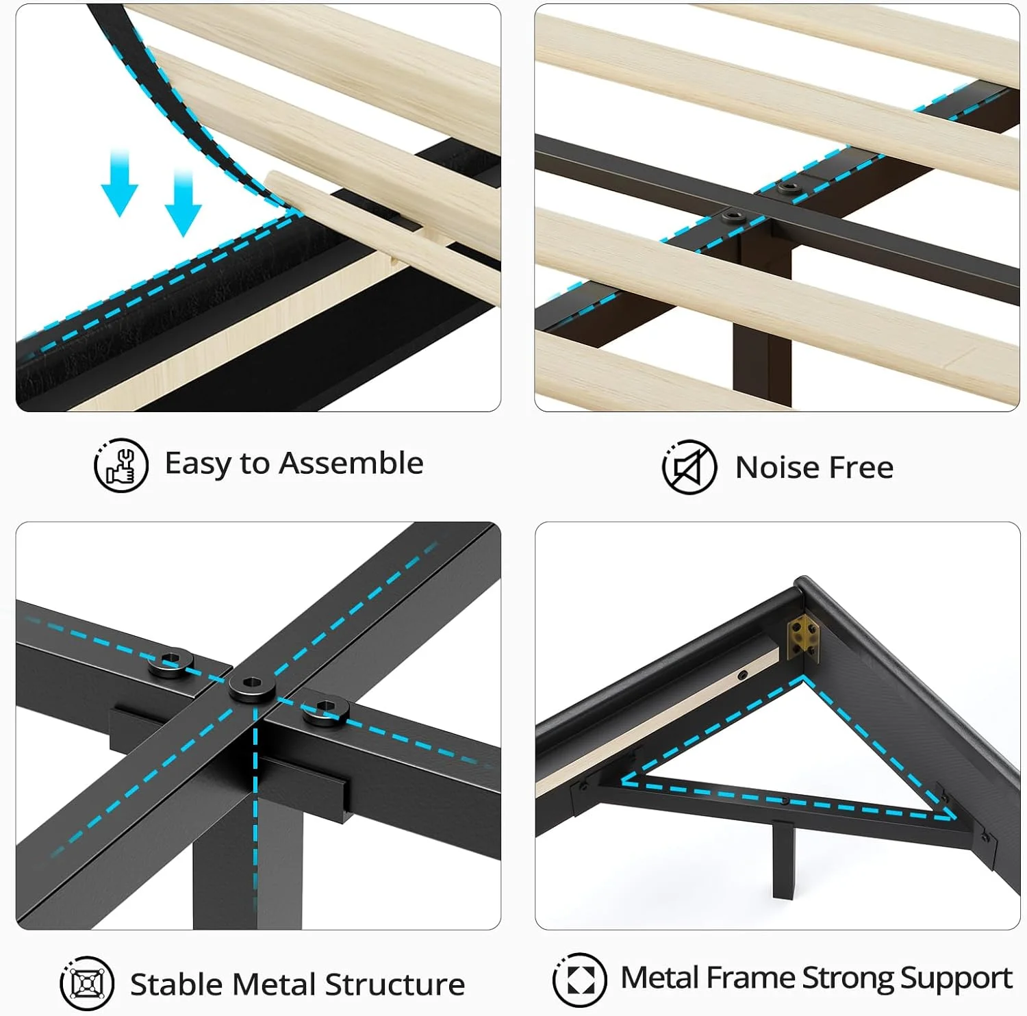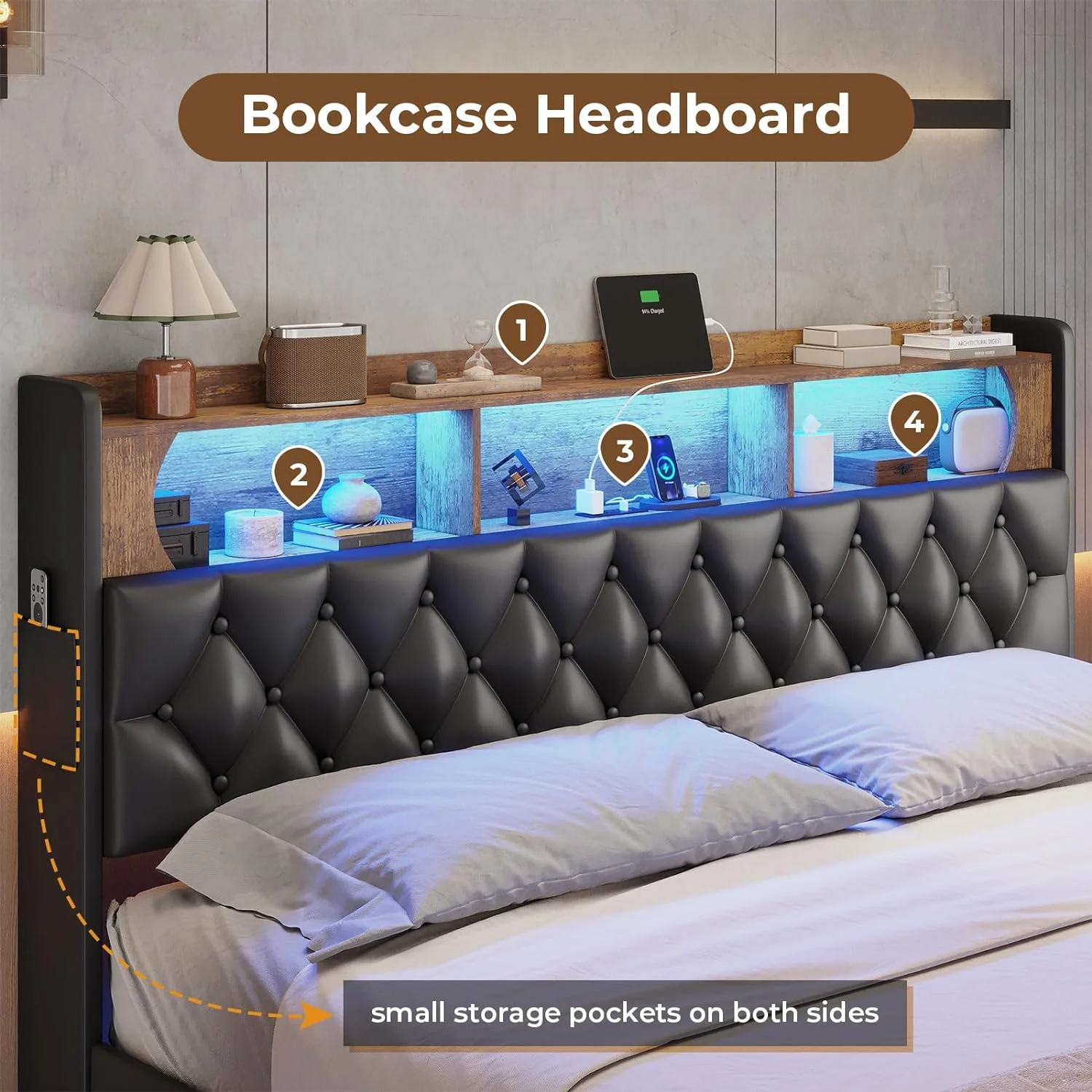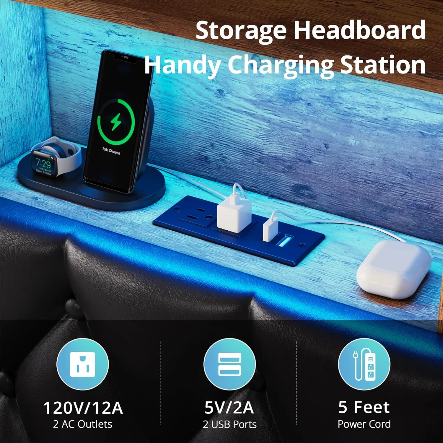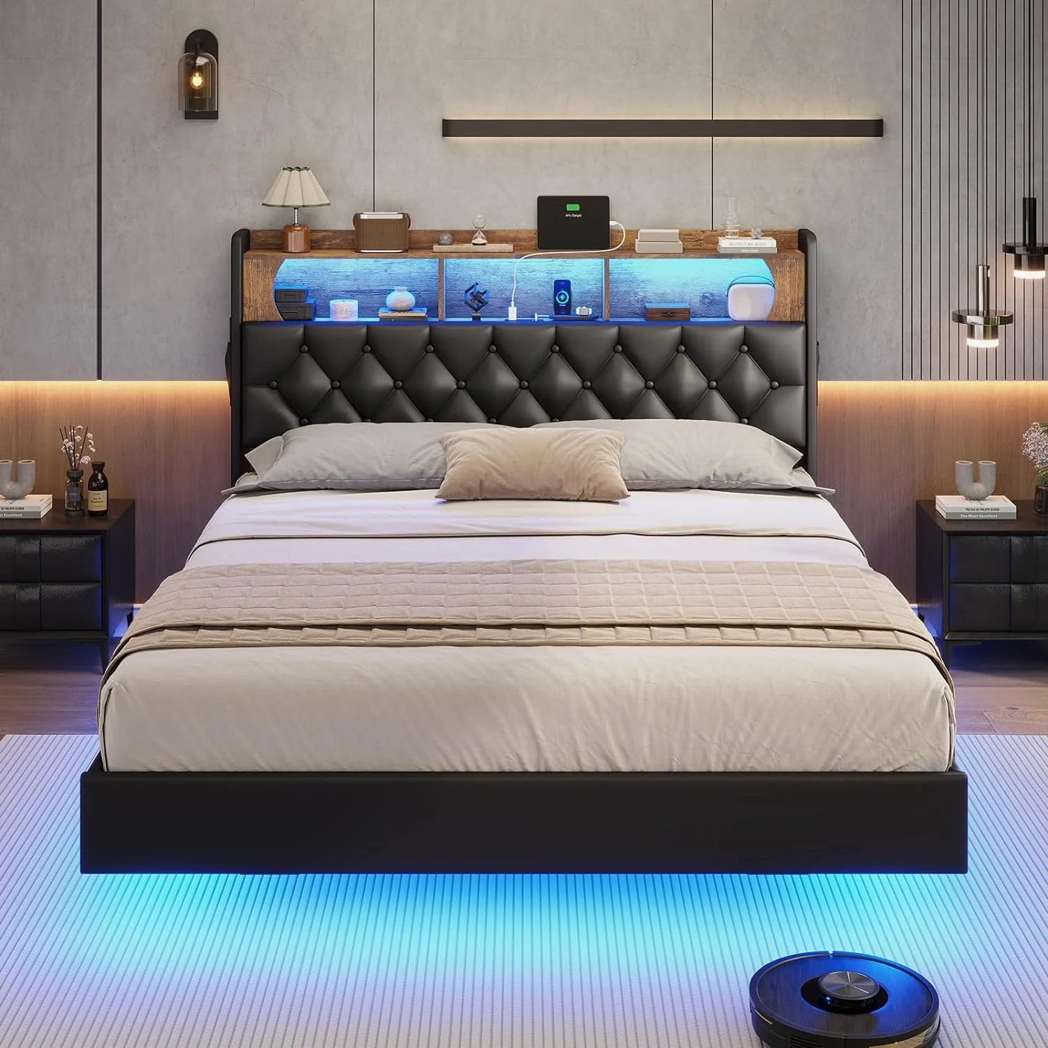 Full Size Floating Bed Frame with LED Light&Charging Station, Upholstered Platform Bed with Storage Headboard, Noise-Free, Black - Curated Treasures Market