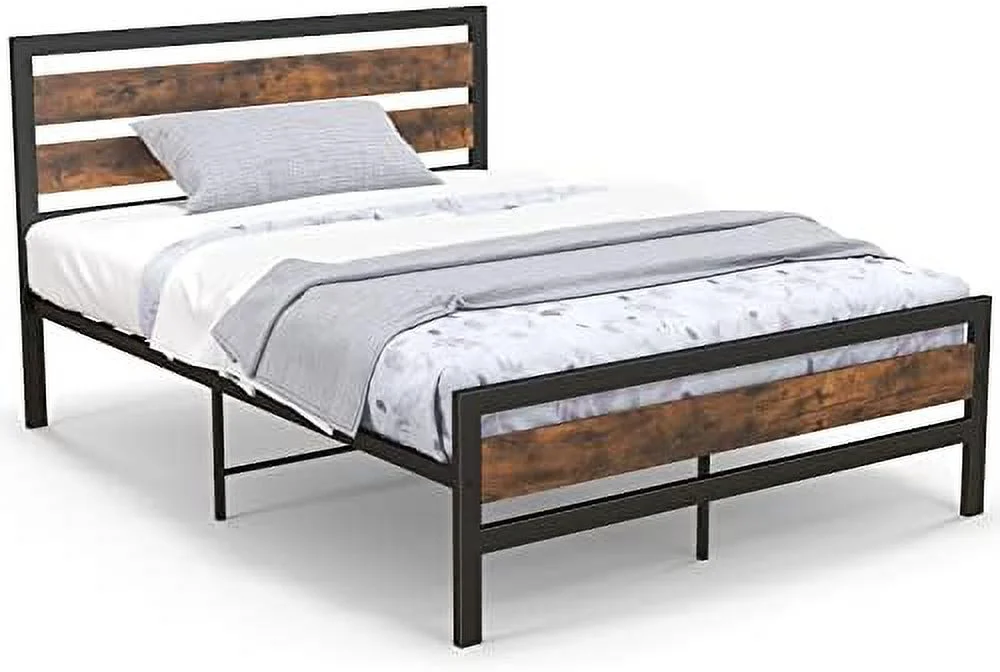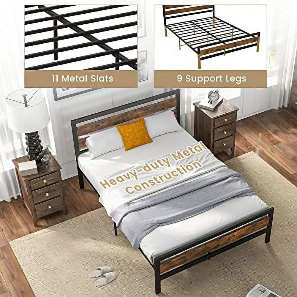 GVJMTKP Queen Metal Bed Frame with Charging Station Industrial Platform Bed with Headboard Heavy-Duty Mattress Foundation Easy Assembly No Box Spring Needed Rustic Brown - Curated Treasures Market