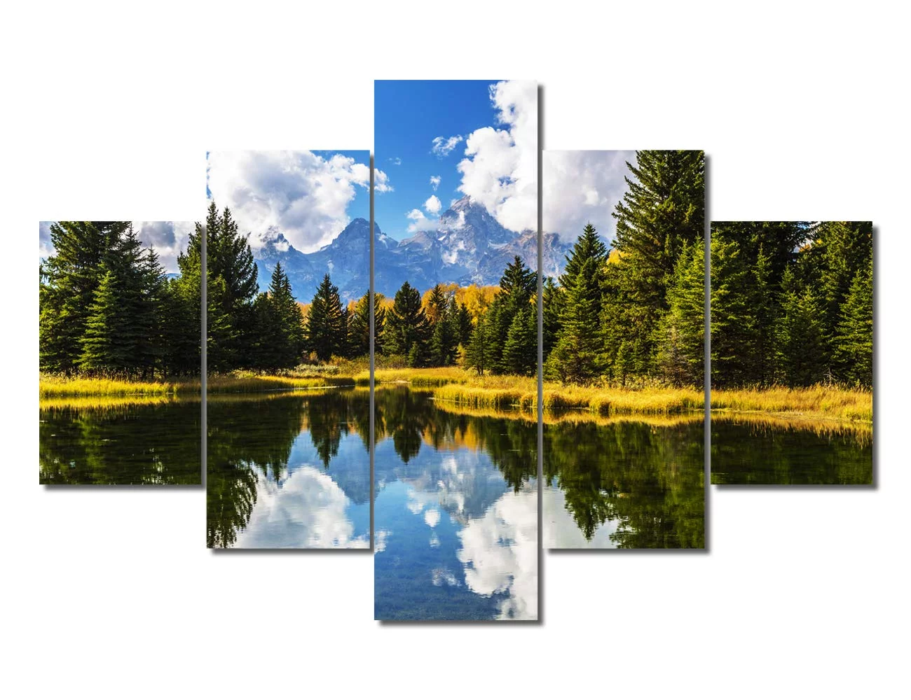 5 Piece Canvas Wall Art for Living Room - Landscape View of Lake and Mountain with Blue Sky, Cloud, Forest Range in Grand Teton National Park USA - Modern Home Decor Stretched and Framed Ready to Hang - Curated Treasures Market