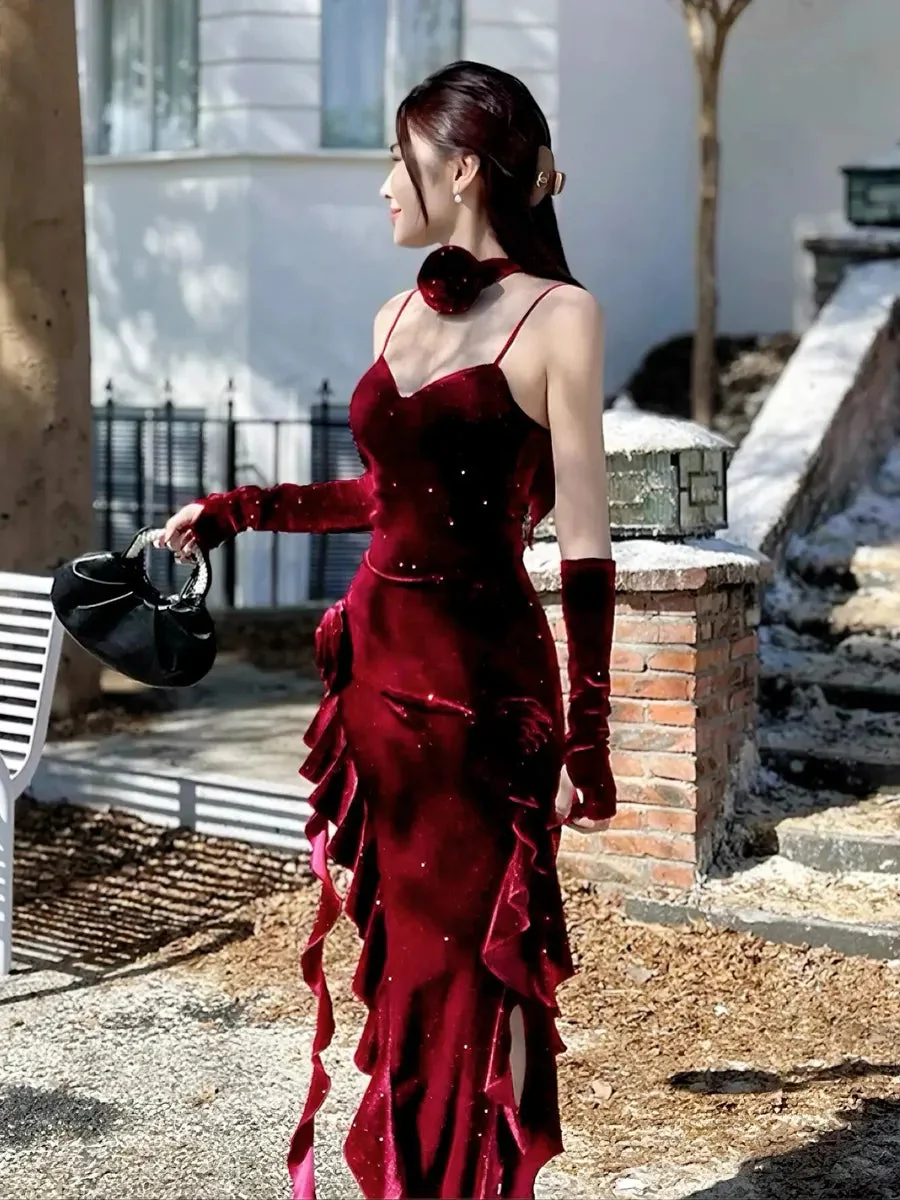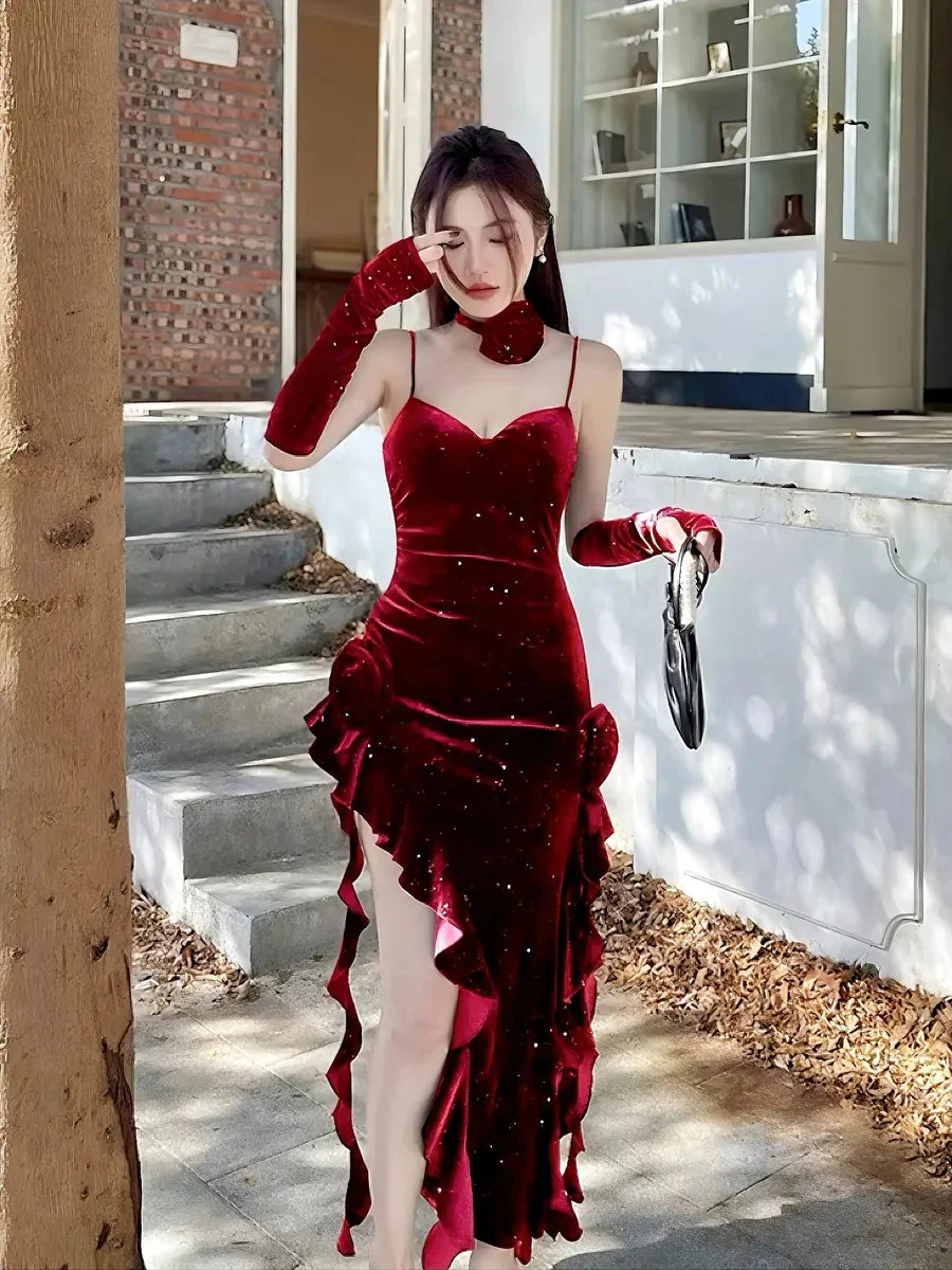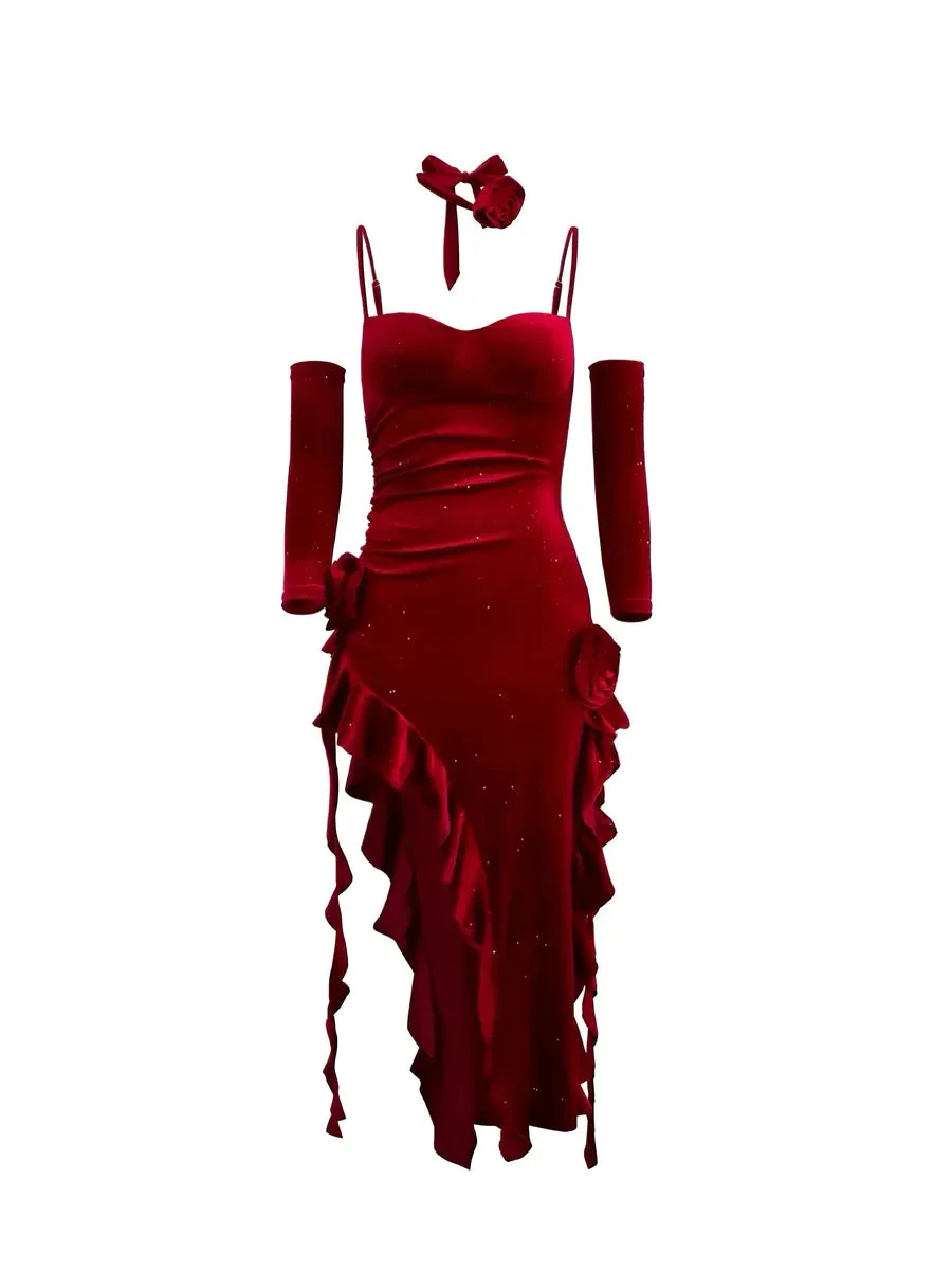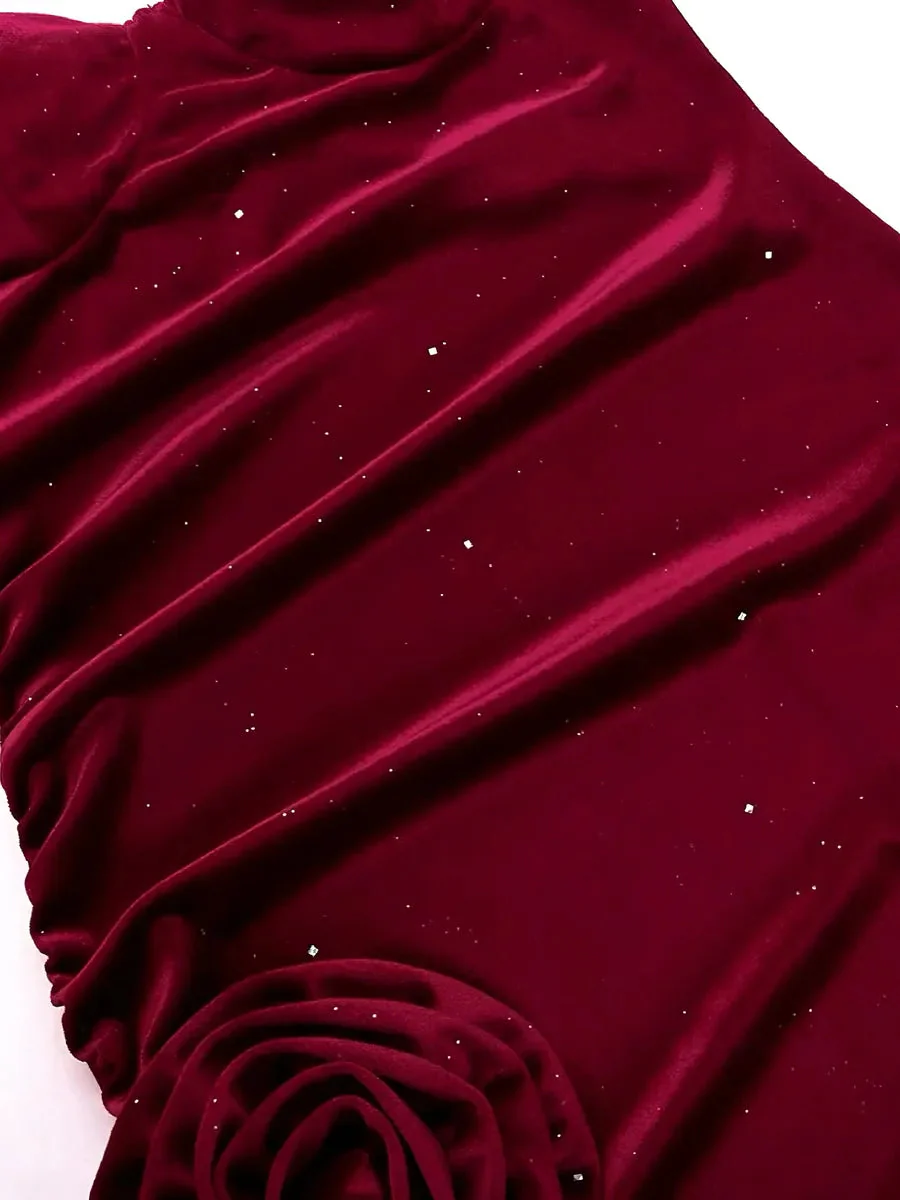 'Red Rose' Holiday Red Hollow Out Lace Velvet Dress