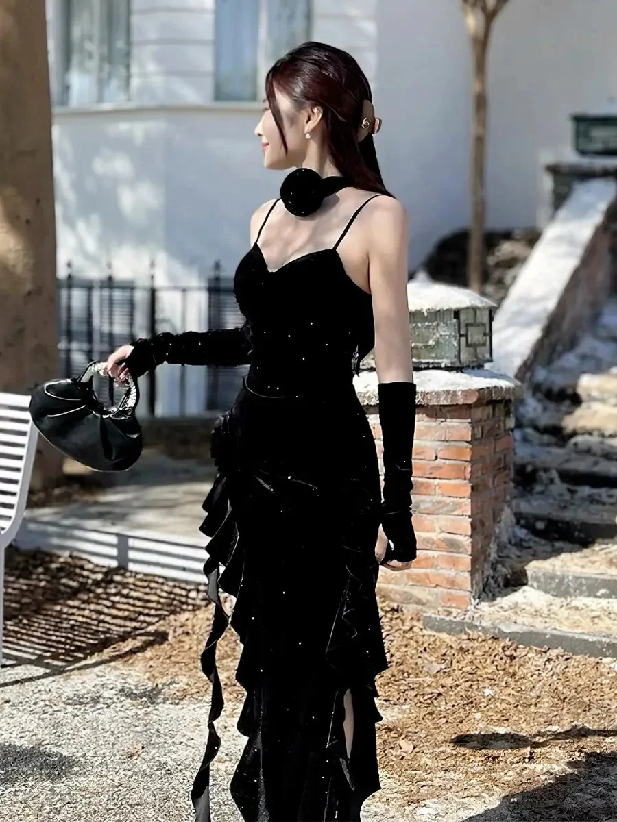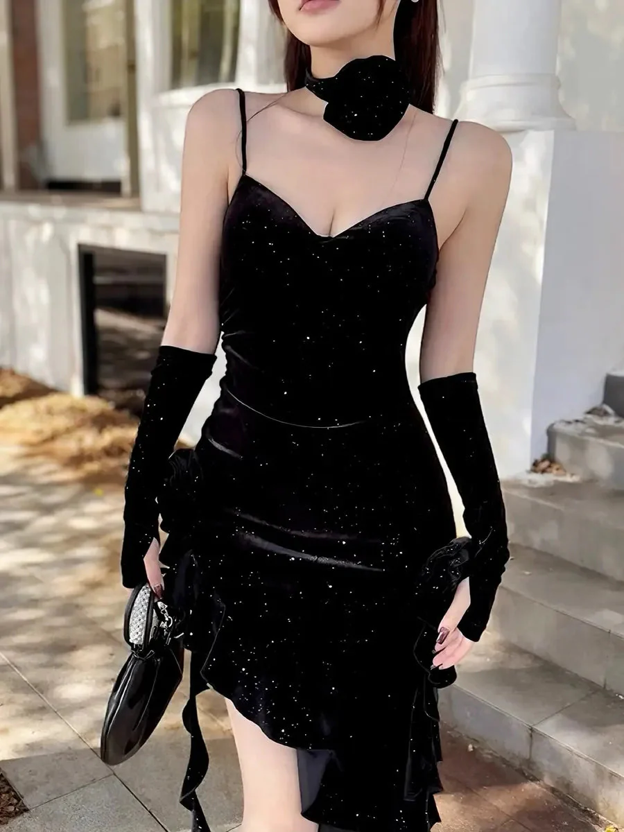 'Supernova' Black Lace Up Irregular Cami Midi Dress