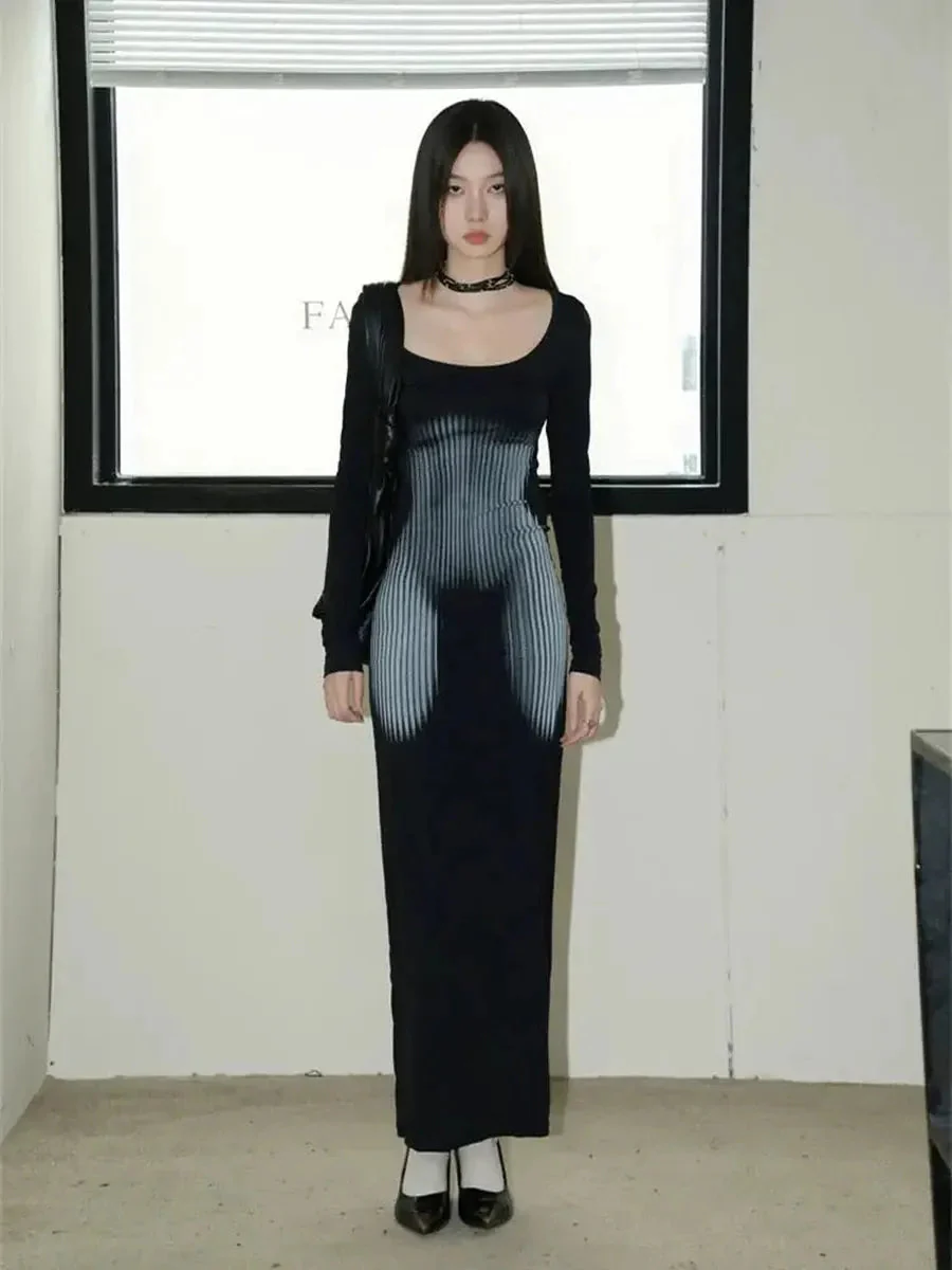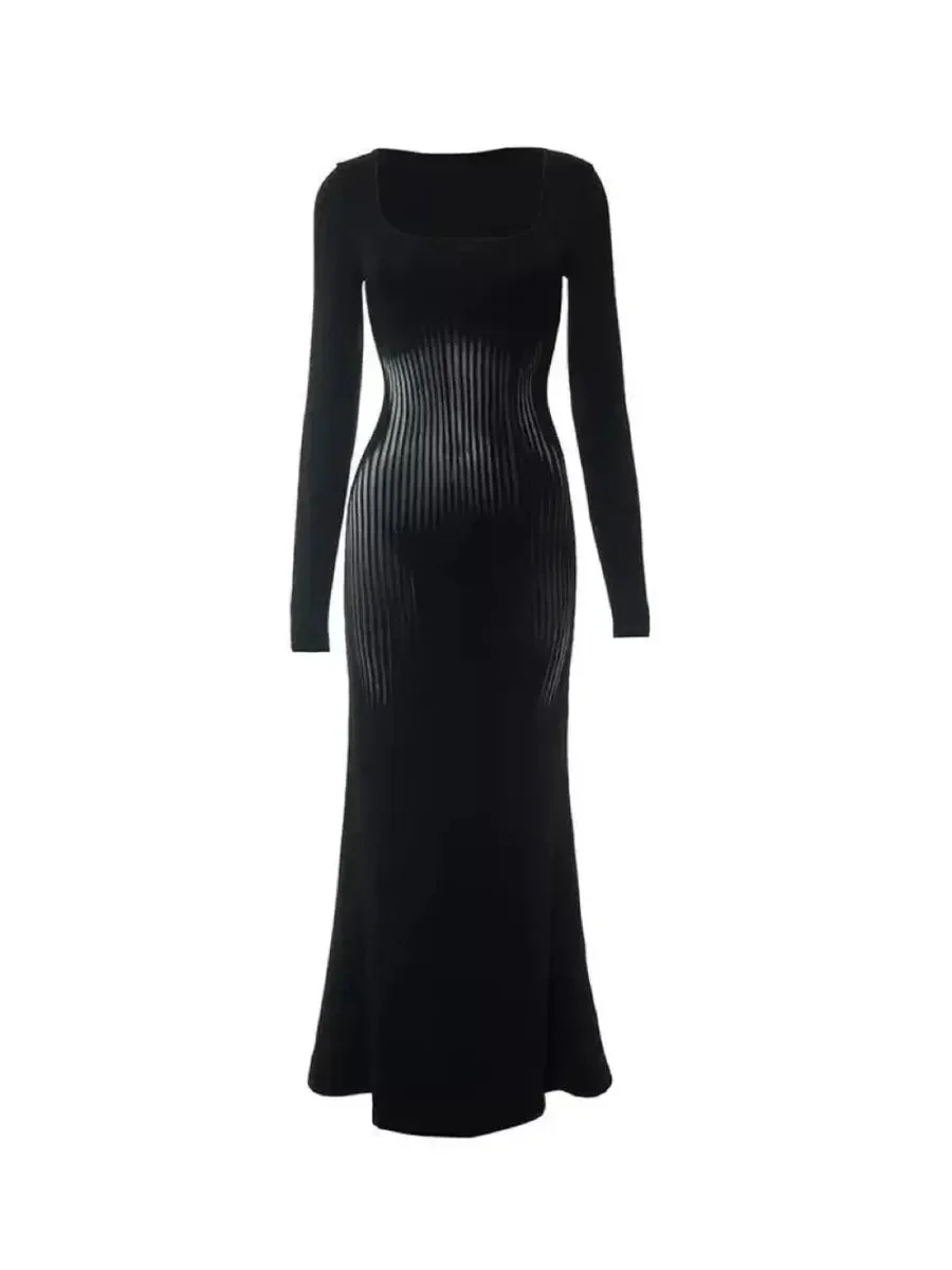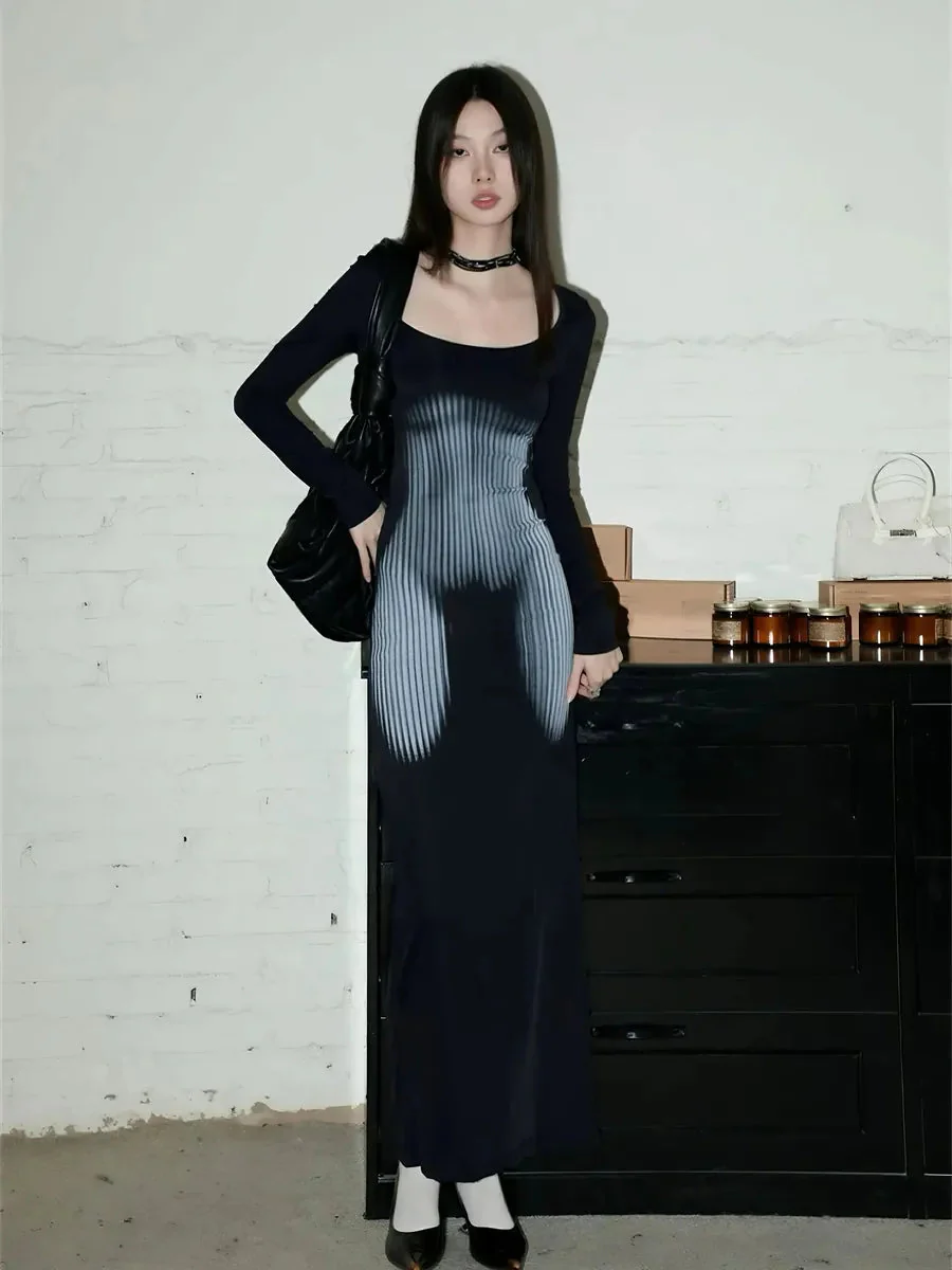 'Body Tea' Dark Sculpture Long Midi Black Sheath Dress