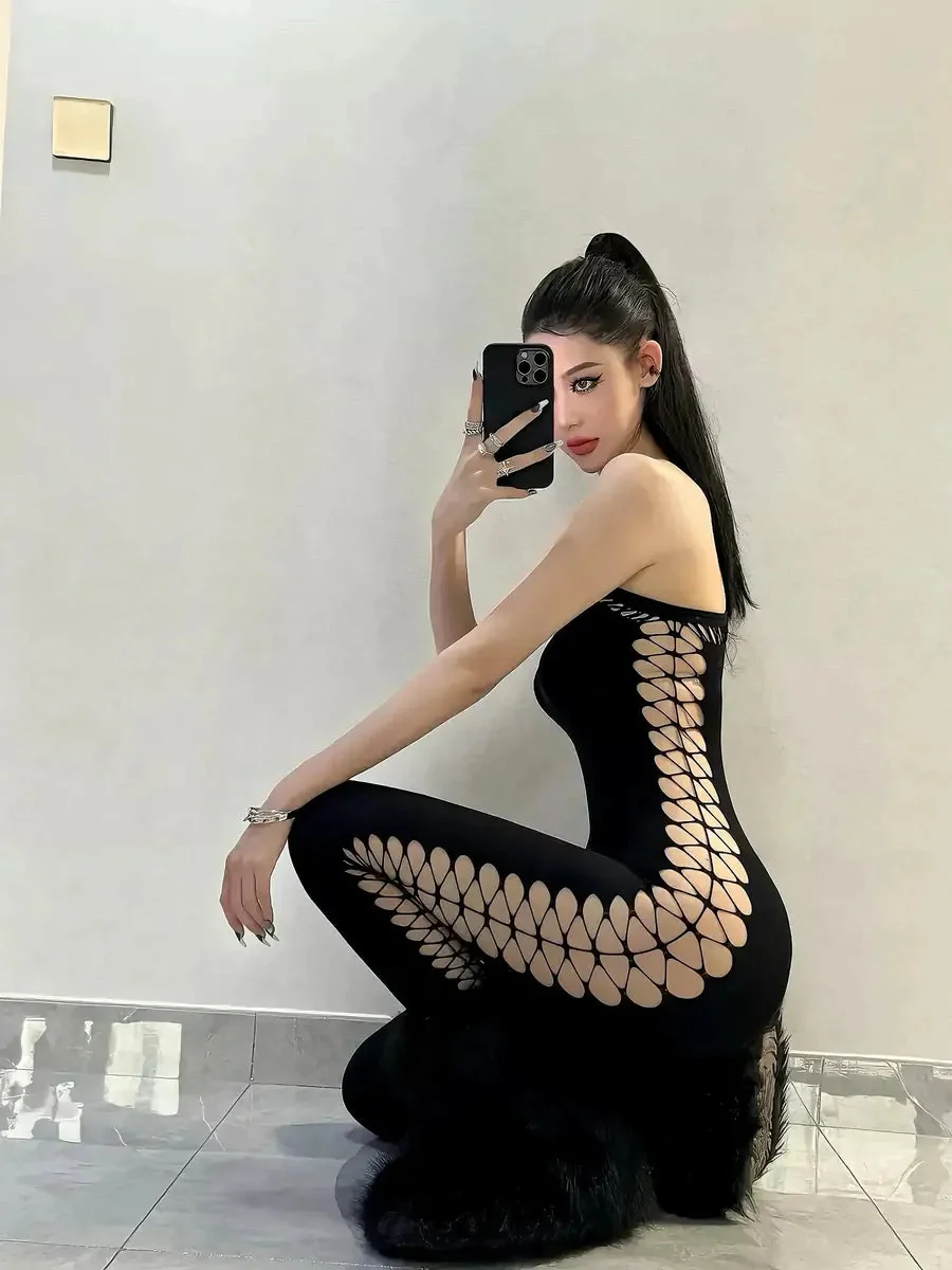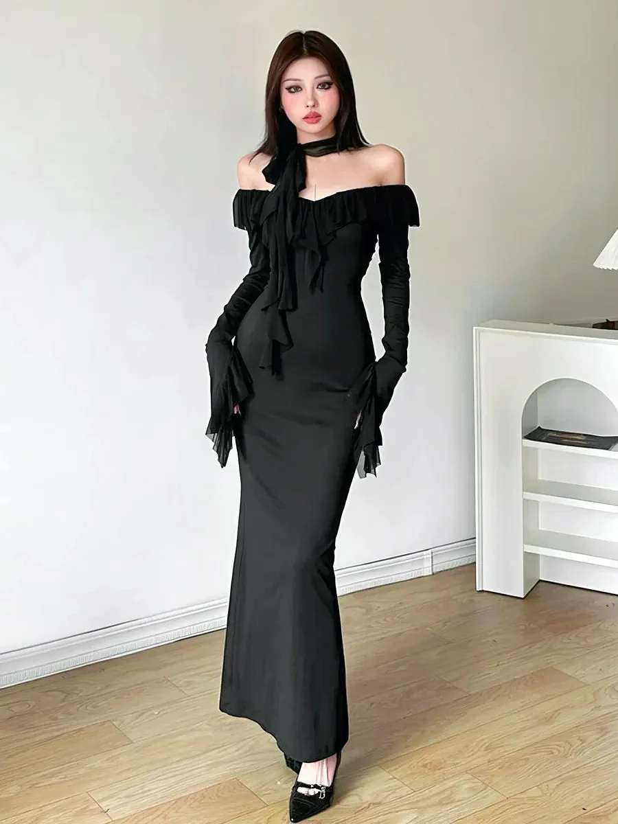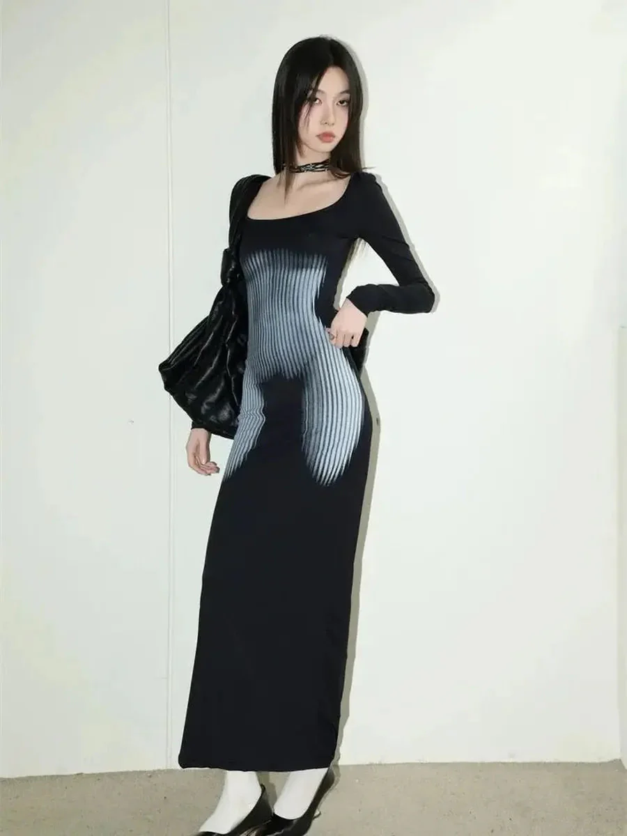 'Body Tea' Dark Sculpture Long Midi Black Sheath Dress